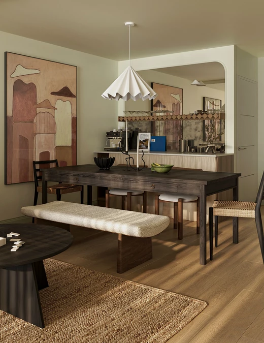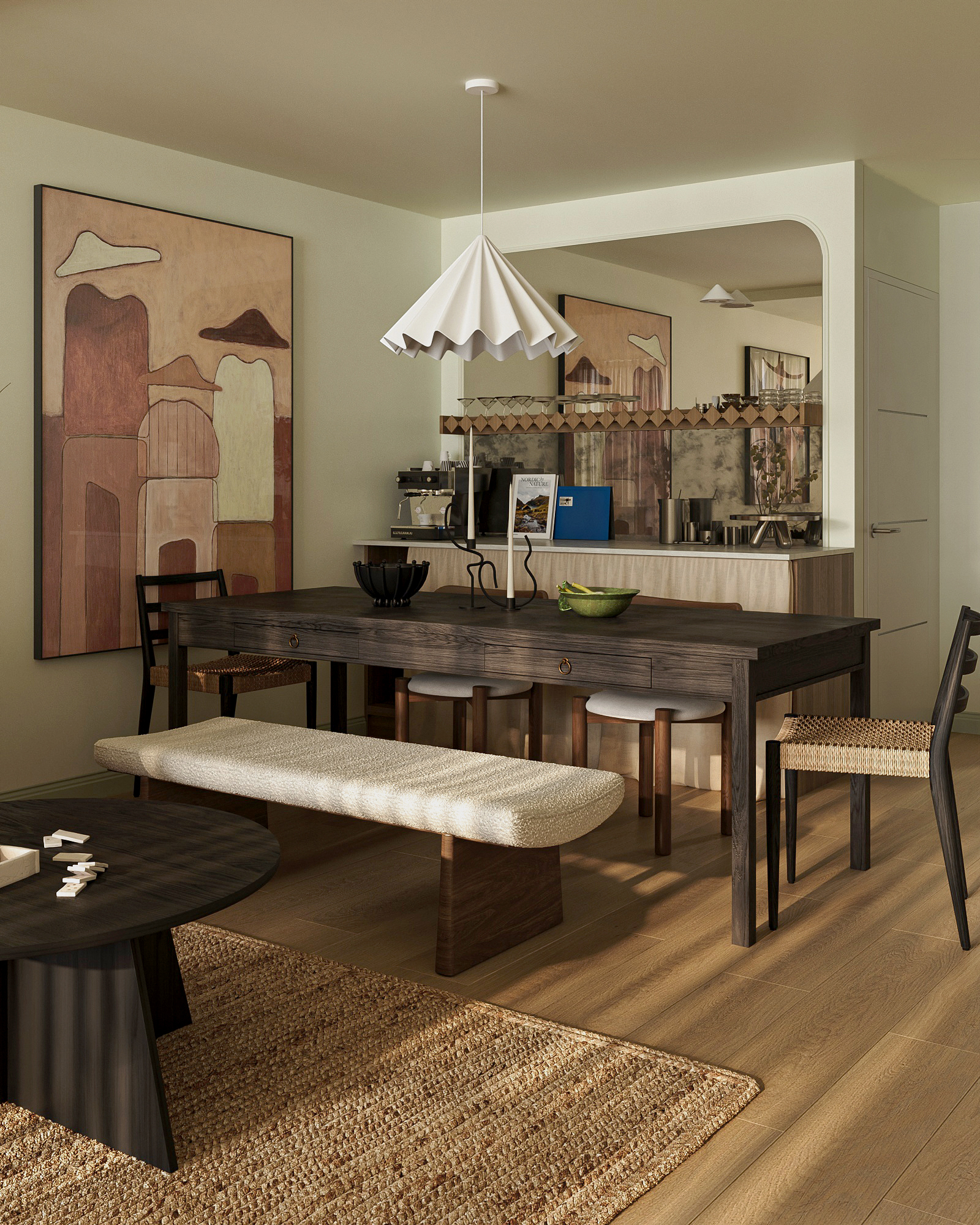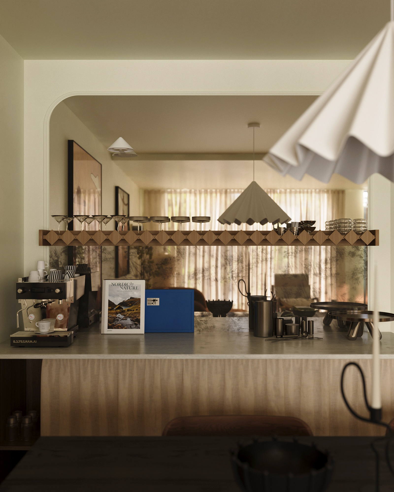 Na życzenie właścicielki projektantki wydzieliły strefę barową jako osobny blok funkcjonalny. Klientce zależało na miejscu, w którym będzie mogła przygotować kawę lub drinka bez opuszczania gości. Zespół zintegrował ten element z jadalnią i skupił się na detalach – lustrze, rzeźbionej półce, zasłonie i kompaktowym podziale przestrzeni.