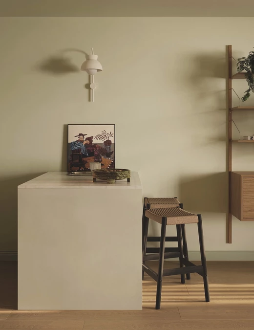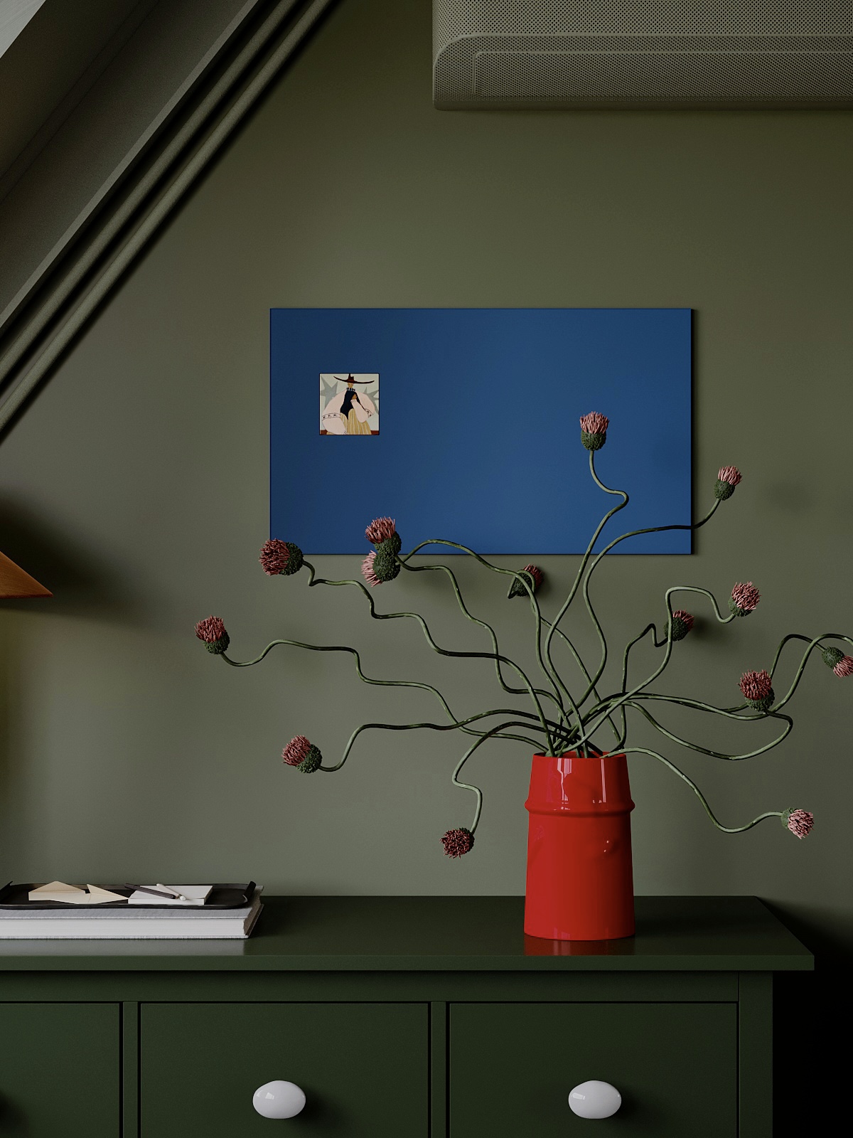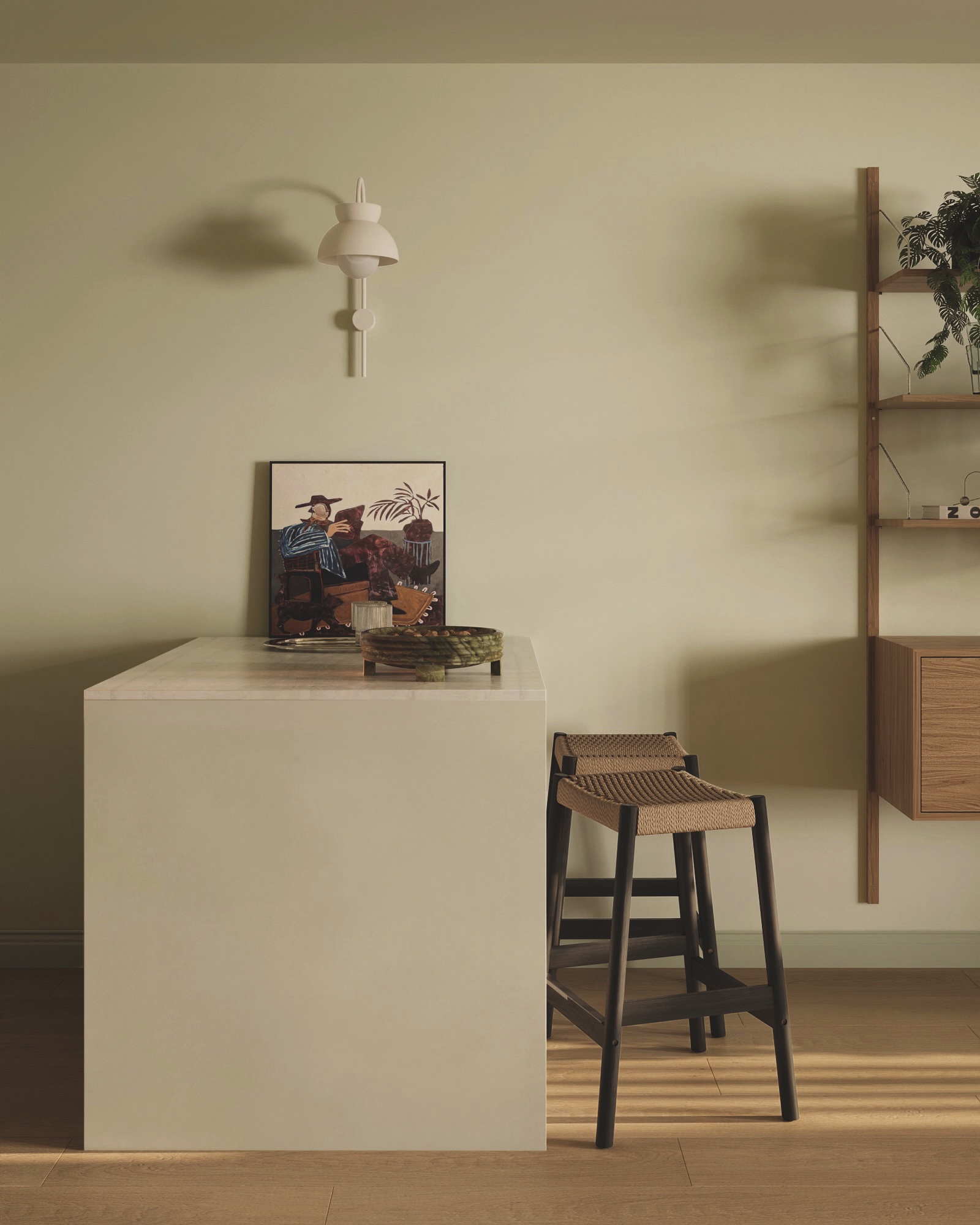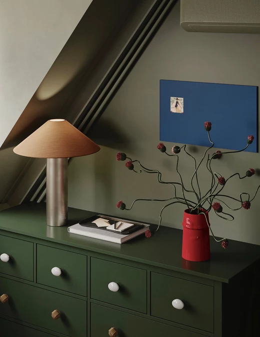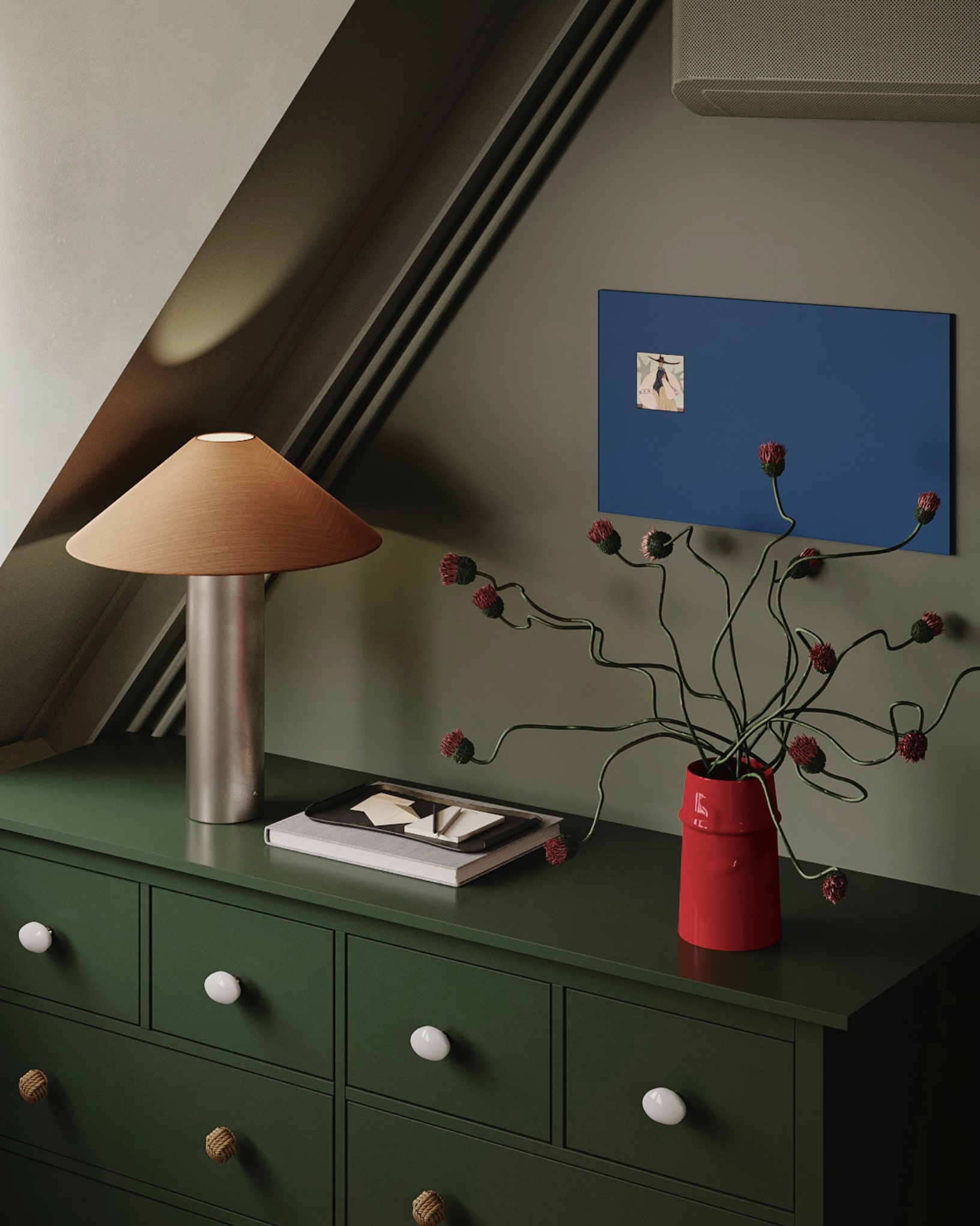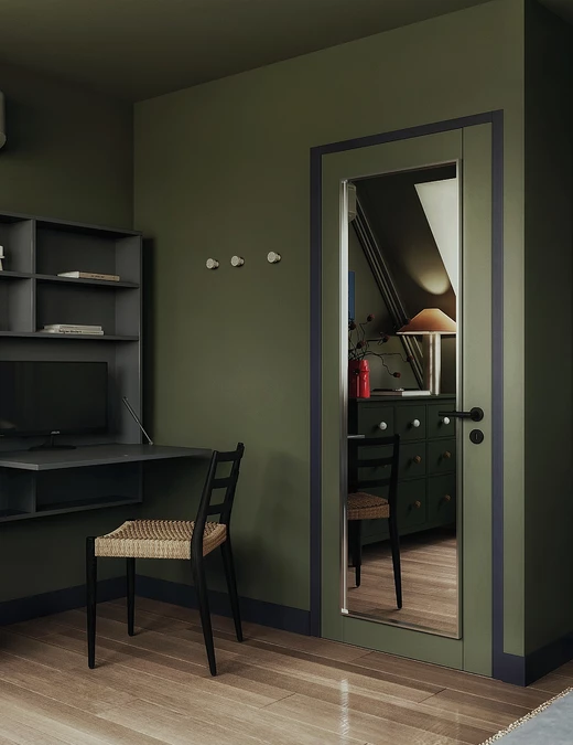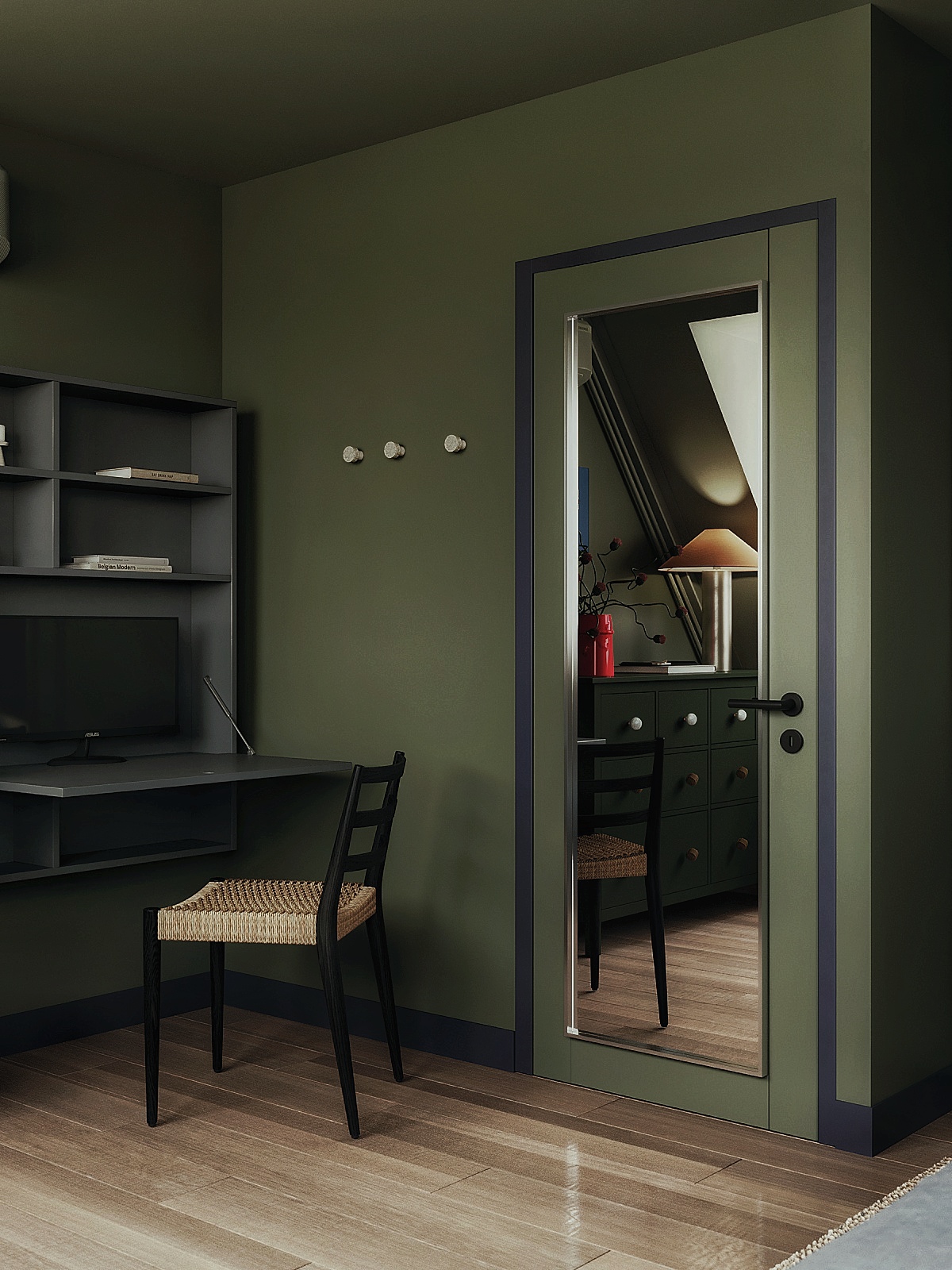 Przestrzeń biurowa została natomiast zaprojektowana z myślą o dyskretnym uzupełnieniu funkcjonalności domu. Pozostaje blisko życia codziennego, ale nie jest w jego centrum. Do tego zieleń ścian i niebieskie akcenty tworzą tło sprzyjające koncentracji.