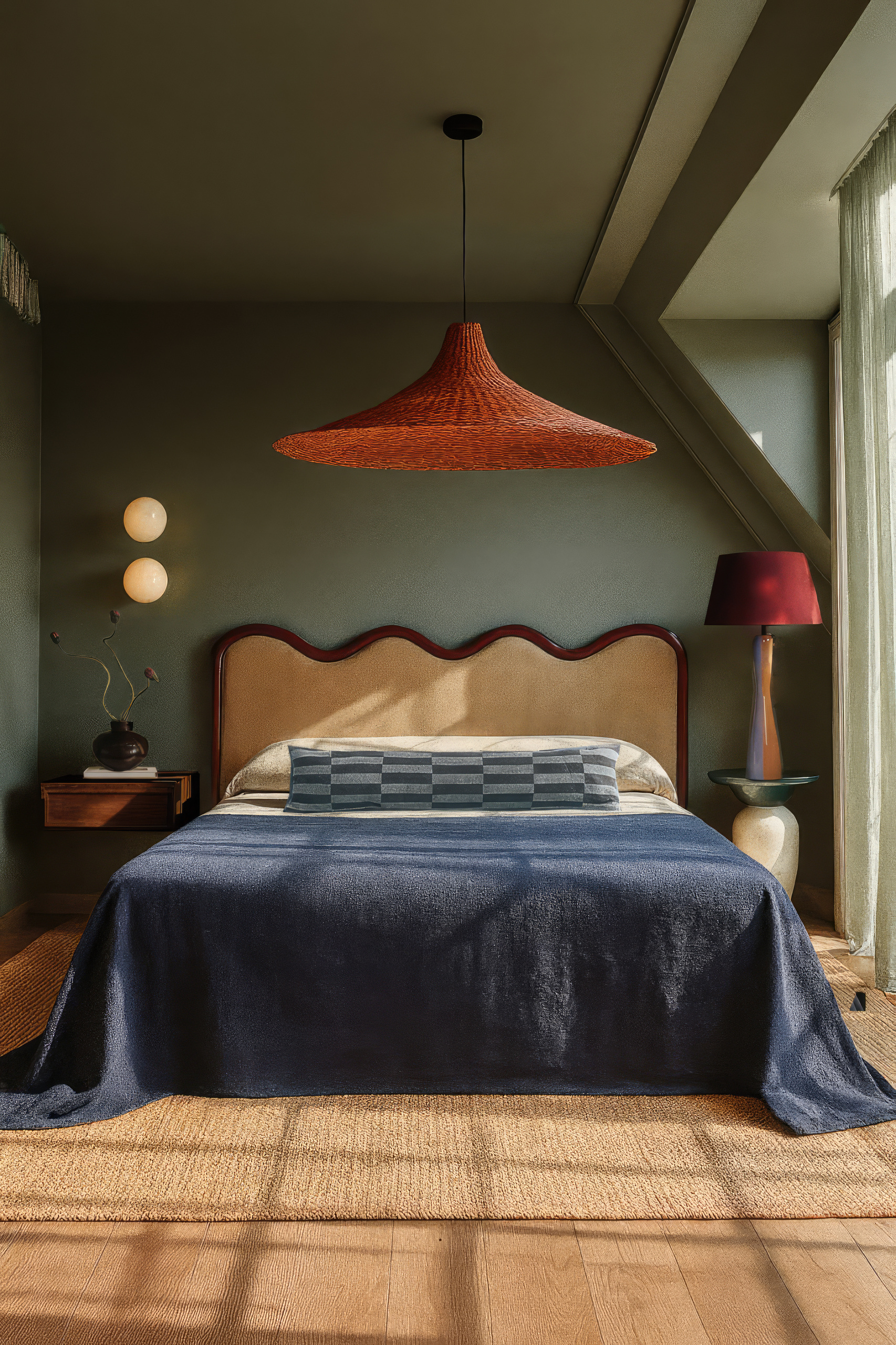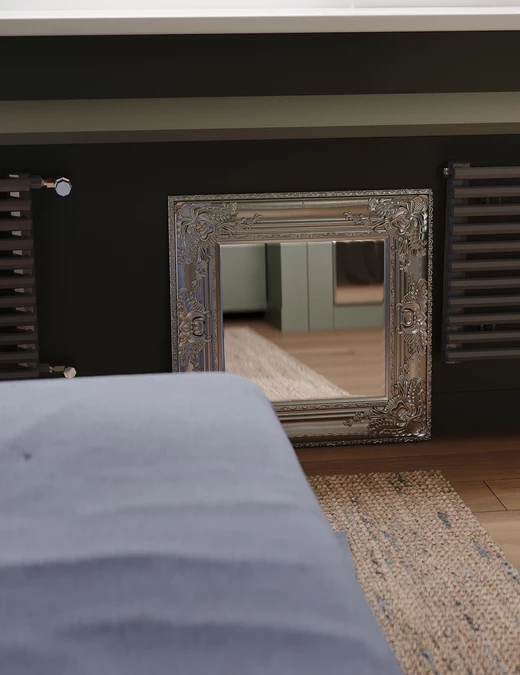 Sypialnia również stanowi ważny element transformacji wnętrza. Projektantki świadomie sięgnęły po ciemny kolor na ściany, mimo, że taki wybór często budzi obawy i uchodzi za ryzykowne rozwiązanie. Ale na ciemnym tle dobrze widoczne stają się tekstylia i światło, czy różne akcenty kolorystyczne.