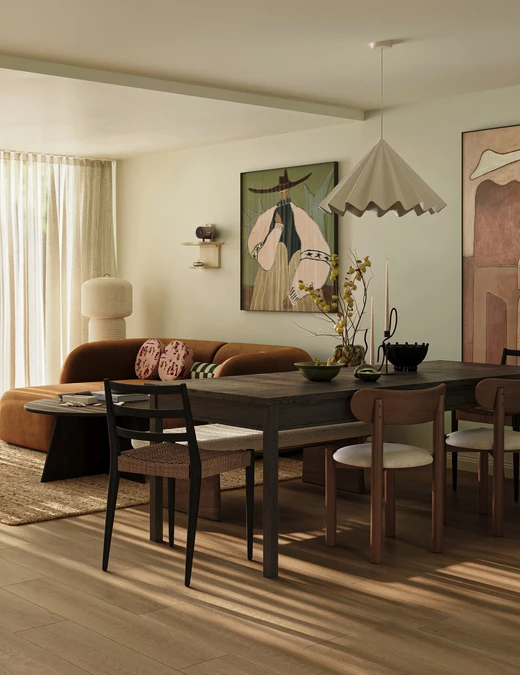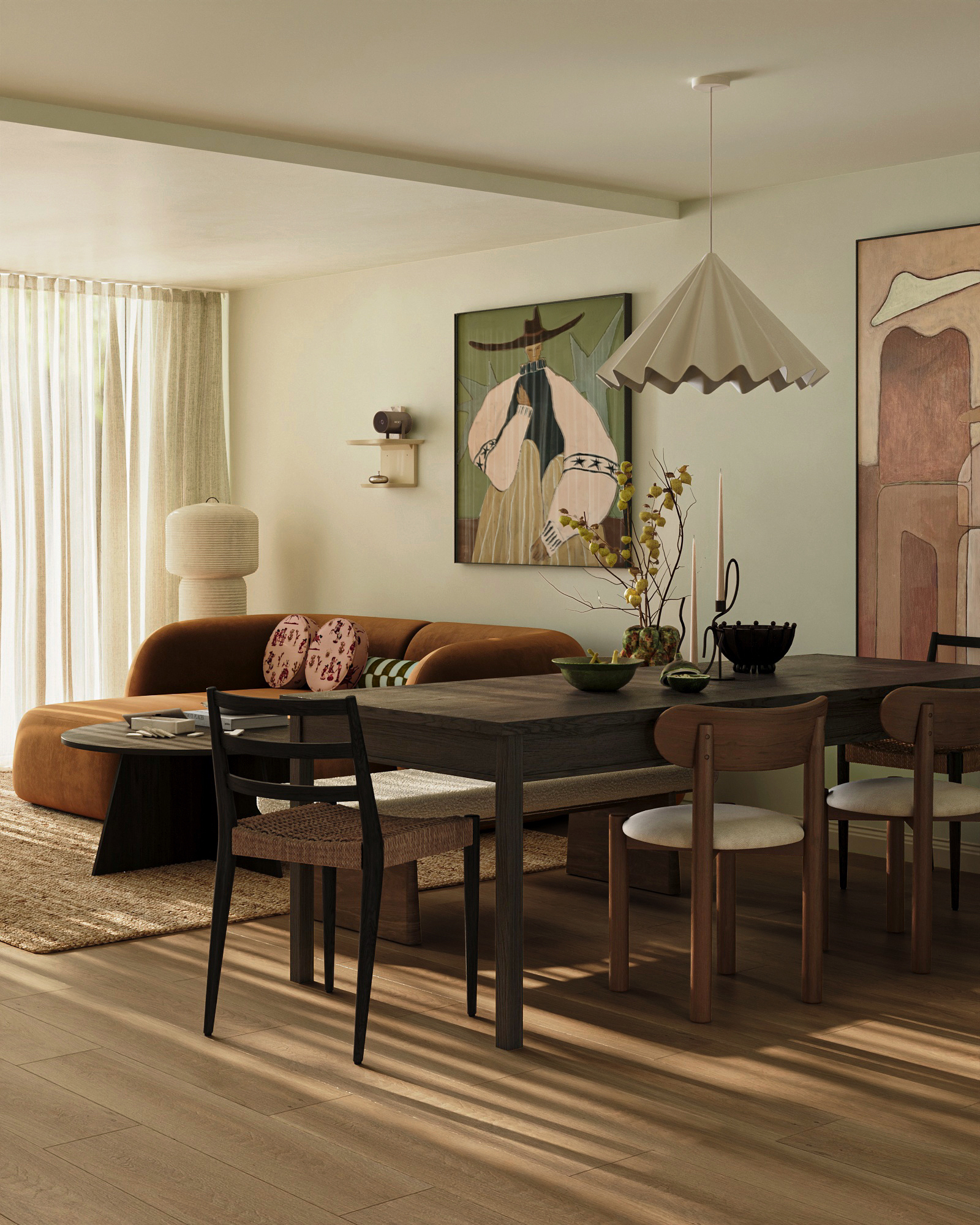 Istotna zmiana dotyczyła funkcji pomieszczenia, które wcześniej pełniło rolę strefy dziecięcej. Projektantki przesunęły środek ciężkości domu i stworzyły tu duży salon – z dużym stołem, strefą barową i przestrzenią do długich rozmów po kolacji. Zachowały stary stół, tylko lekko go odświeżyły. Wybrały dla niego ciemniejszy kolor, dodały nowe krzesła i ławę. A całość uzupełniły własnymi akcentami.