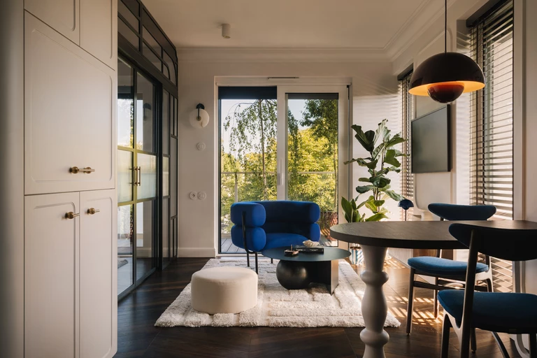 W saloniku znalazło się miejsce na stół, przy którym właścicielka może zarówno spożywać posiłki, jak i pracować przy komputerze. Oświetla go ikoniczna lampa „Flowerpot” projektu Vernera Pantona. Strefa wypoczynkowa z obłym fotelem od polskiej marki Noo.ma w kolorze ultramaryny oraz stolikiem kawowym z rodzimej firmy Salak Studio stanowi idealne miejsce do relaksu.