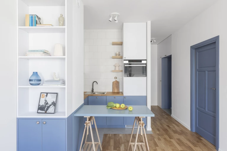 Lokal jest niewielki, ale niezwykle funkcjonalny. Miał być przeznaczony na wynajem, dlatego inwestorom zależało na wykreowaniu uniwersalnej, jasnej przestrzeni. Autorzy projekty postanowili dodatkowo „ubrać ją” w charakterystyczną barwę. Wybór padł na kolor niebieski, na który pomalowano sosnowe drzwi oraz wnęki wokół nich. Tej samej barwy użyto do pomalowania nietypowego, łukowego zagłówka w sypialni. Dominuje tu także biel.