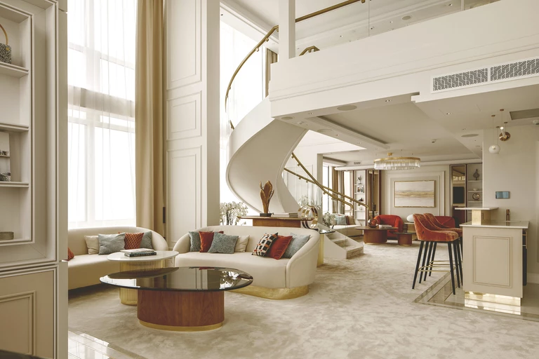 Na pierwszej kondygnacji apartamentu znajduje się część dzienna z wygodnymi sofami, na strefa relaksu z kinem domowym i fortepianem, sala konferencyjna, kuchnia oraz toaleta. Druga kondygnacja to przestrzeń o nieco bardziej prywatnym charakterze. Mieszczą się tu dwie duże sypialnie – każda z nich ma prywatną garderobę oraz łazienkę z wanną i prysznicem.