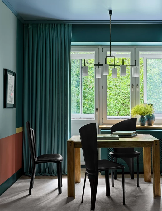 Przy oknie znajduje się duży, holenderski stół marki Repeat Story, który pełni rolę stołu zarówno jadalnianego, jak i roboczego. Klasyczną formę stołu przełamują czarne krzesła vintage z lat 80. o niebanalnym kształcie i unoszący się nad stołem włoski żyrandol.