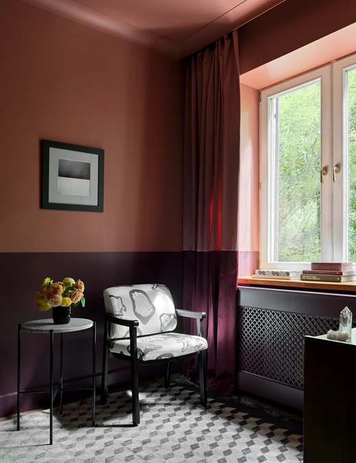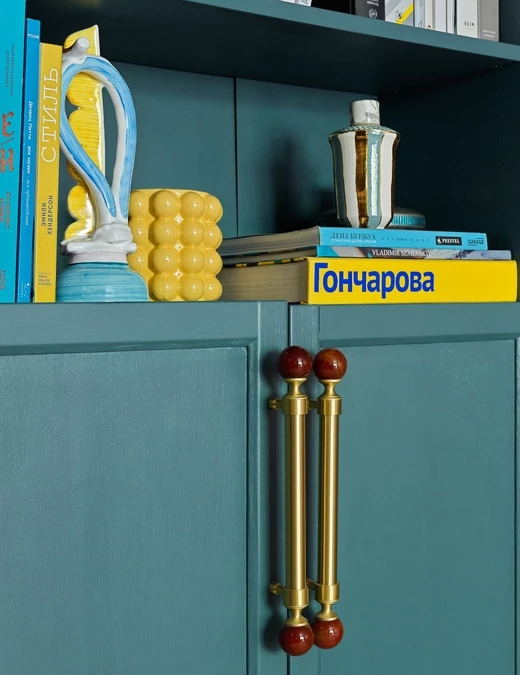 Ozdobą salonu są dwa fotele vintage odświeżone poprzez nową tapicerkę marki Dekar. Na szerokiej komodzie Ethnicraft wyróżniono m.in. kolekcję czarno-białej ceramiki (wazony Ceramuma i Eleny Aleksenko), zabytkowe wazony z pchlich targów, lampę zaprojektowaną przez Joe’go Pontiego, a także sitodruk autorstwa Natalii Vilvoskayi.