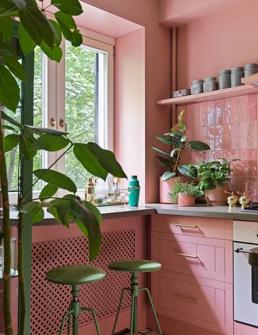 W celu nadania kuchni przestronności Daria zdjęła górne szafki i zastąpiła je wąskimi półkami. Wzrok przyciąga parapet, który został wykonany z tego samego materiału, co blat kuchenny. Jest przy tym szerszy niż przeciętny parapet, dzięki temu powstała dodatkowa przestrzeń, przy której można zjeść śniadanie czy popracować na laptopie.
