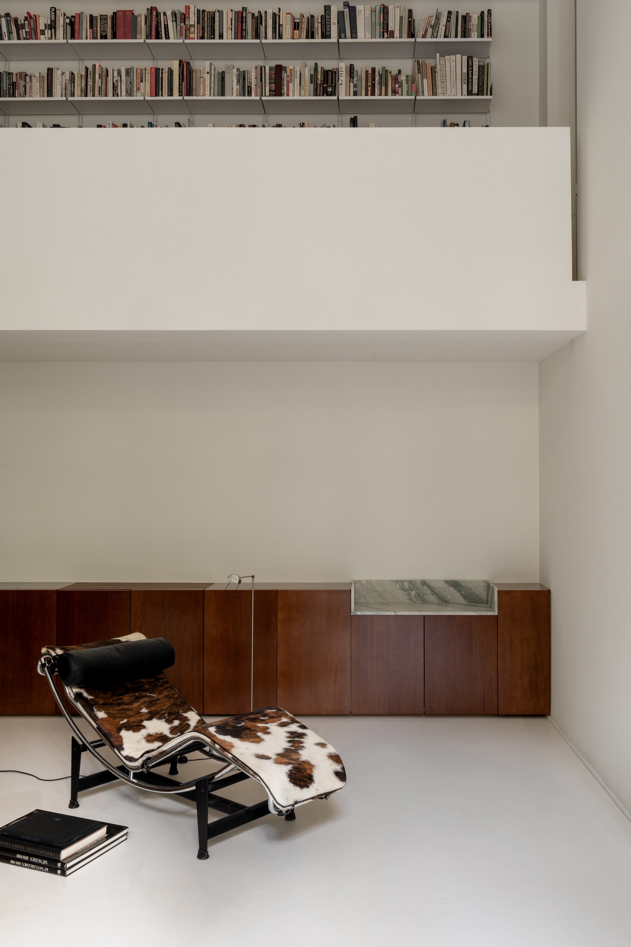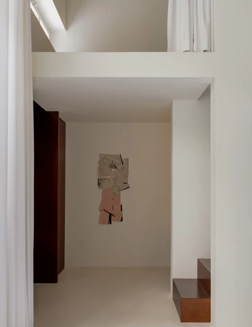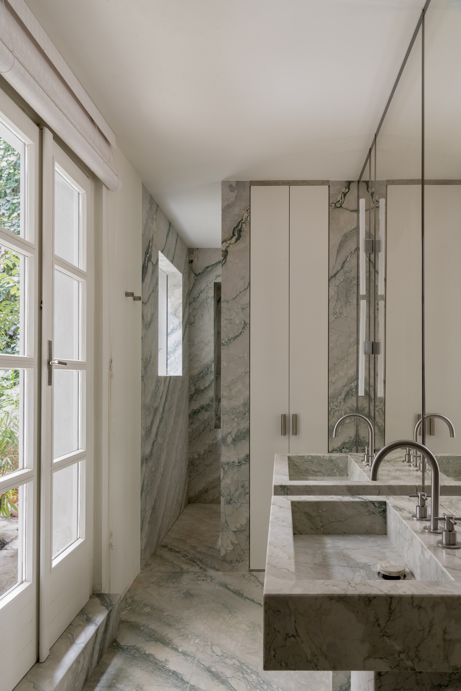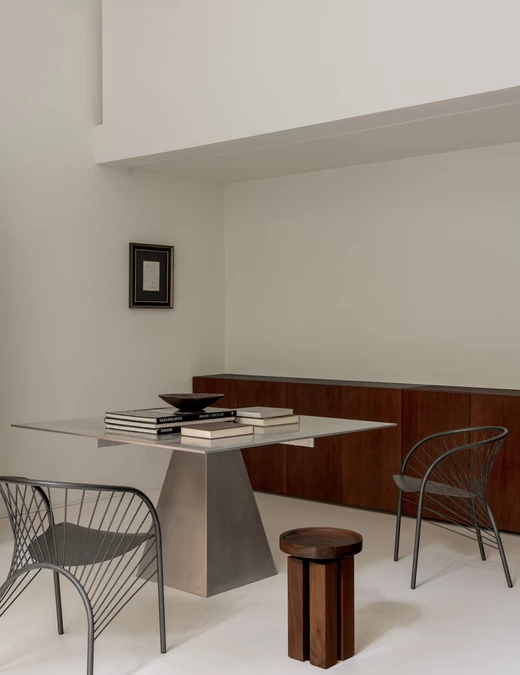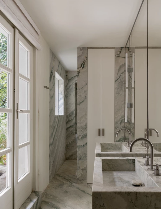 Estetyka domu opiera się na subtelnych kontrastach – białe ściany i posadzki tworzą tło dla marmuru cipollino apuano o chłodnych, zielonkawych żyłkach, orzechowego drewna i stali szczotkowanej. To zestawienie faktur i tonów buduje charakterystyczny dla studia ciepły minimalizm, w którym światło staje się najważniejszym elementem kompozycji.