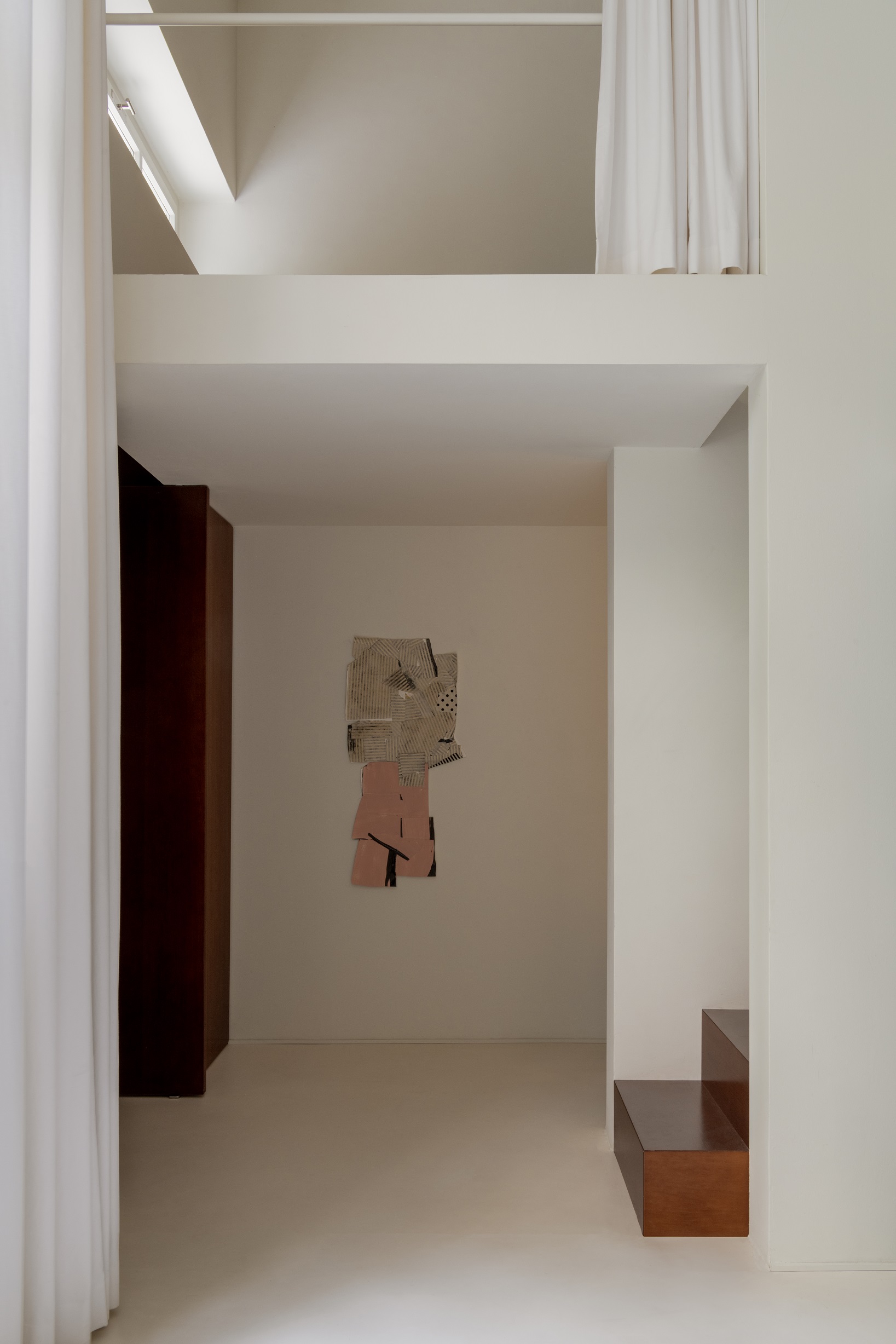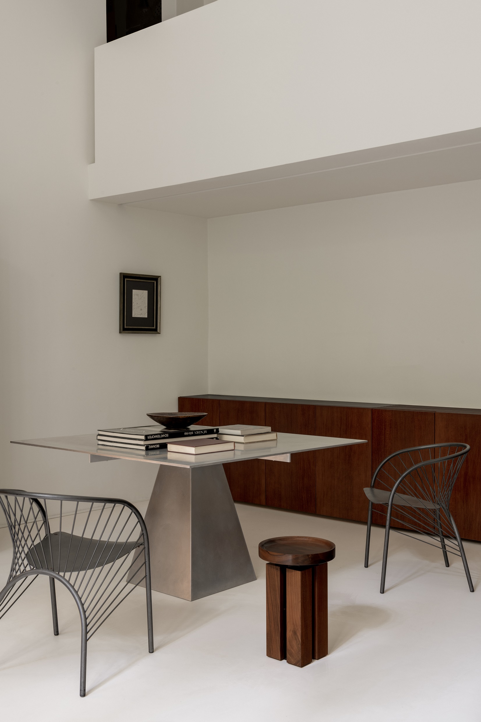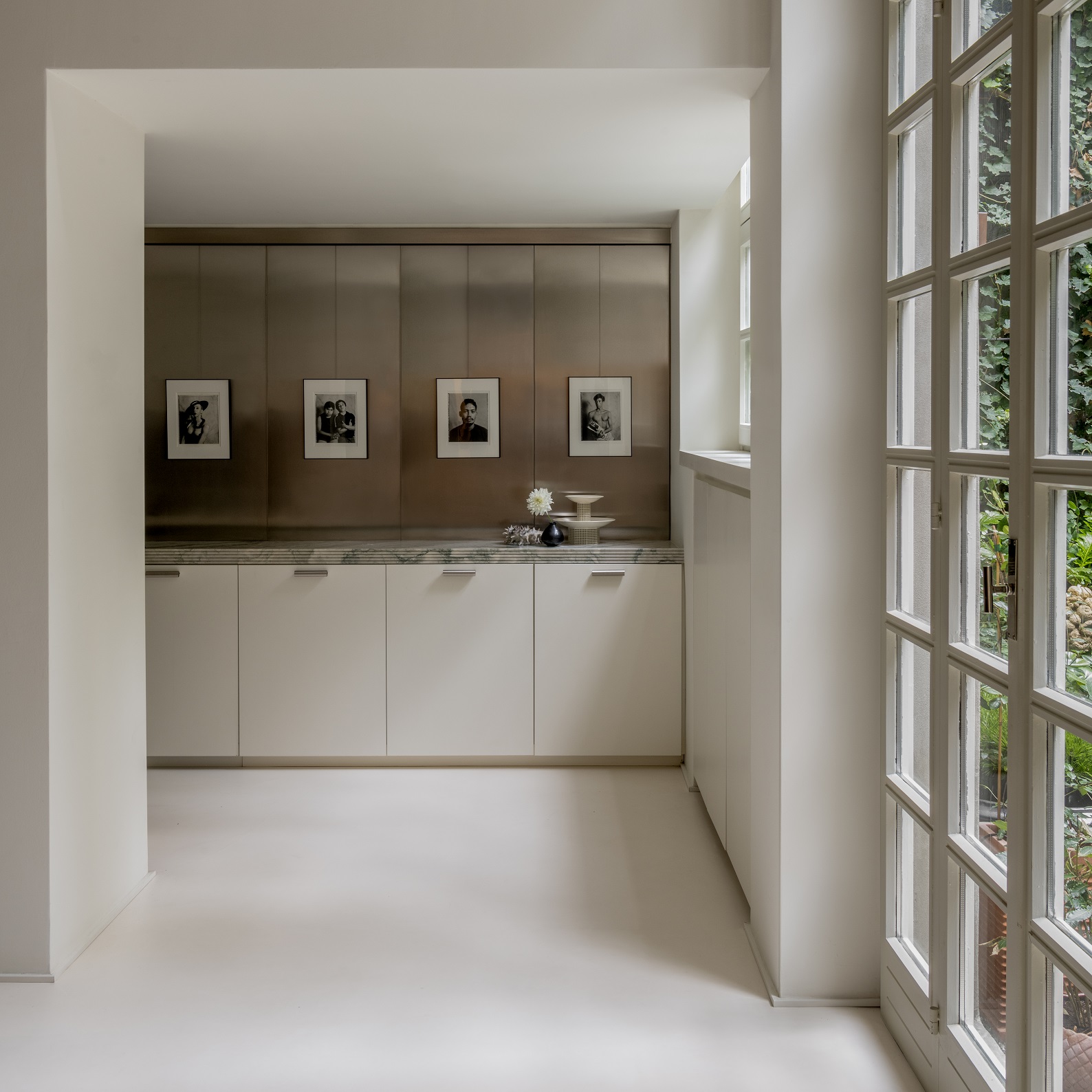 Estetyka domu opiera się na subtelnych kontrastach – białe ściany i posadzki tworzą tło dla marmuru cipollino apuano o chłodnych, zielonkawych żyłkach, orzechowego drewna i stali szczotkowanej. To zestawienie faktur i tonów buduje charakterystyczny dla studia ciepły minimalizm, w którym światło staje się najważniejszym elementem kompozycji.