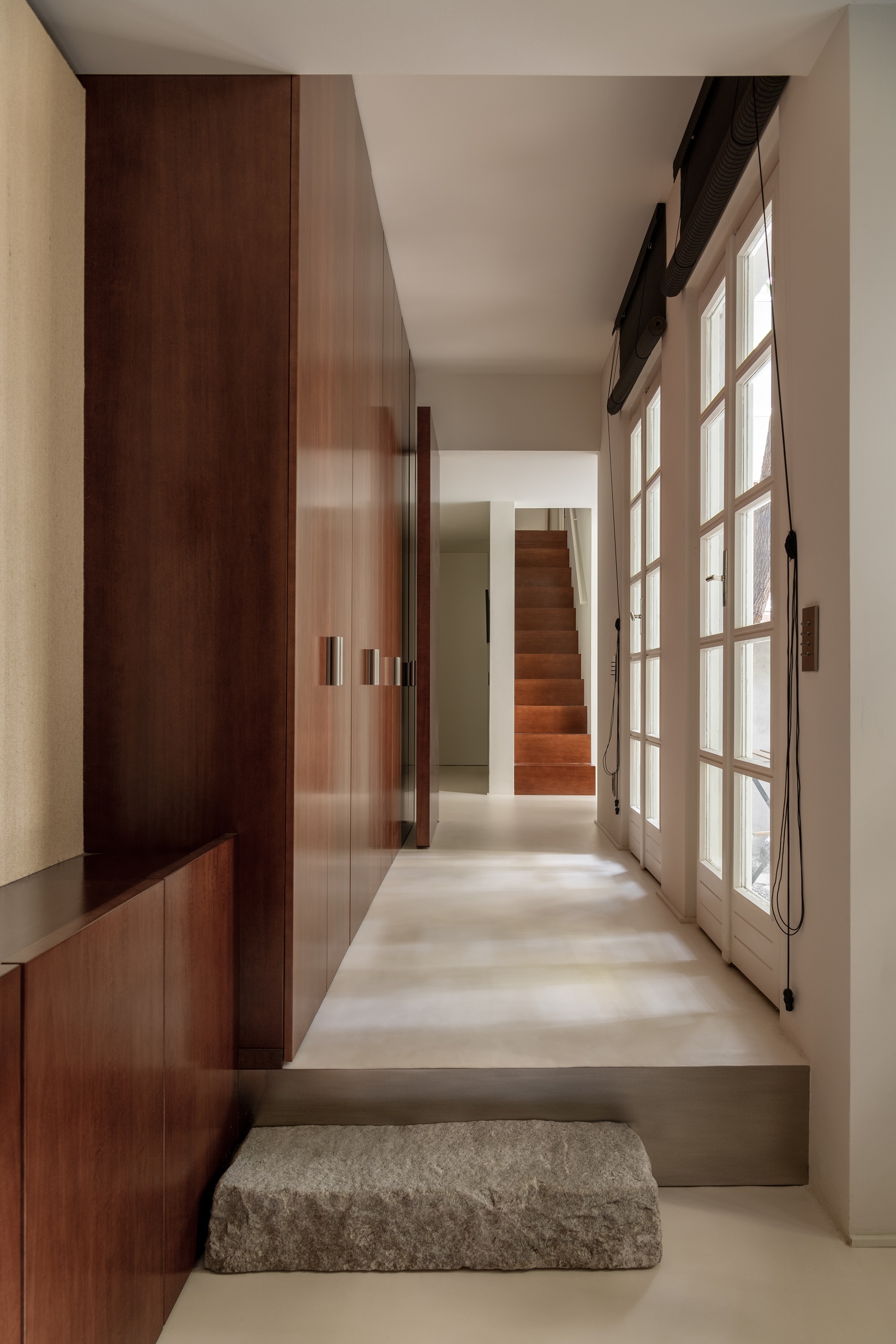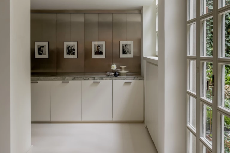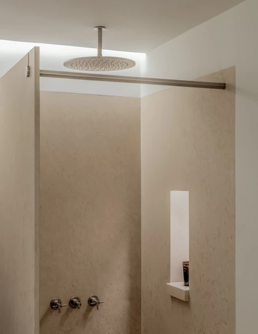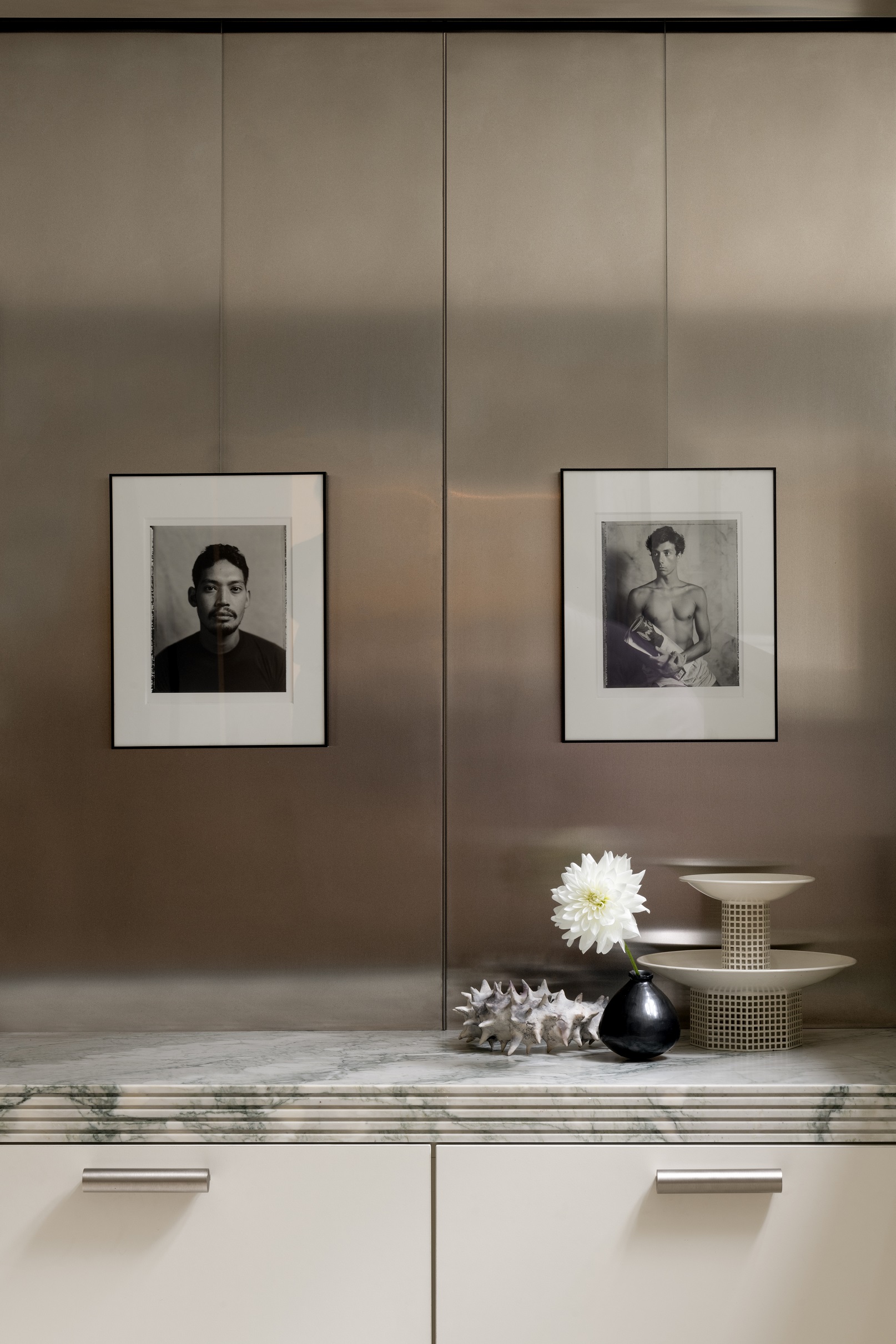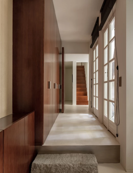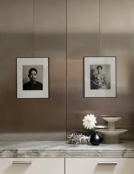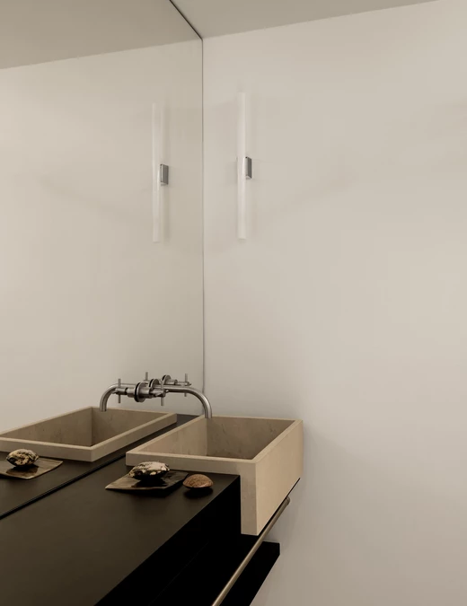 Każdy detal został przez projektantów przemyślany i wykonany na zamówienie – od zabudowy w korytarzu, która płynnie przechodzi w garderobę, po kuchnię łączącą marmur i stal. W łazience, również z marmuru, architekci zachowali tę samą ideę prostoty.