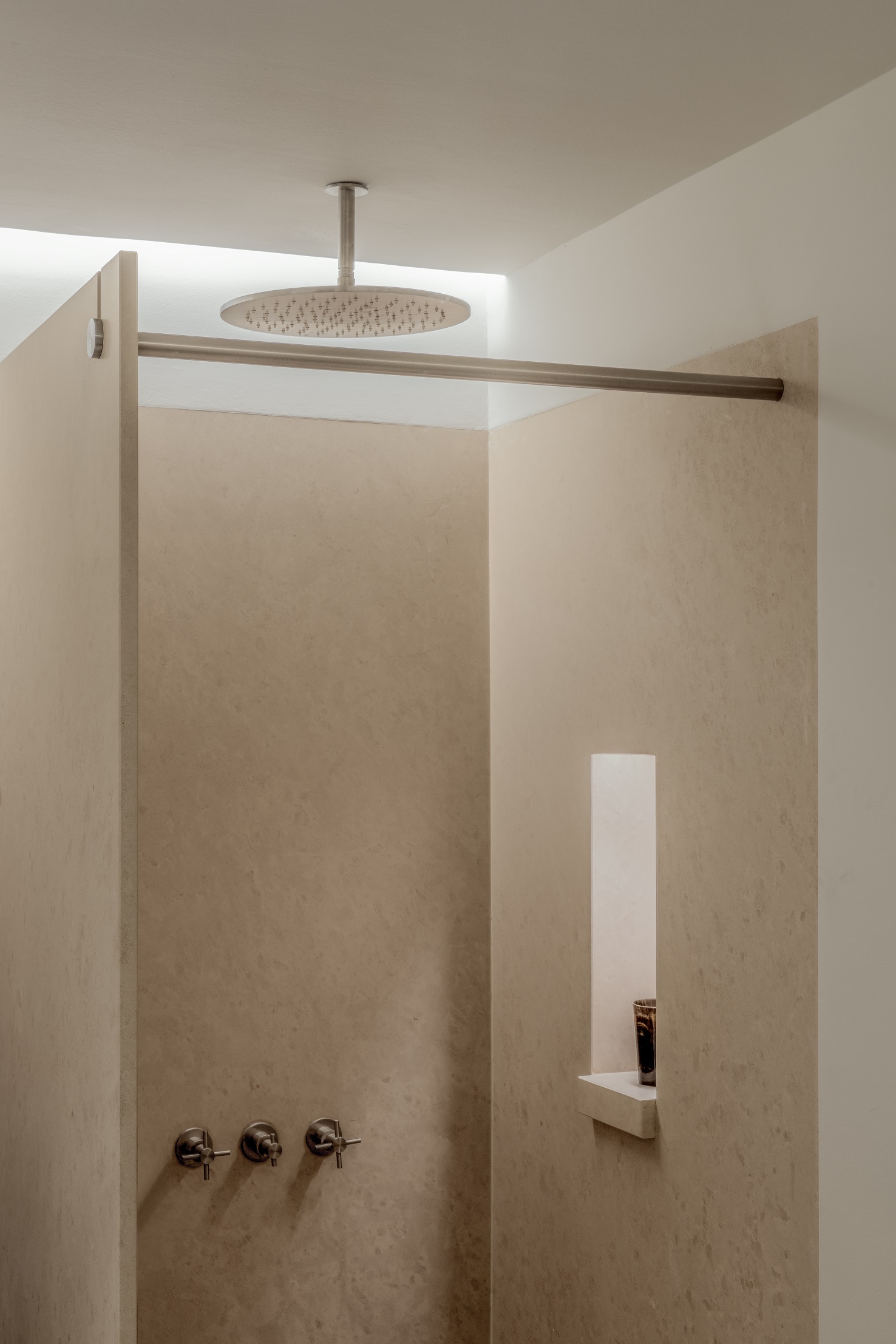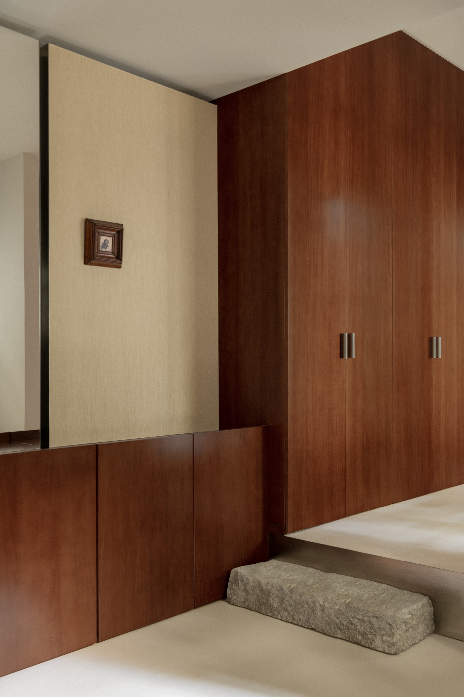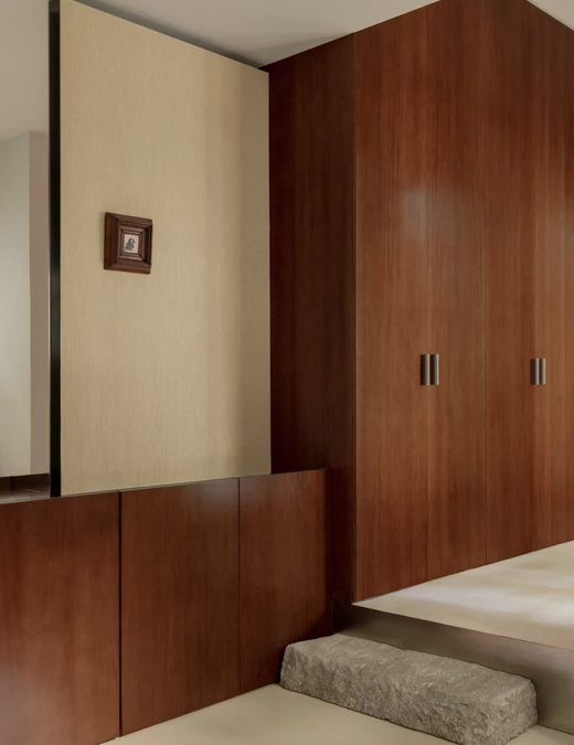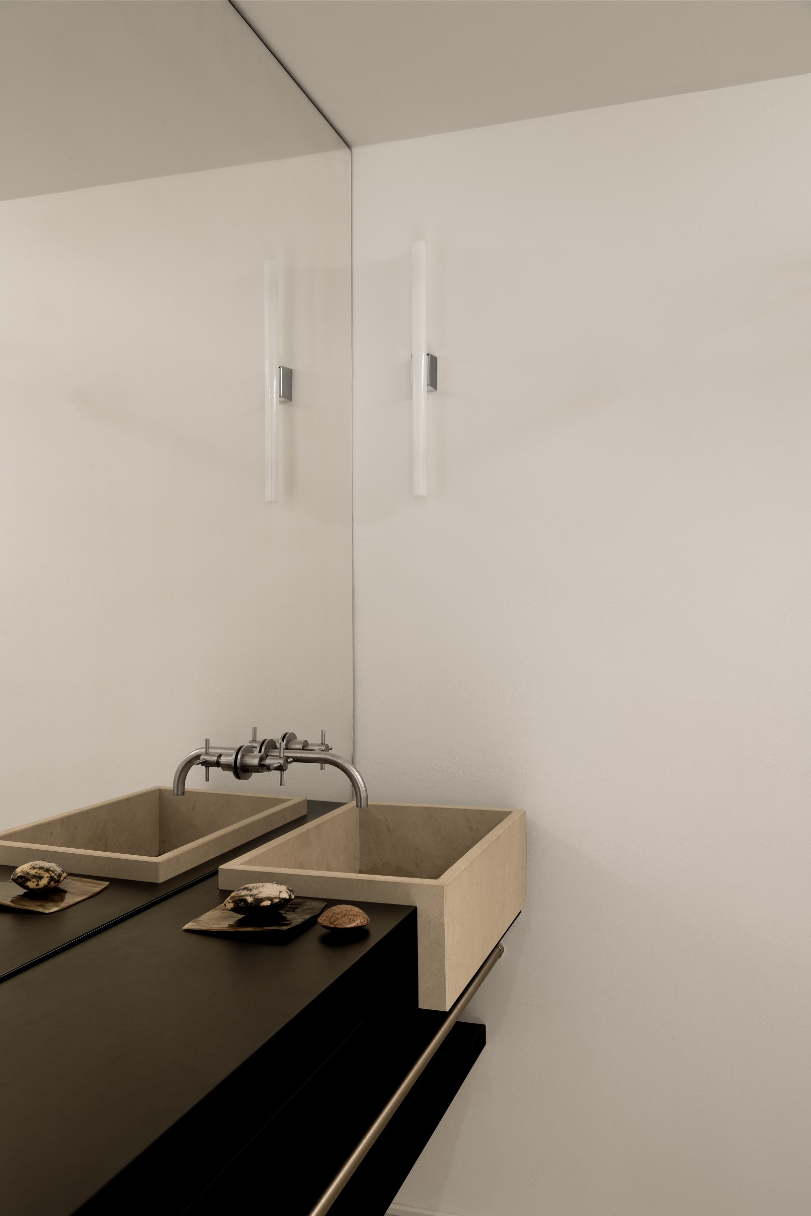 Każdy detal został przez projektantów przemyślany i wykonany na zamówienie – od zabudowy w korytarzu, która płynnie przechodzi w garderobę, po kuchnię łączącą marmur i stal. W łazience, również z marmuru, architekci zachowali tę samą ideę prostoty.