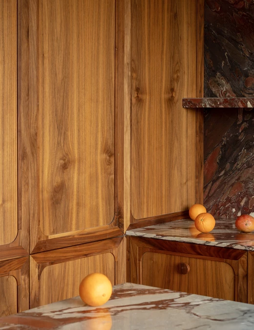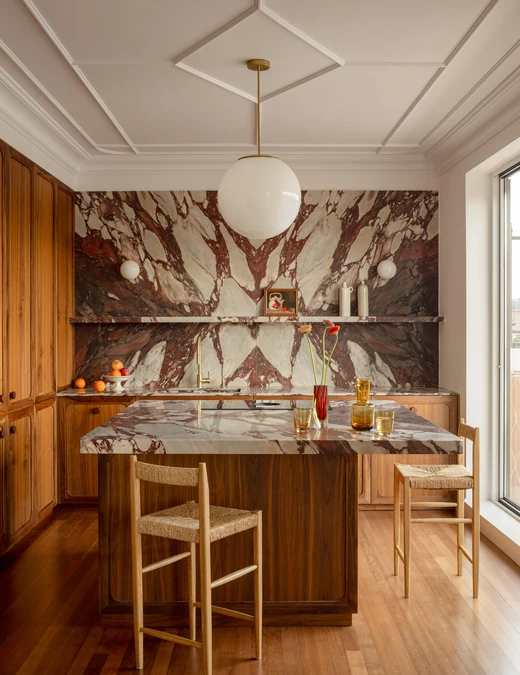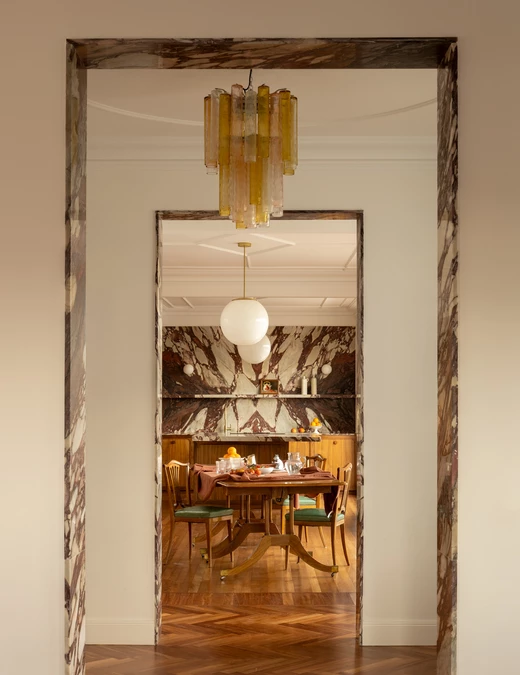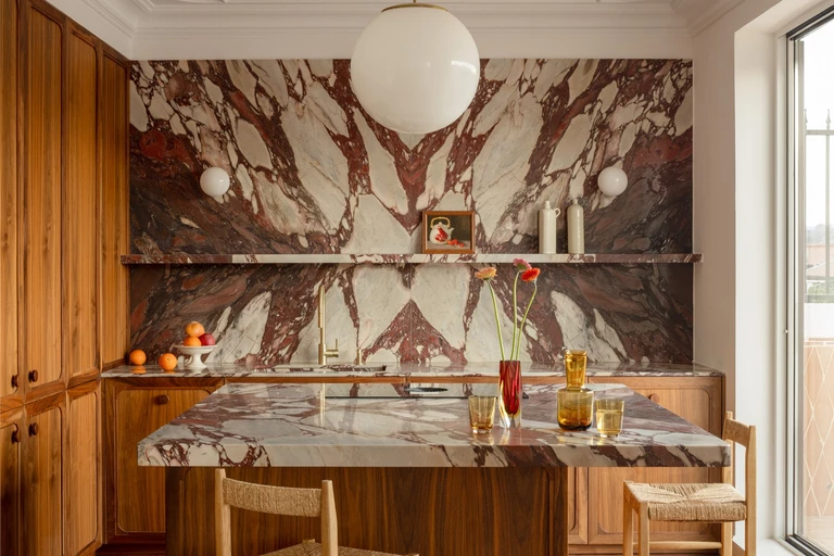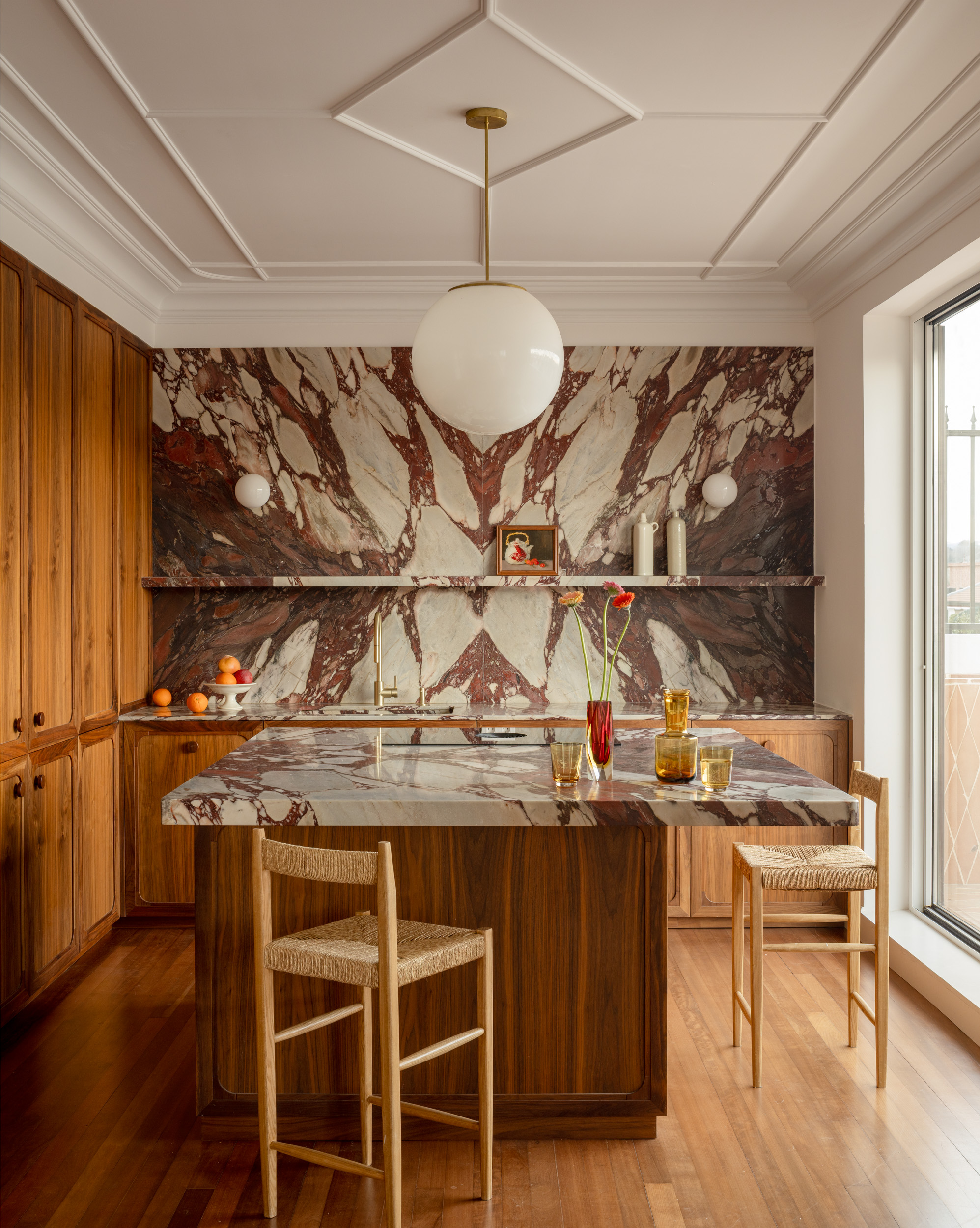 Kuchnię architekci zaprojektowali jako integralną część całości. Wyspa i blaty z marmuru viola, który powraca w otwartych przejściach i holu wejściowym, spajają pomieszczenie z resztą wnętrza.