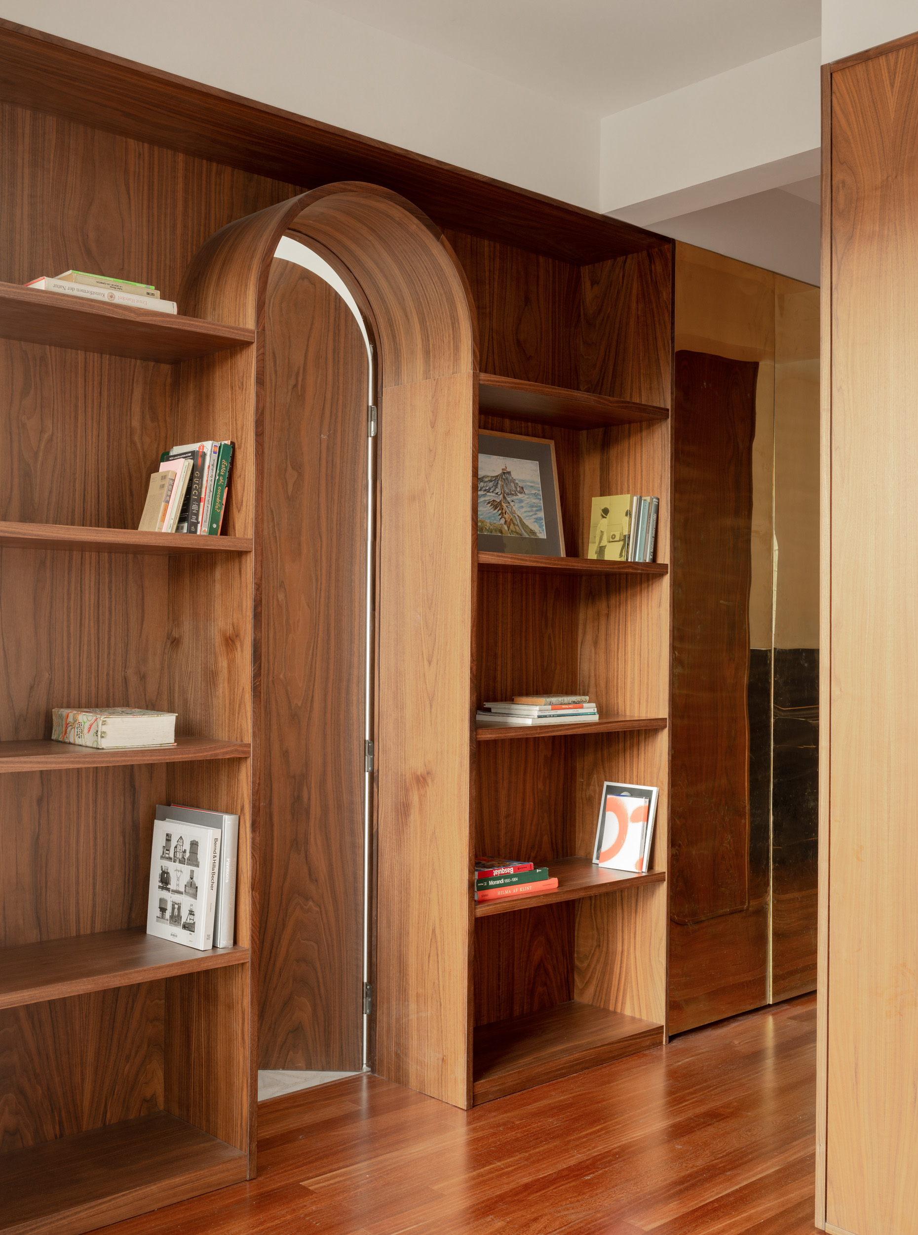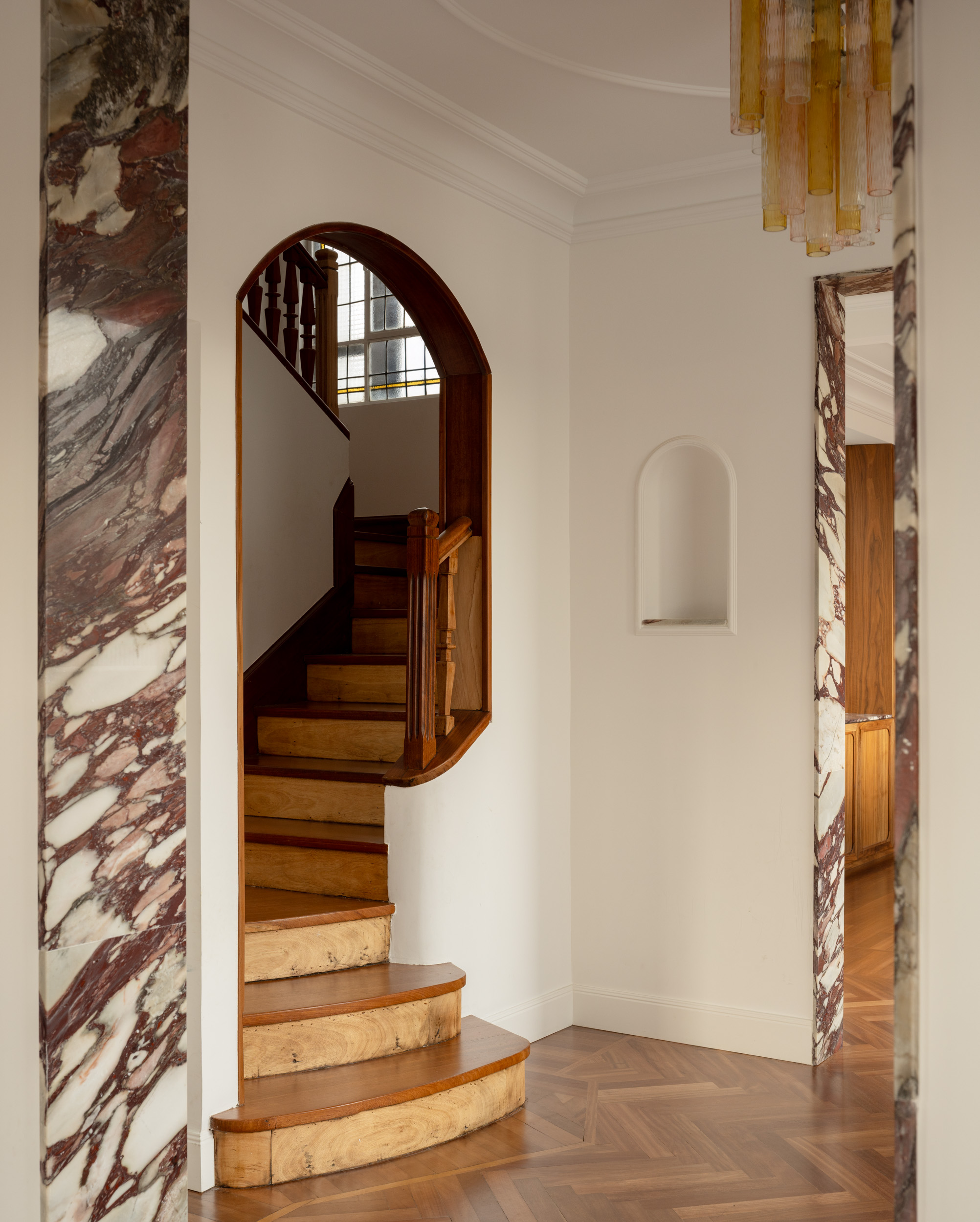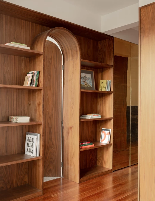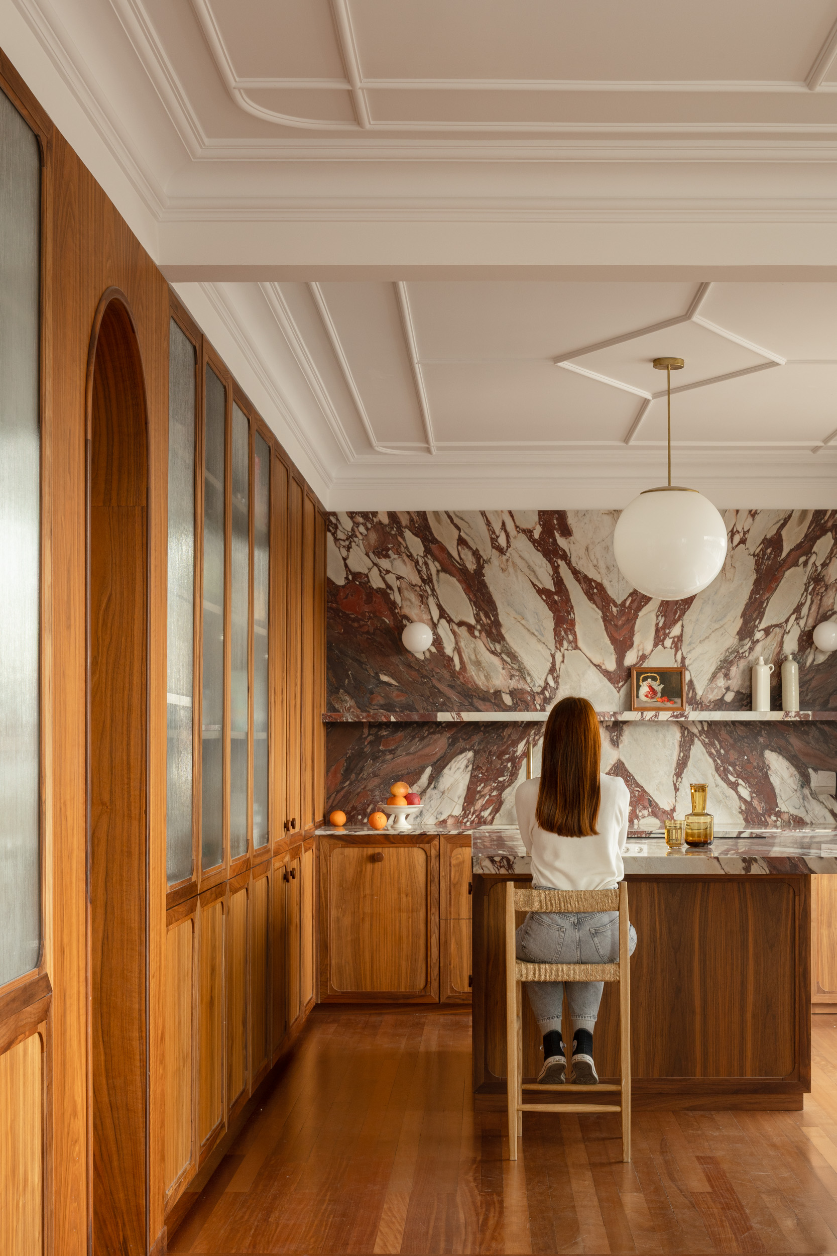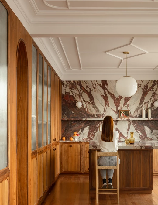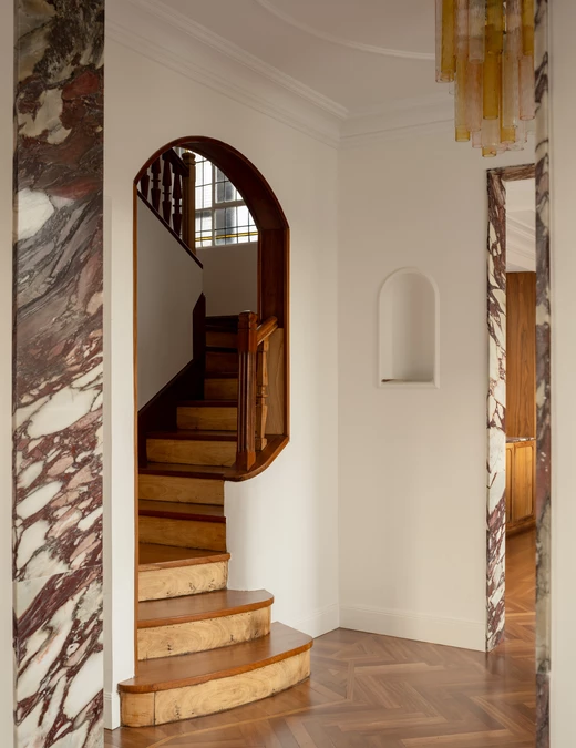 Projekt zachowuje charakter architektury połowy XX wieku. Oryginalną drewnianą podłogę i schody poddano renowacji, a detale dobrano z dużą precyzją. W całym mieszkaniu przewija się motyw orzecha, marmuru i mosiądzu – materiałów, które nadają wnętrzu elegancji.