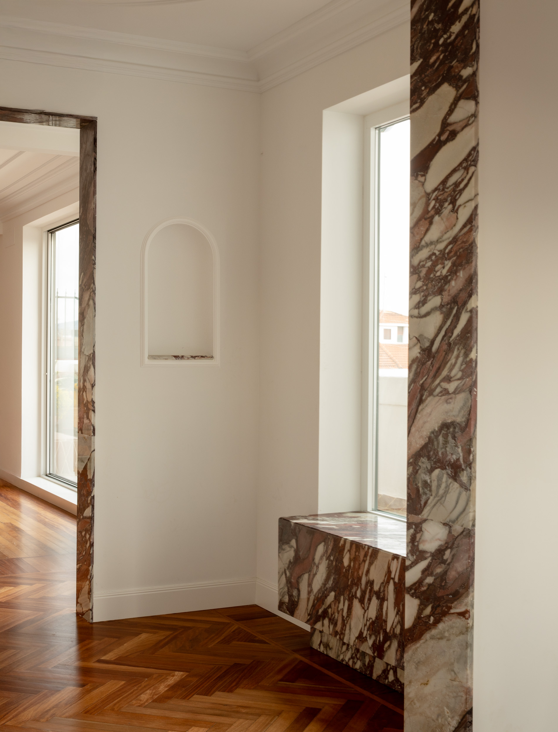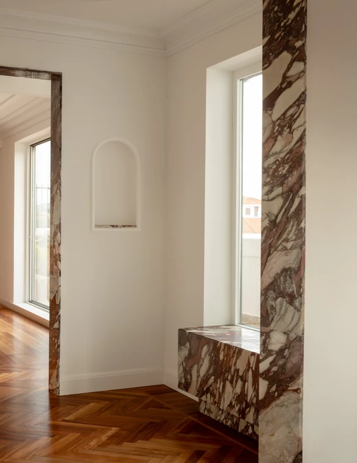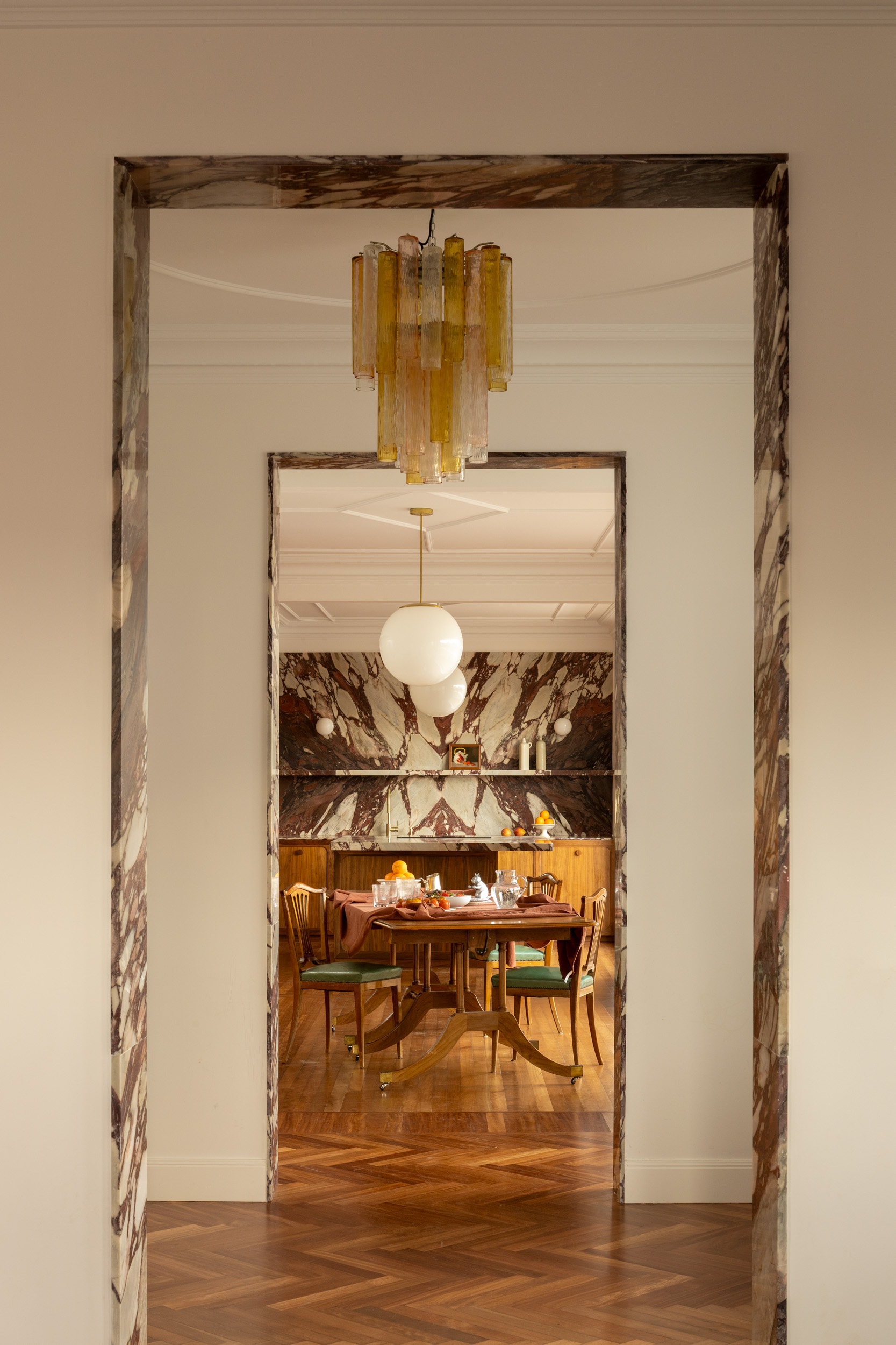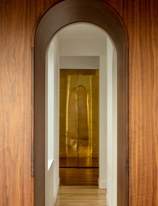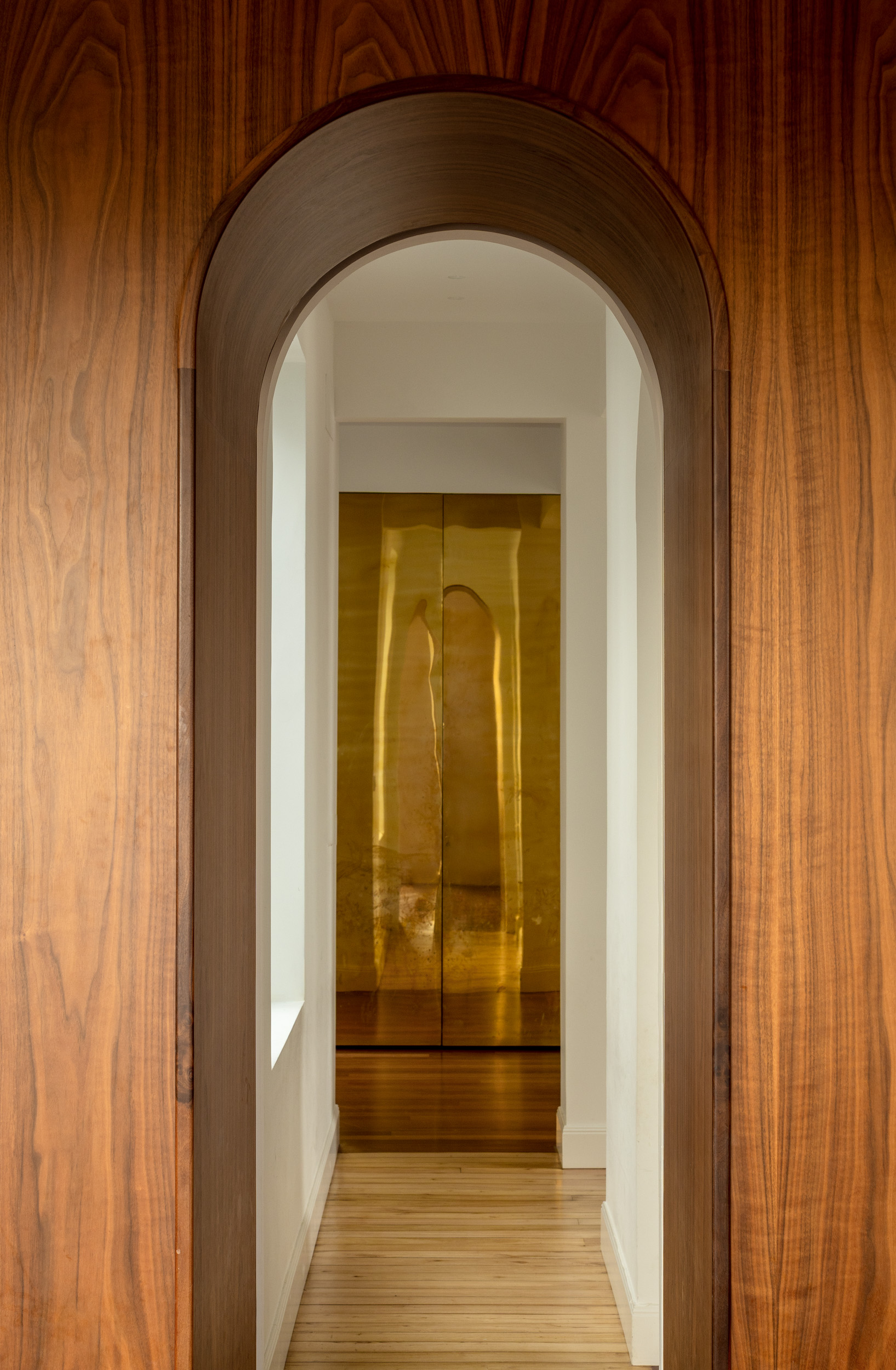 Projekt zachowuje charakter architektury połowy XX wieku. Oryginalną drewnianą podłogę i schody poddano renowacji, a detale dobrano z dużą precyzją. W całym mieszkaniu przewija się motyw orzecha, marmuru i mosiądzu – materiałów, które nadają wnętrzu elegancji.