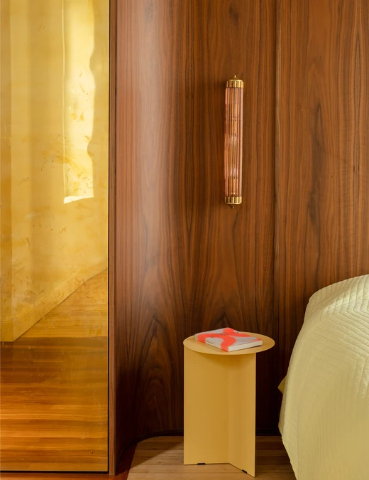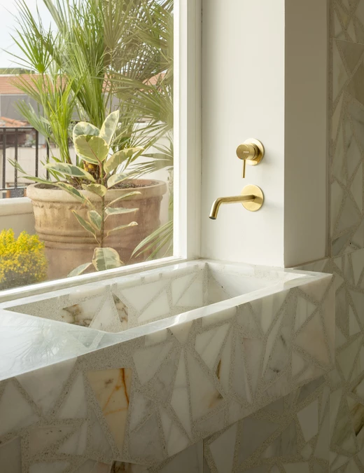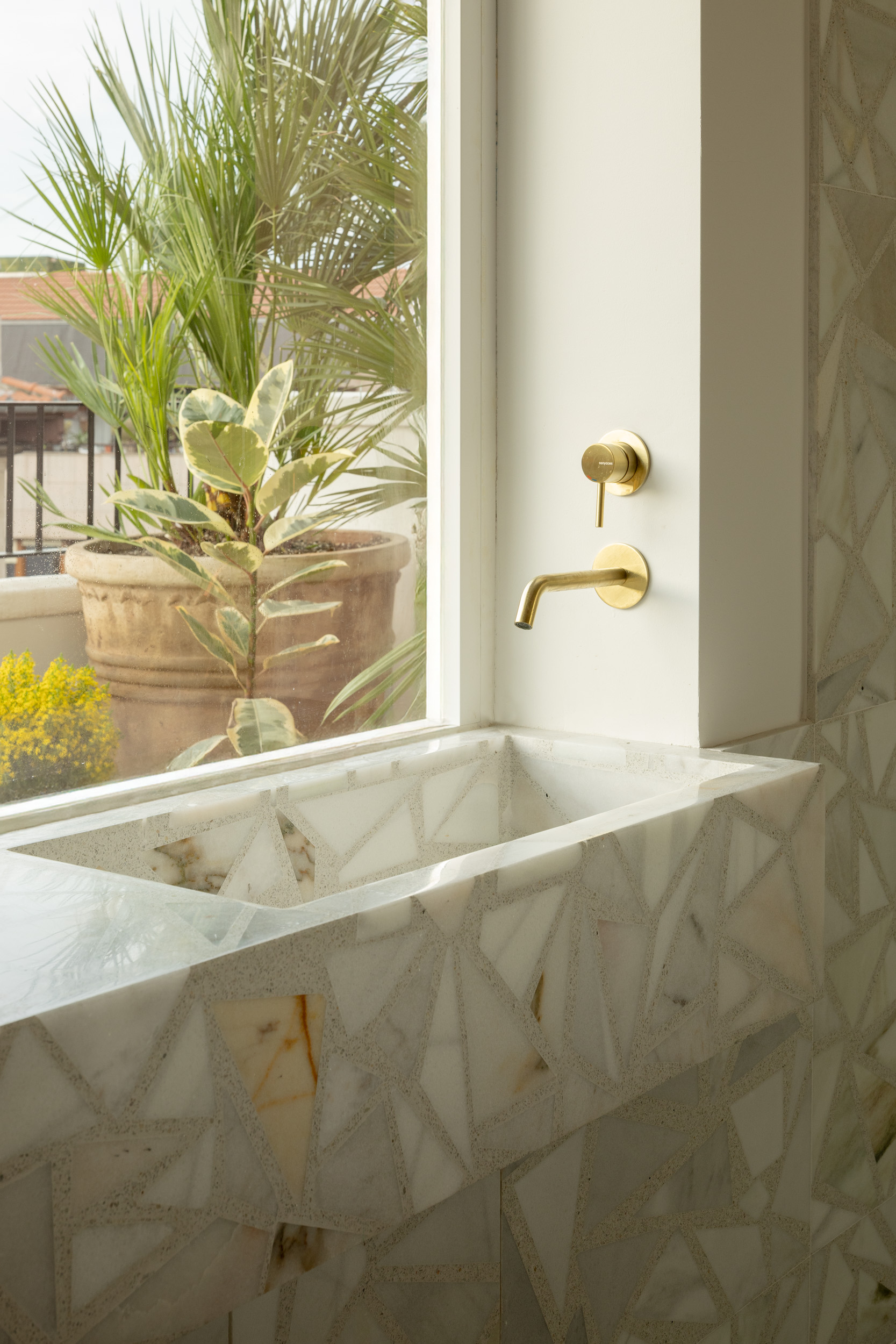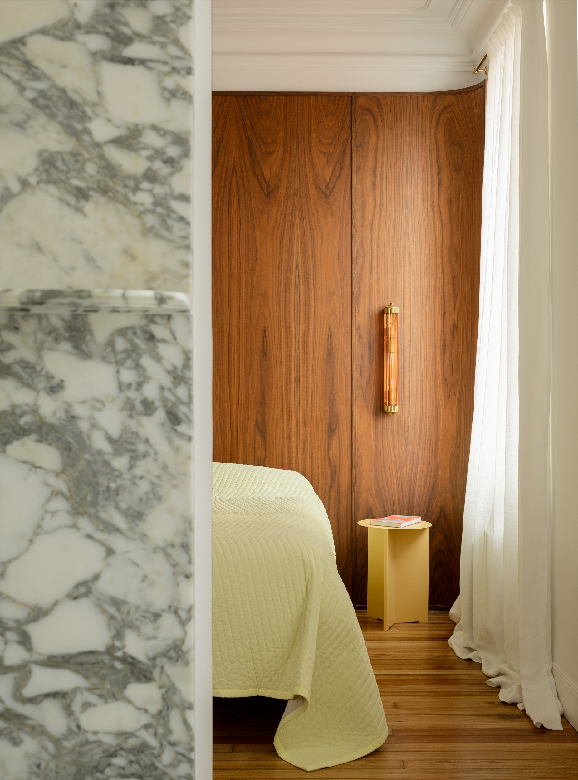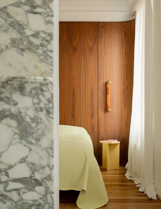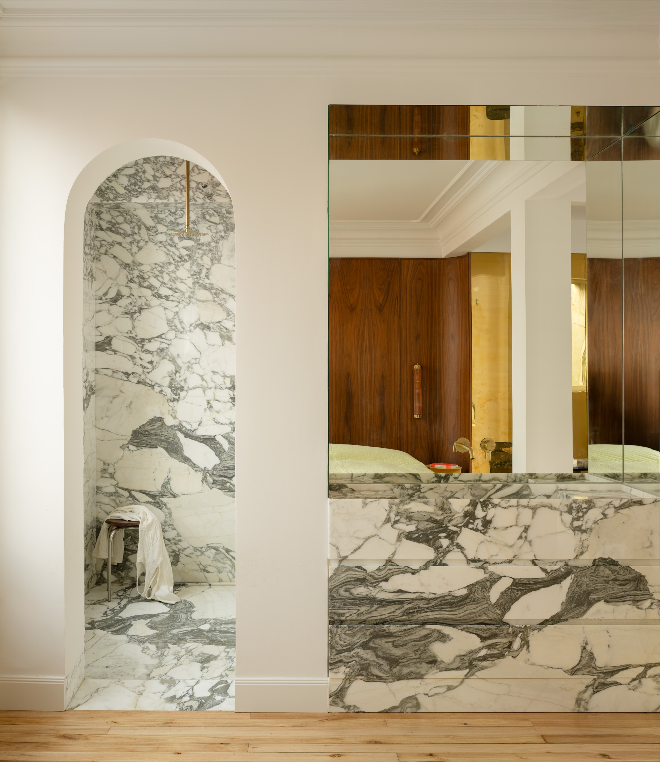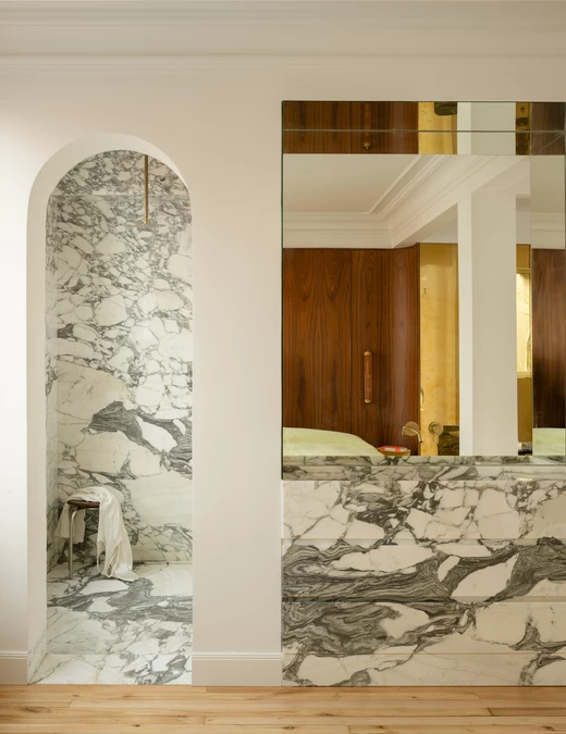 W sypialniach architekci konsekwentnie postawili na meble z mosiądzu i orzecha, natomiast w łazienkach postanowili wykorzystać wielkoformatowe płyty marmuru arabescato i terrazzo. To pozwoliło podkreślić ich indywidualny charakter.