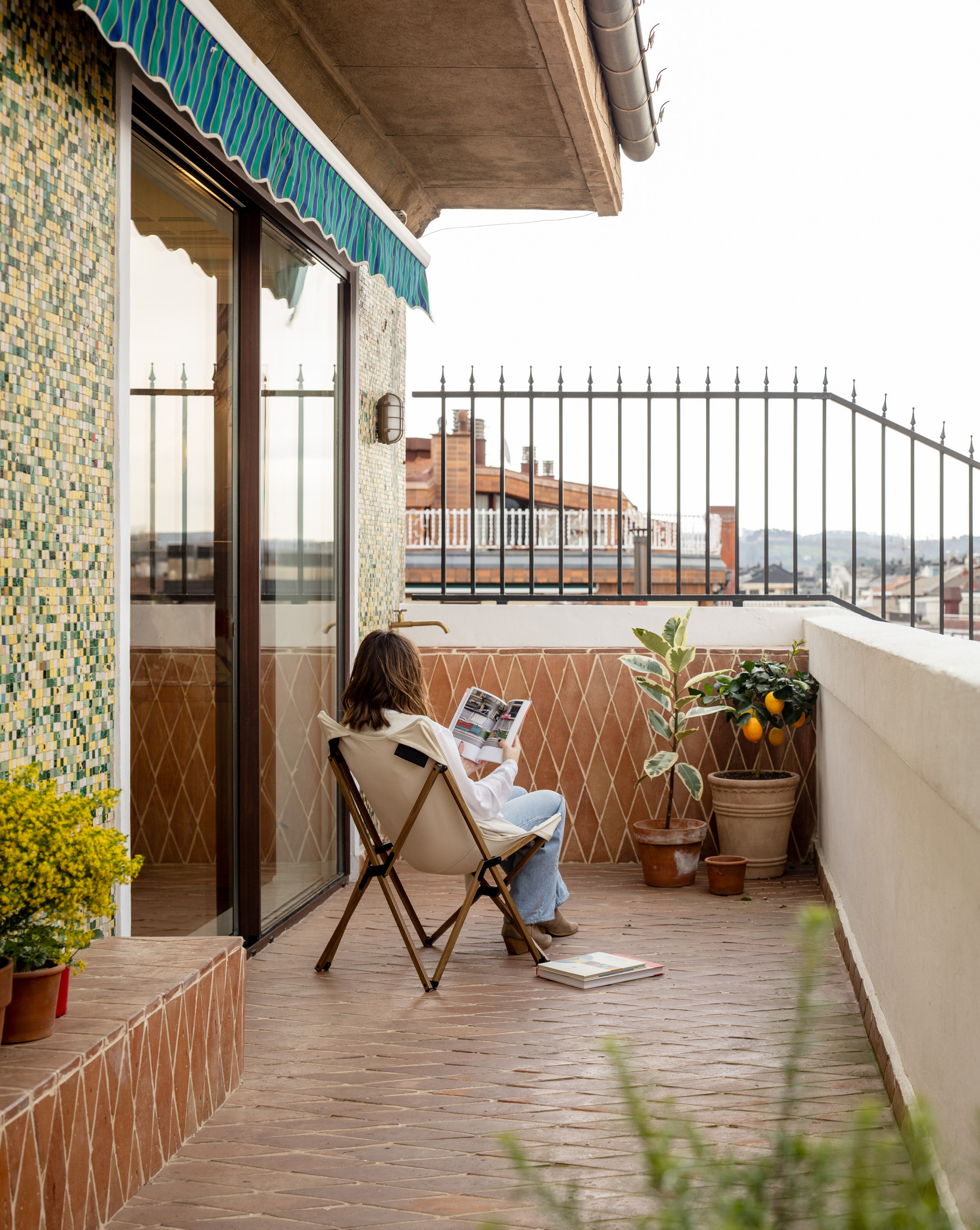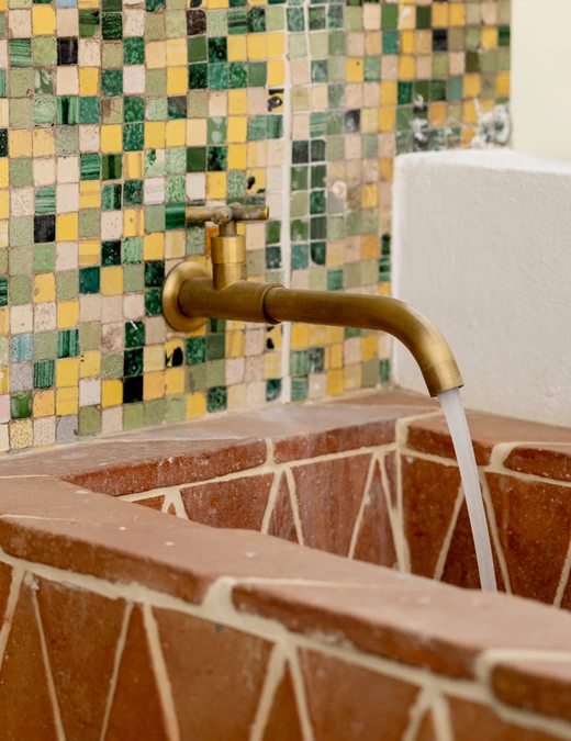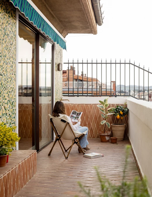 Nowe przeszklenia tarasowe w postaci przesuwnych drzwi balkonowych otworzyły wnętrze na światło, a wykończenia z wypalanej gliny – posadzki, siedziska i fontanny harmonijnie łączą przestrzeń z otoczeniem.