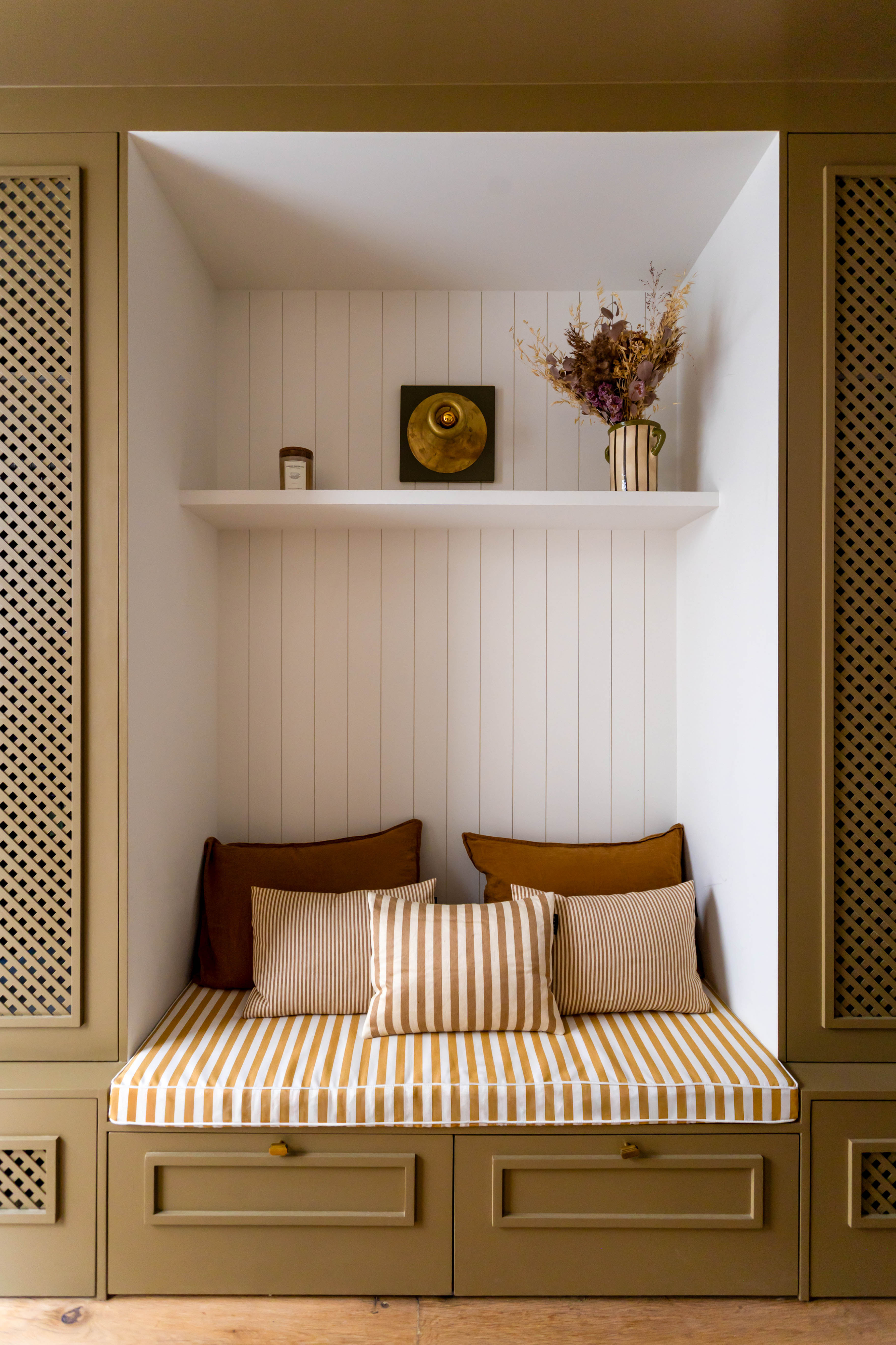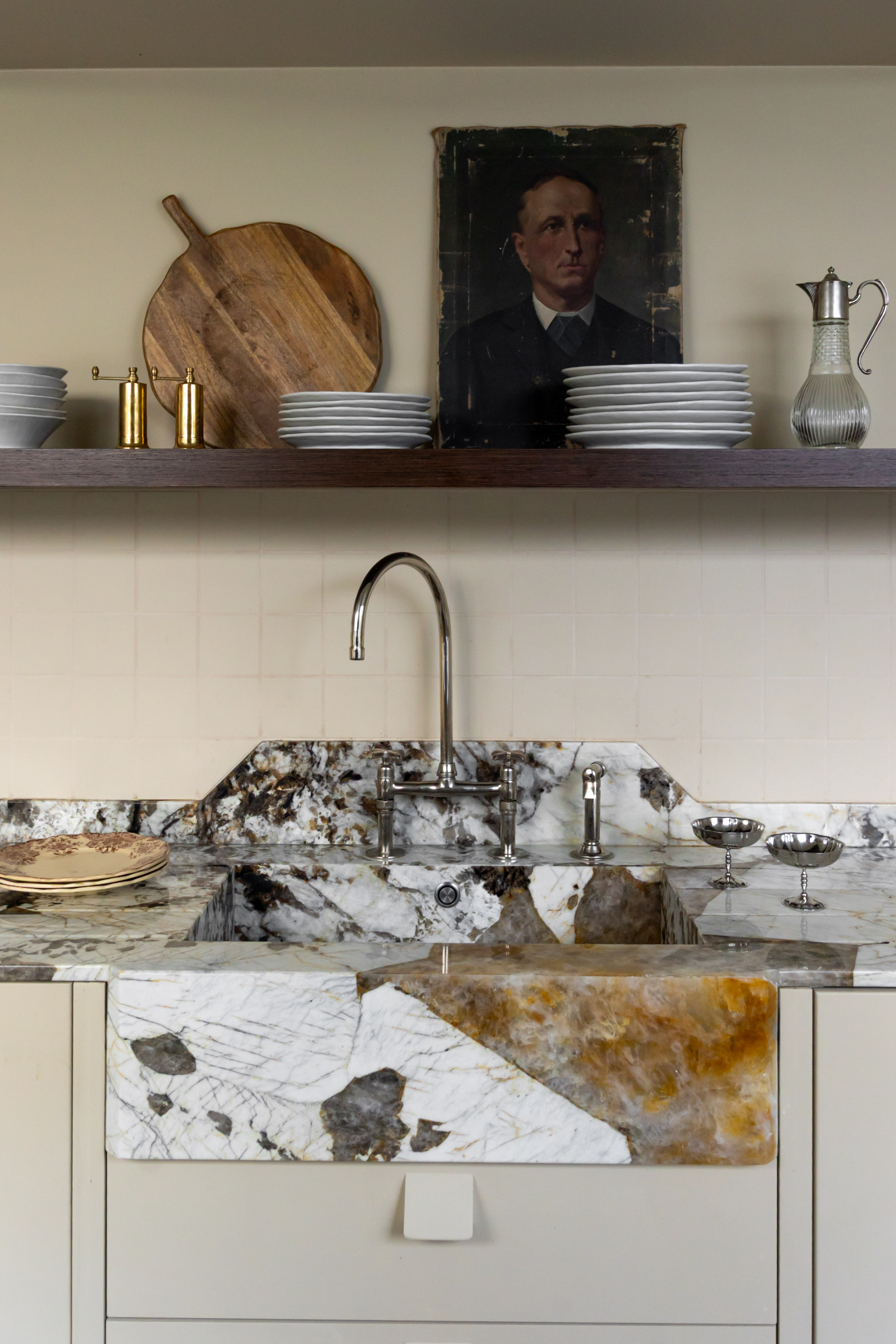 W kuchni projektantka postanowiła postawić na nowoczesność z nutą nostalgii. Szlachetne materiały, miękkie oświetlenie i retro paleta kolorów tworzą klimat, przywołujący dawne urokliwe pomieszczenia kuchenne. Pomieszczenie zachowuje jednak pełną współczesną funcjonalność.