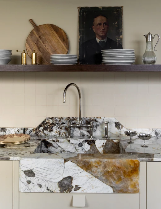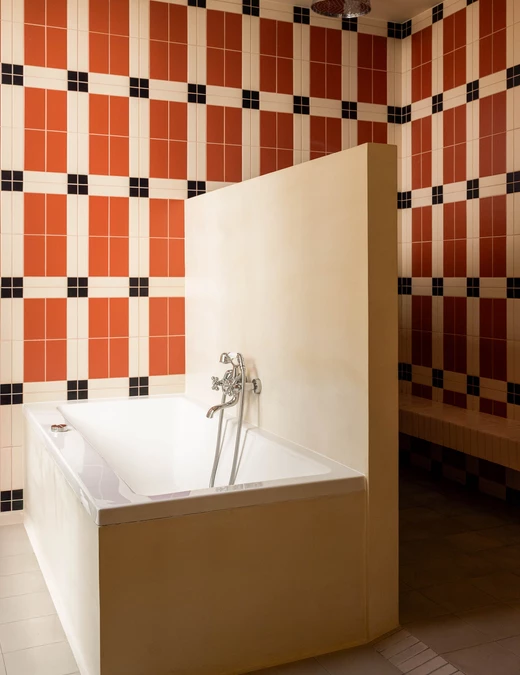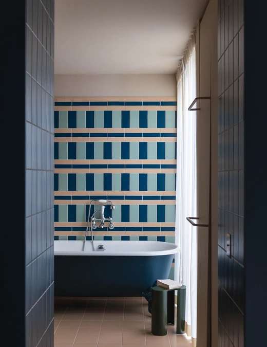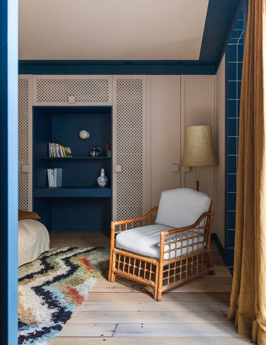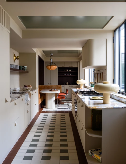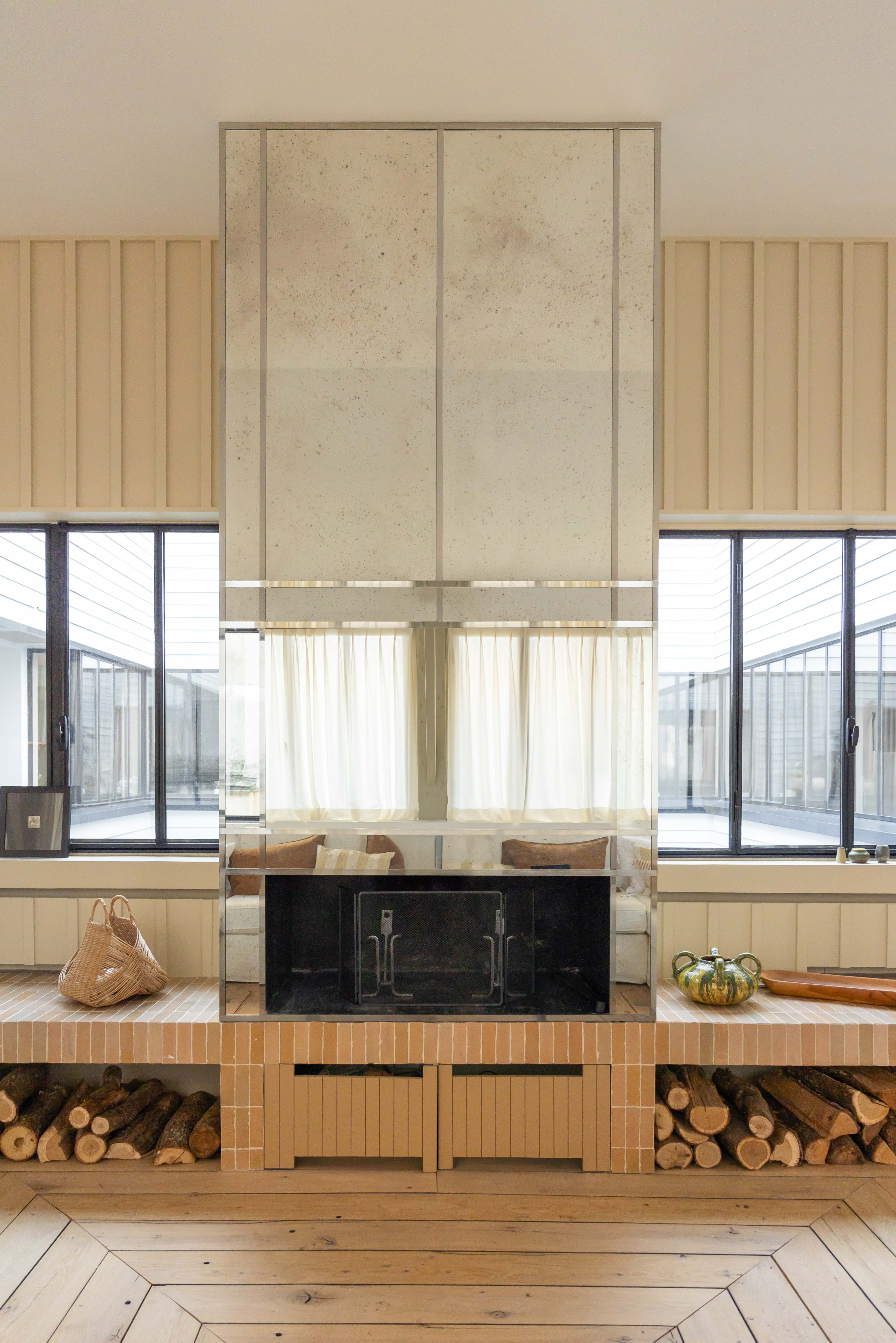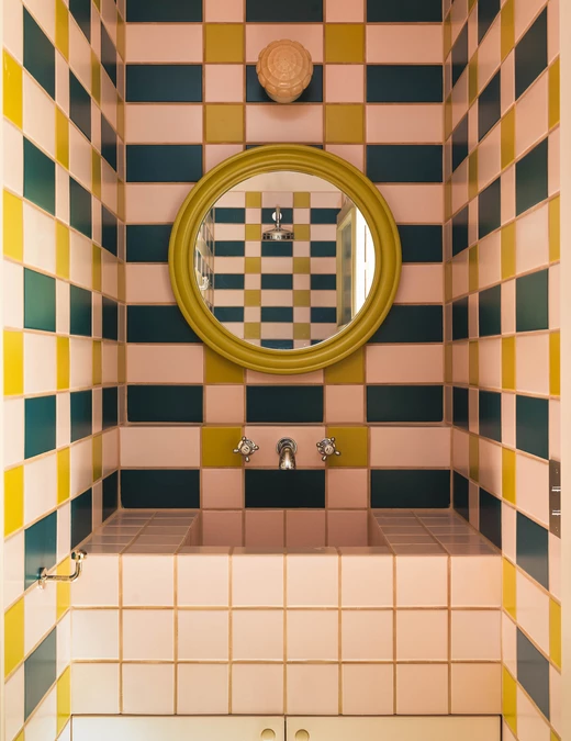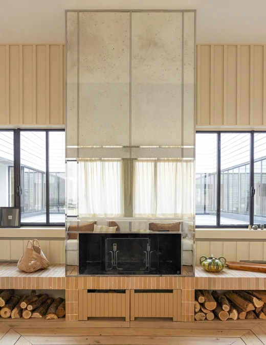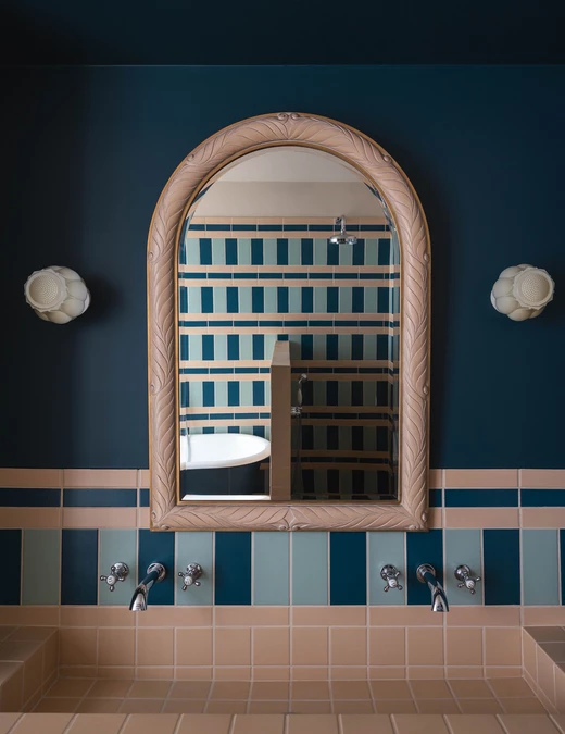 Jak mówi projektantka, estetyka projektu wynika z połączenia różnych epok. Kominek obłożony lustrami nawiązuje do lat 30., welurowa kanapa w kuchni do stylu Napoleona III, a podłogi z odzyskanych desek i przeszklone ścianki przypominają wczesne realizacje z XX wieku. Całość dopełniają geometryczne wzory płytek i subtelna paleta barw – od ciepłych beżów po chłodne błękity.