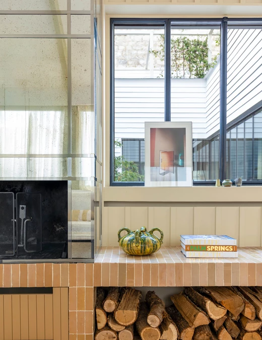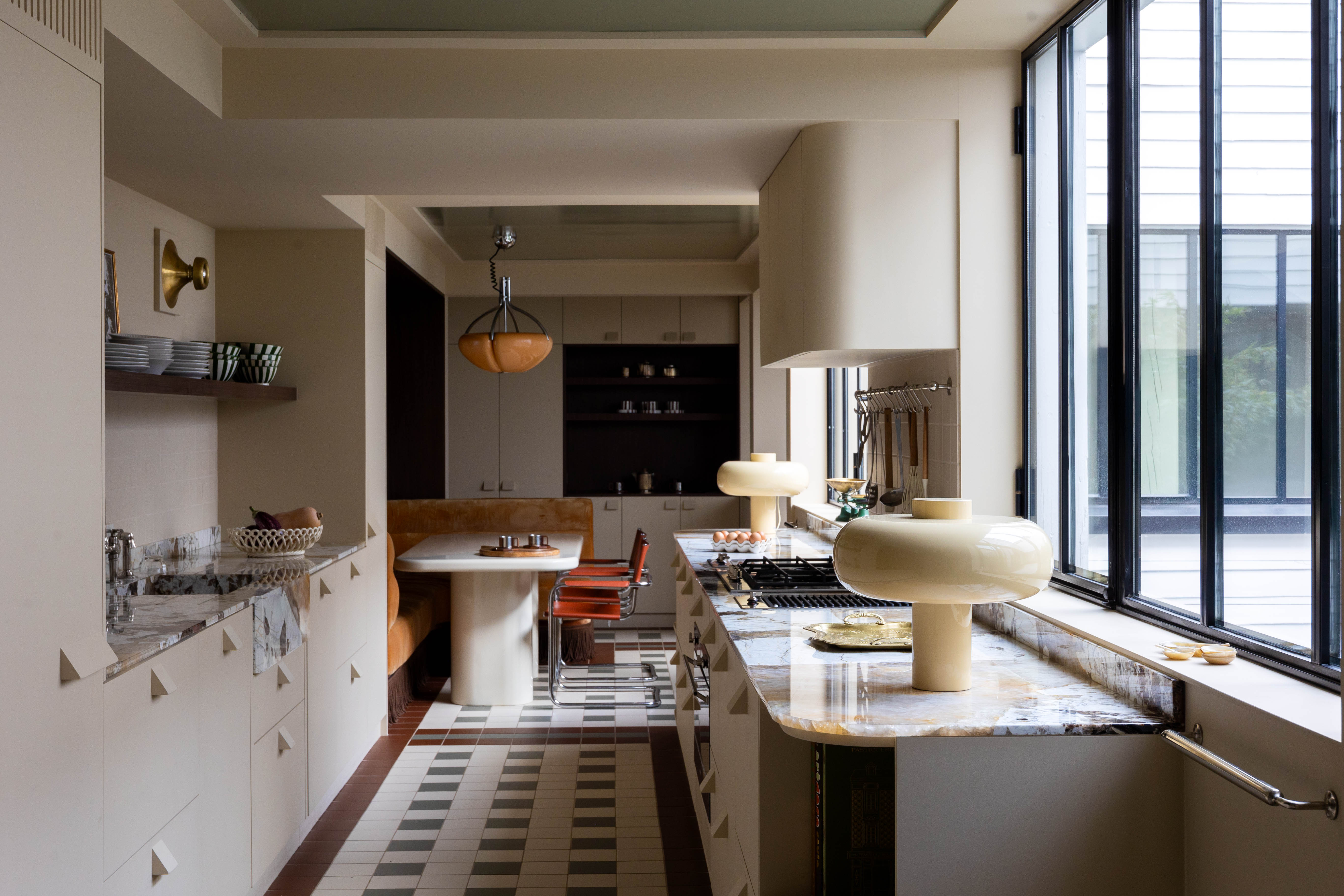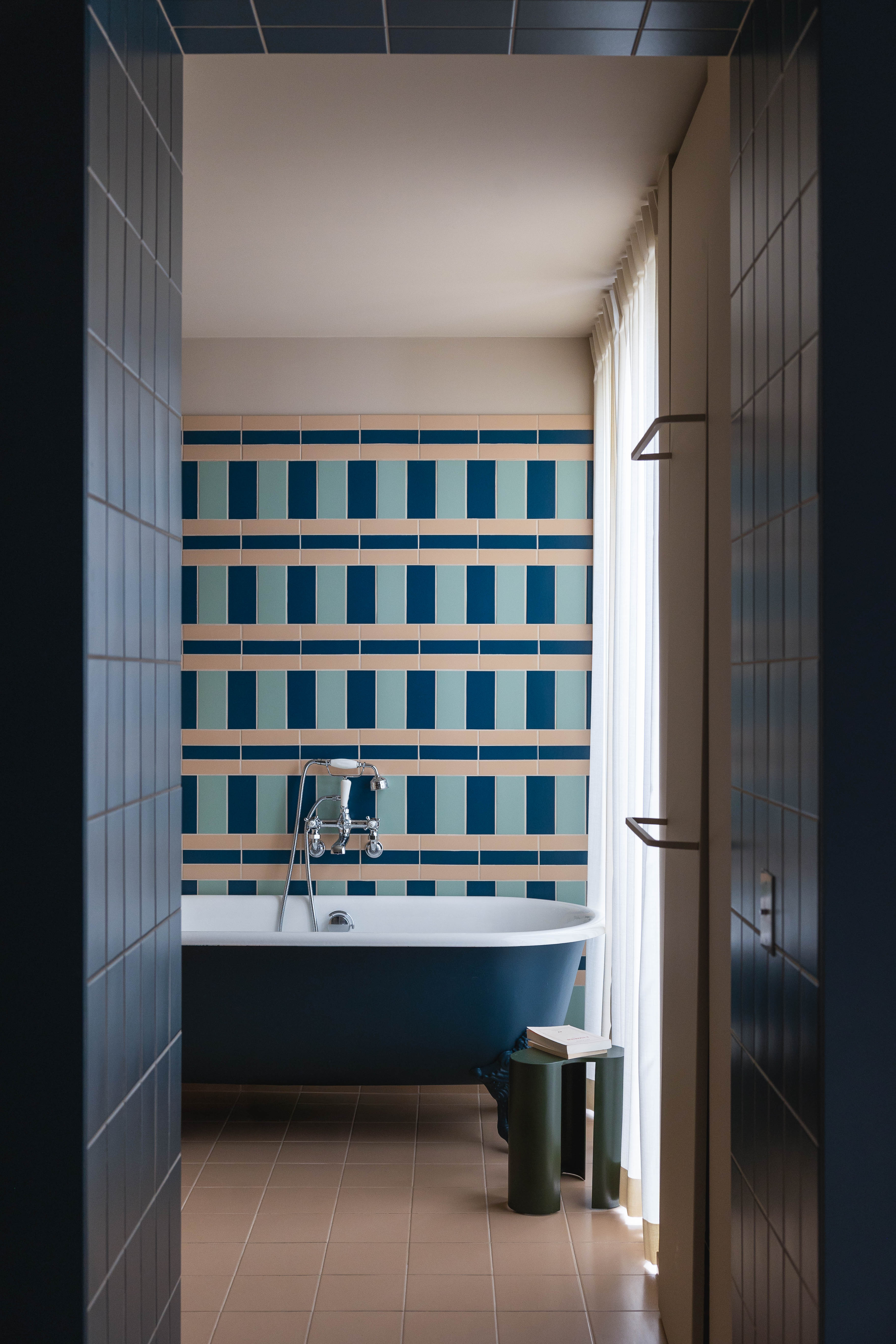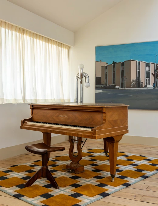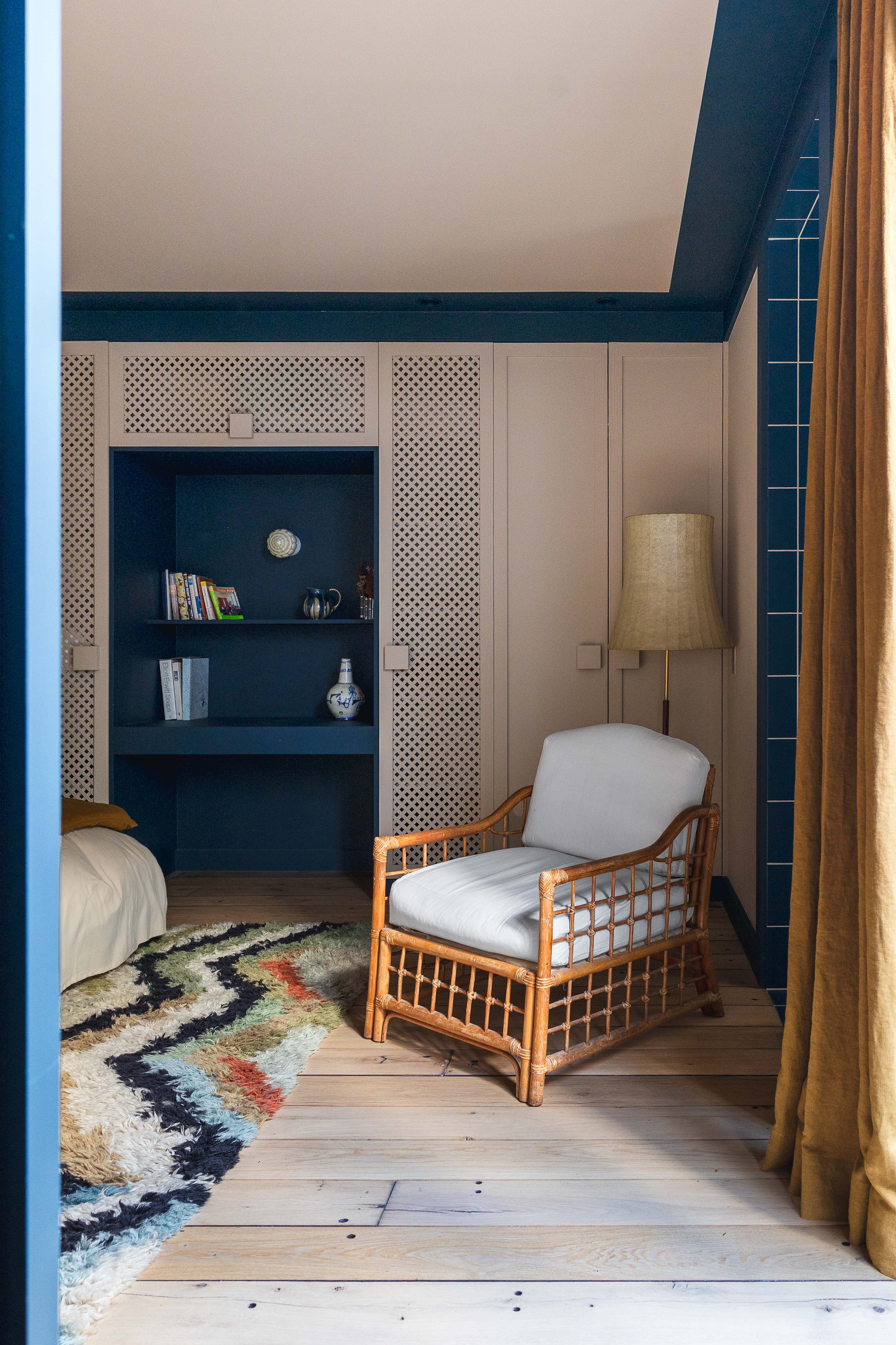 Jak mówi projektantka, estetyka projektu wynika z połączenia różnych epok. Kominek obłożony lustrami nawiązuje do lat 30., welurowa kanapa w kuchni do stylu Napoleona III, a podłogi z odzyskanych desek i przeszklone ścianki przypominają wczesne realizacje z XX wieku. Całość dopełniają geometryczne wzory płytek i subtelna paleta barw – od ciepłych beżów po chłodne błękity.
