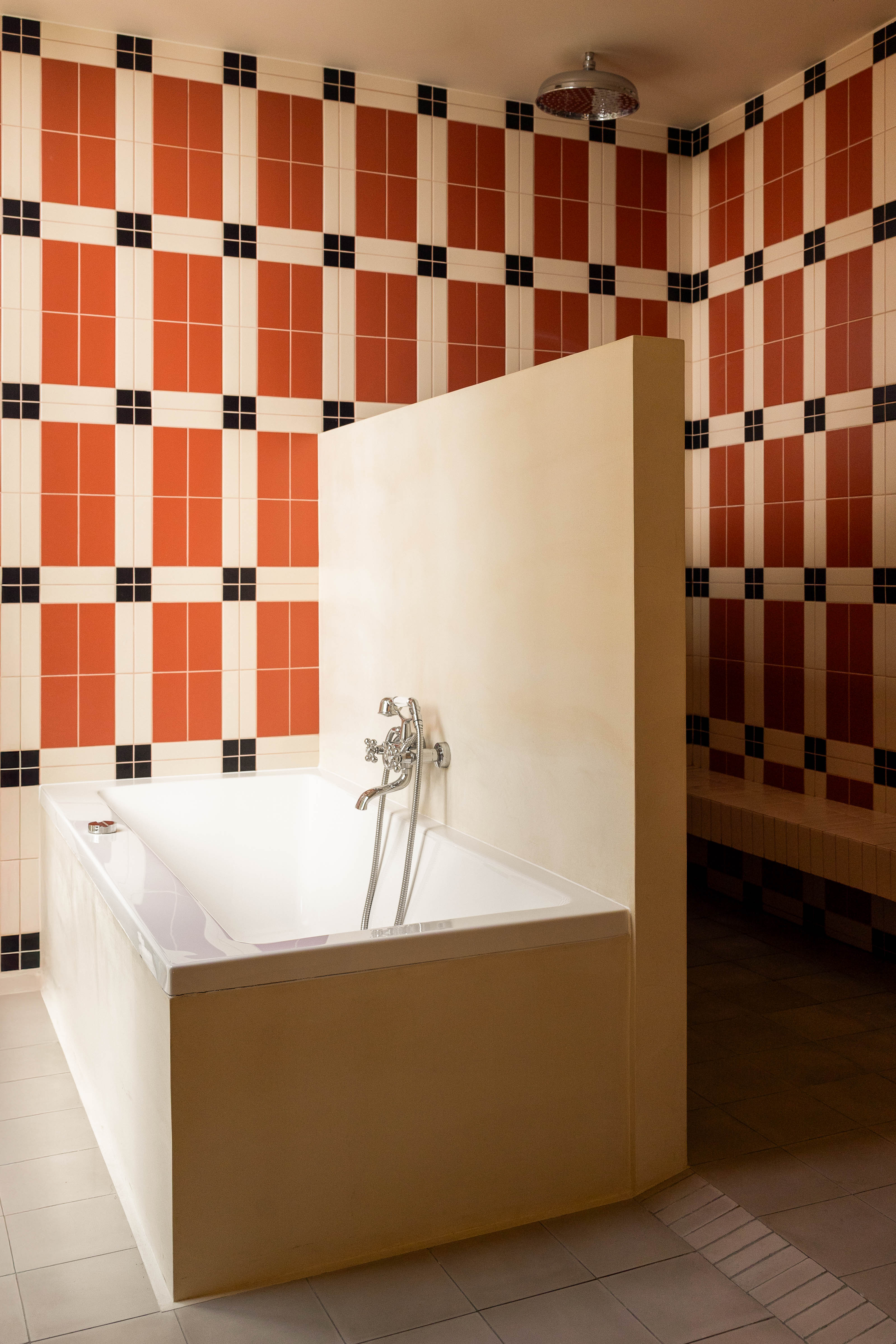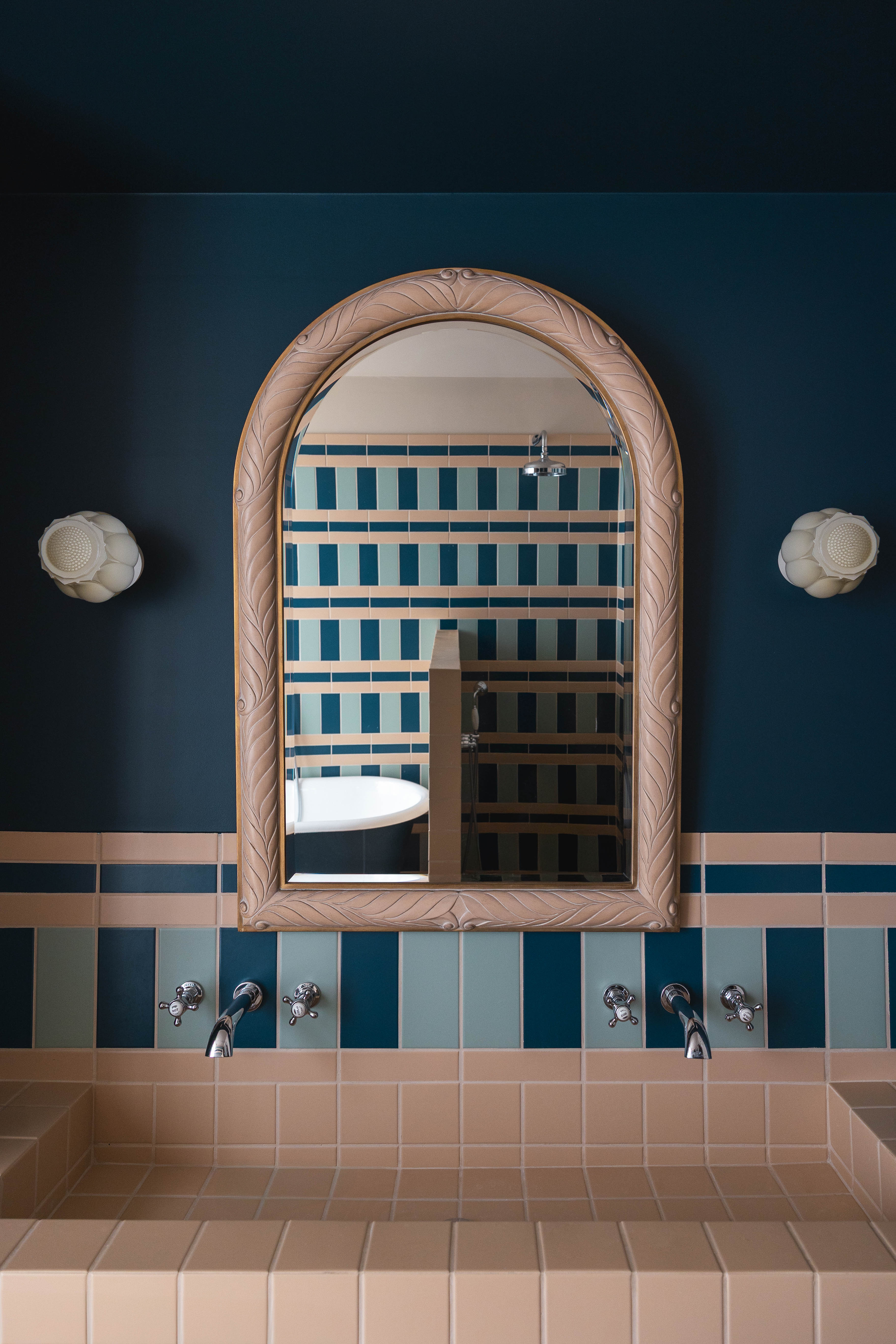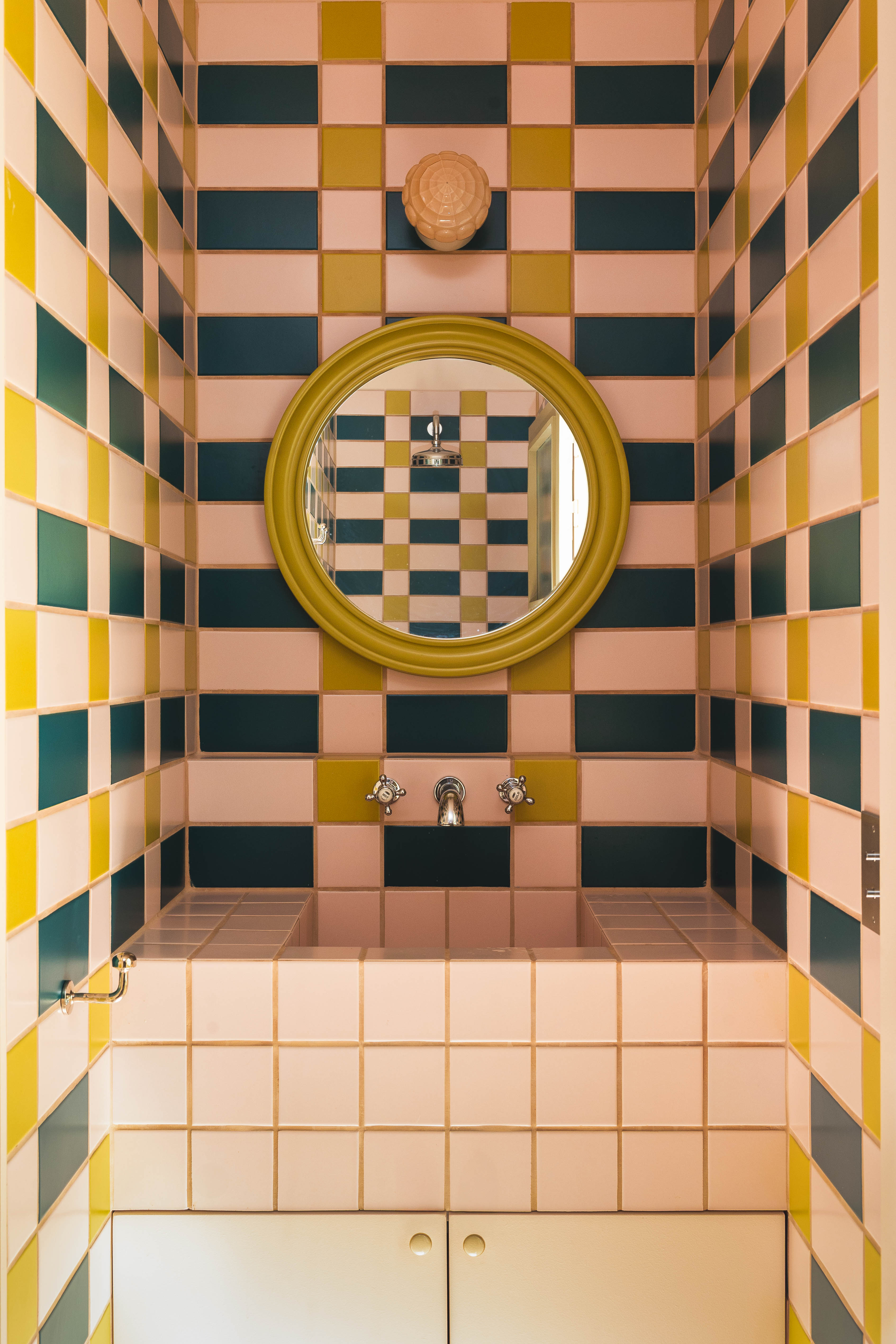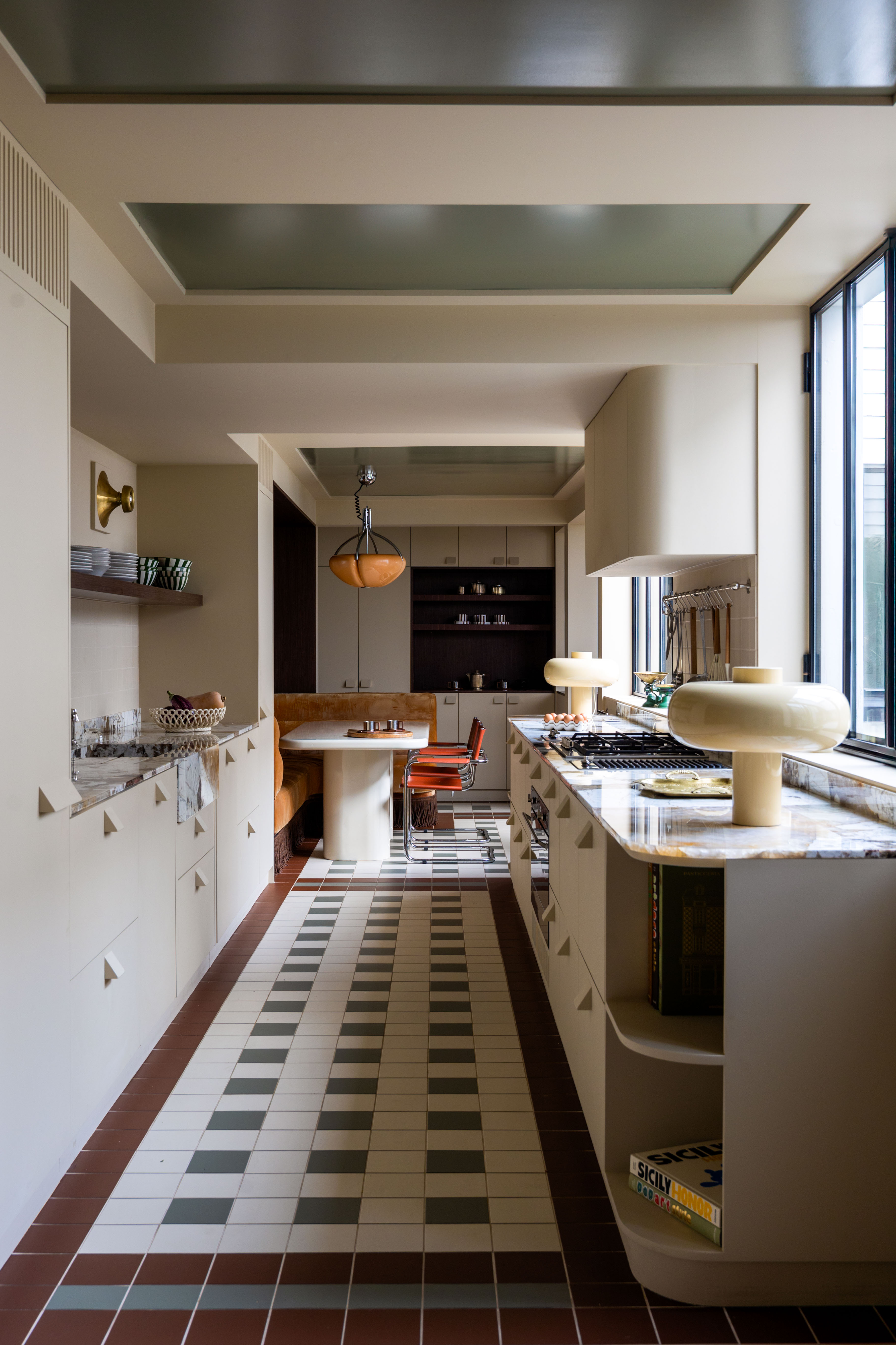 Jak mówi projektantka, estetyka projektu wynika z połączenia różnych epok. Kominek obłożony lustrami nawiązuje do lat 30., welurowa kanapa w kuchni do stylu Napoleona III, a podłogi z odzyskanych desek i przeszklone ścianki przypominają wczesne realizacje z XX wieku. Całość dopełniają geometryczne wzory płytek i subtelna paleta barw – od ciepłych beżów po chłodne błękity.