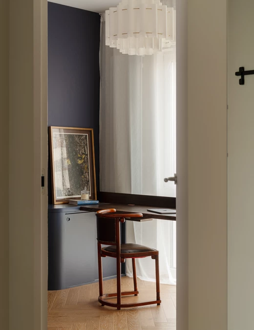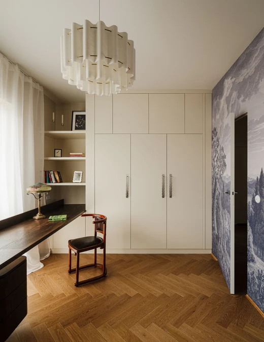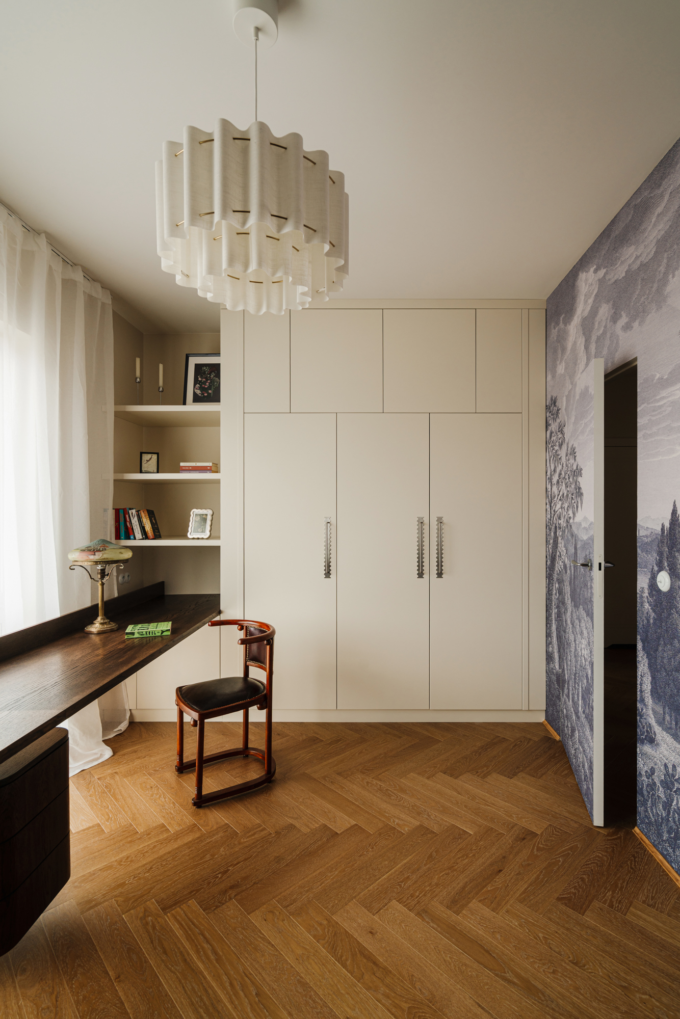 Gabinet to miejsce nieco bardziej osobiste, ale i swobodne. Tapeta o onirycznym charakterze maskuje drzwi i wprowadza element zaskoczenia. Długie biurko zdaje się lewitować pomiędzy krańcami pomieszczenia, a współczesne elementy zabudowy kontrastują z pamiątkowymi meblami vintage.