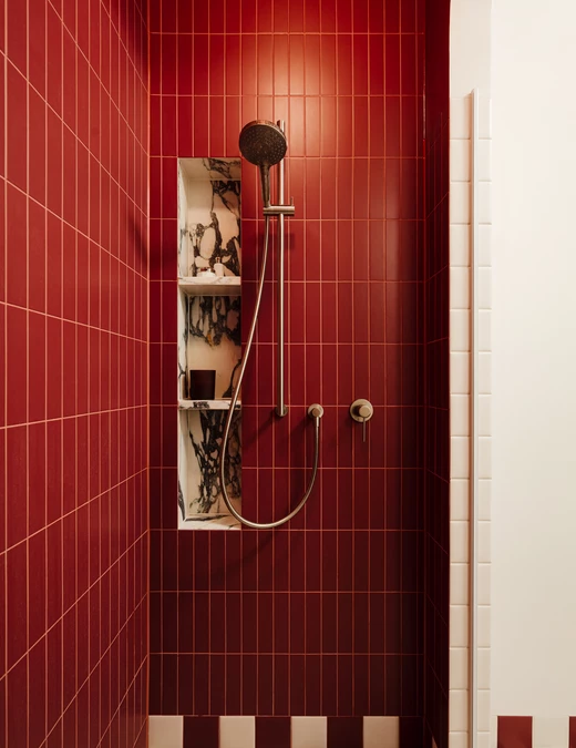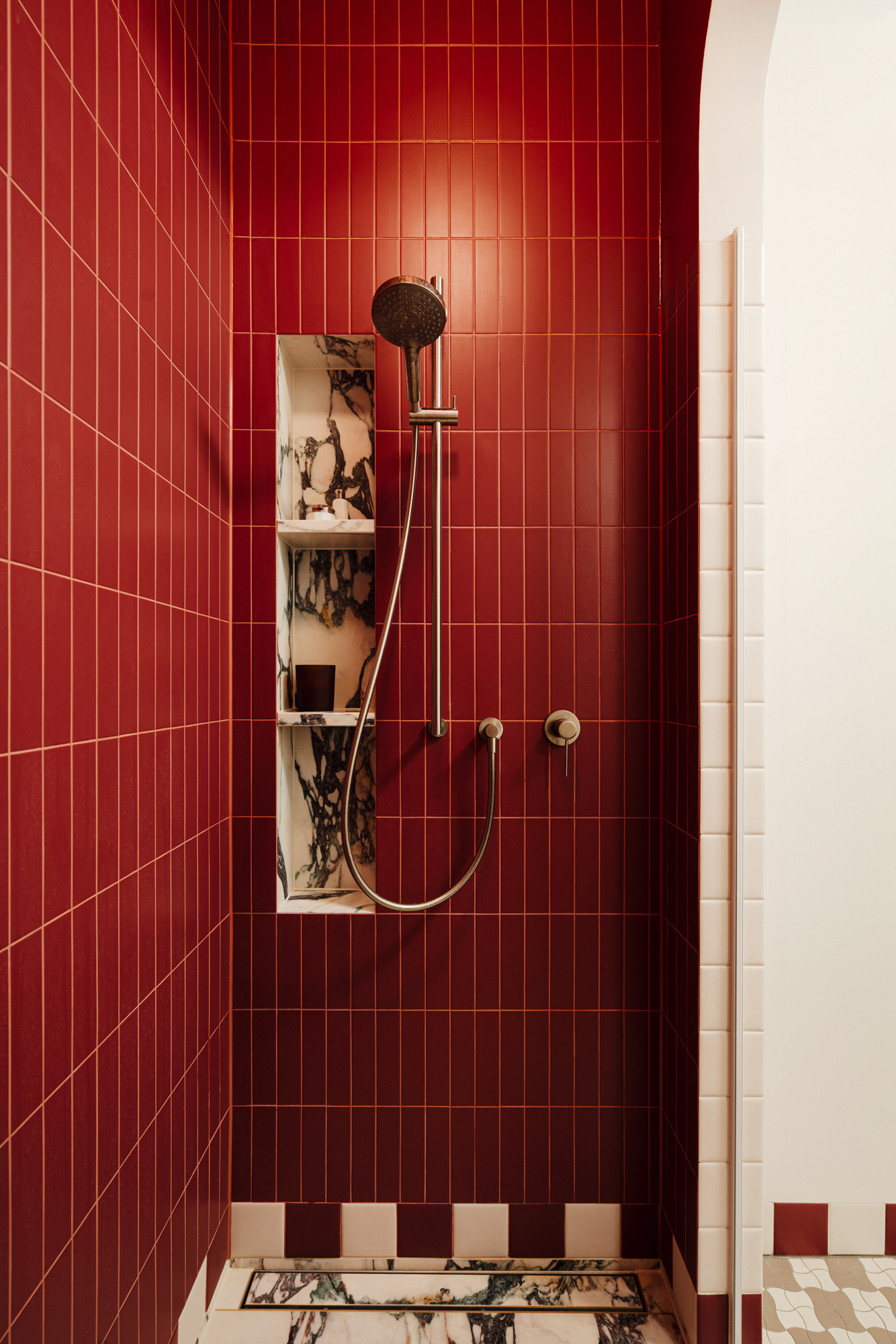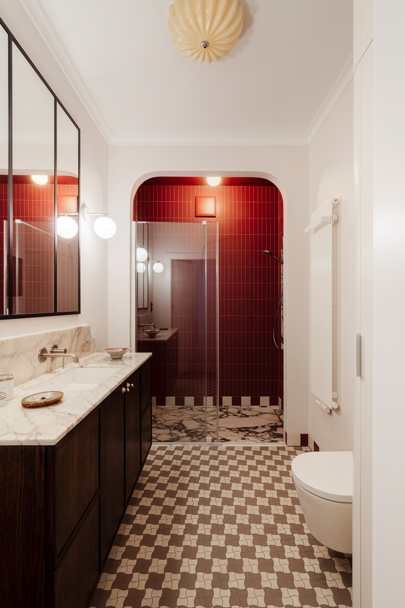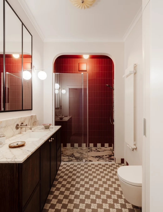 Łazienka świadomie odchodzi od spokojnej palety projektu. Bordowe płytki w strefie prysznica nadają głębi i charakteru, kontrastując z jasnymi ścianami i sufitem. Geometryczna posadzka porządkuje kompozycję, a portalowe obramowanie wzmacnia architektoniczny sznyt.