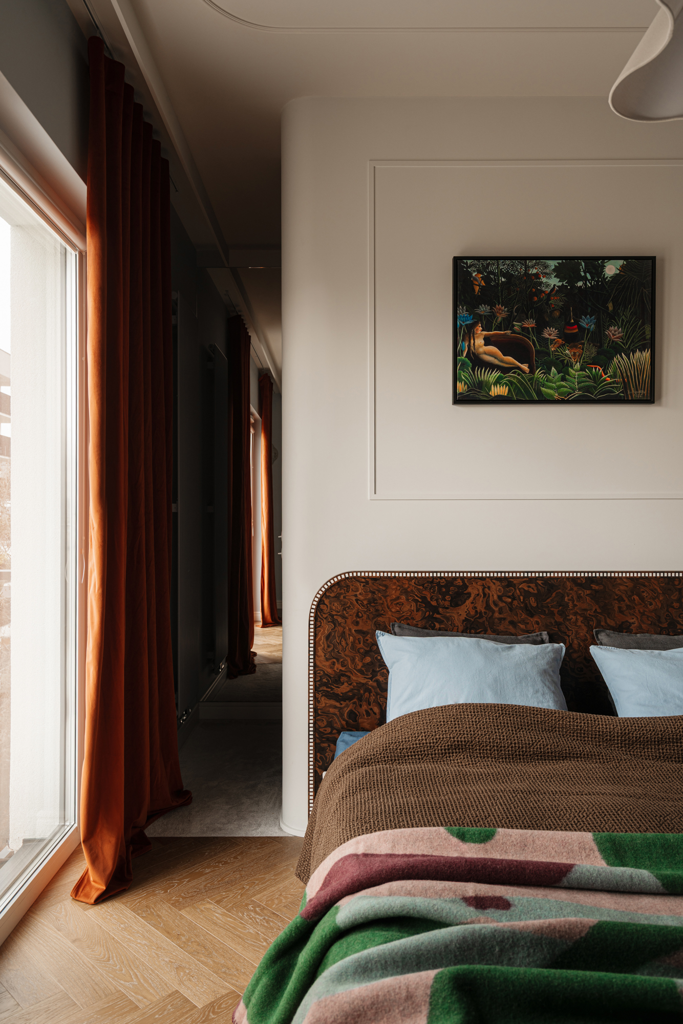 Do stonowanej sypialni wkracza się przez półtransparentne drzwi w drewnianych ramach, które już na wejściu budują atmosferę spokoju. Sercem tej przestrzeni stało się łóżko z czeczotowym wezgłowiem, wykończone charakterystycznym detalem na obwodzie. Ukryta garderoba, miękka wykładzina, cięższe tekstylia i lustro w tle snują intymną, wielowarstwową opowieść. Z kolei obraz otoczony współczesną sztukaterią dodaje narracyjnego akcentu i przełamuje kolorystykę.