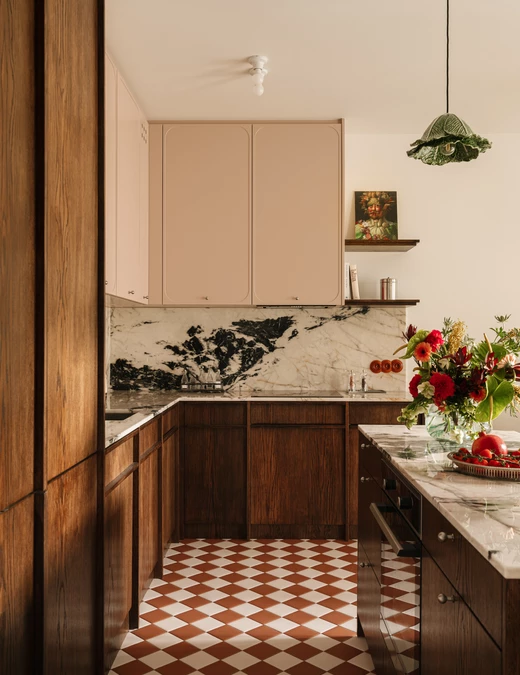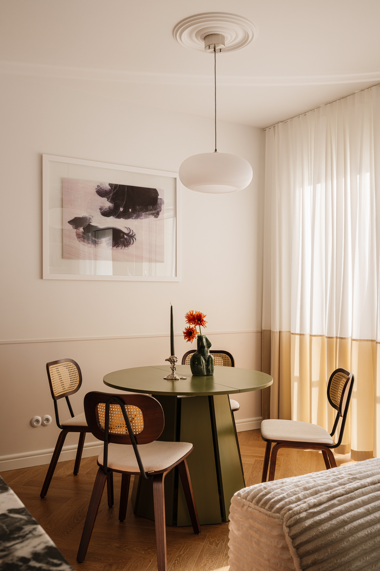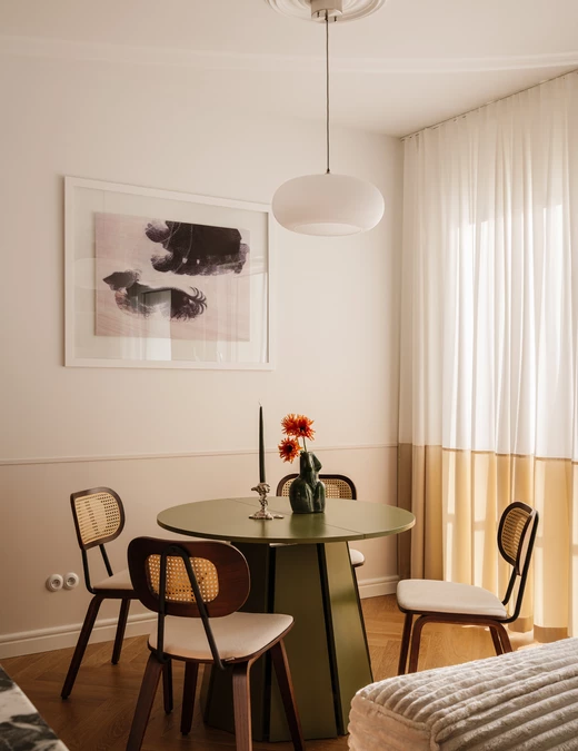 Część dzienna, łącząca kuchnię i jadalnię, zestawia klarowność rzemieślniczej formy zabudowy ze szlachetnym charakterem kwarcytowych blatów o wyrazistym użyleniu. Okrągły oliwkowy stół, krzesła z plecionymi oparciami i duża biblioteczka wprowadzają domową atmosferę, a rzeźbiarskie detale subtelnie podkreślają artystyczny charakter przestrzeni. Kapuściana lampa nad stołem pozostaje niewielkim, ale jakże wyrazistym detalem, podkreślającym wyjątkowość wnętrza.