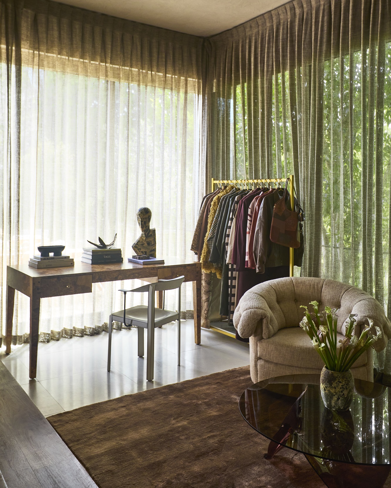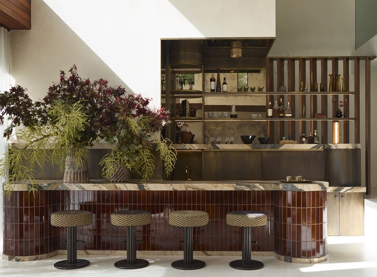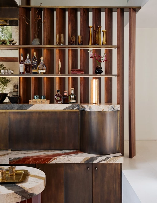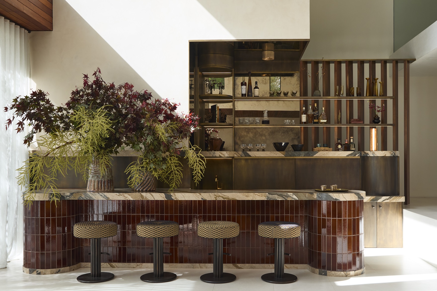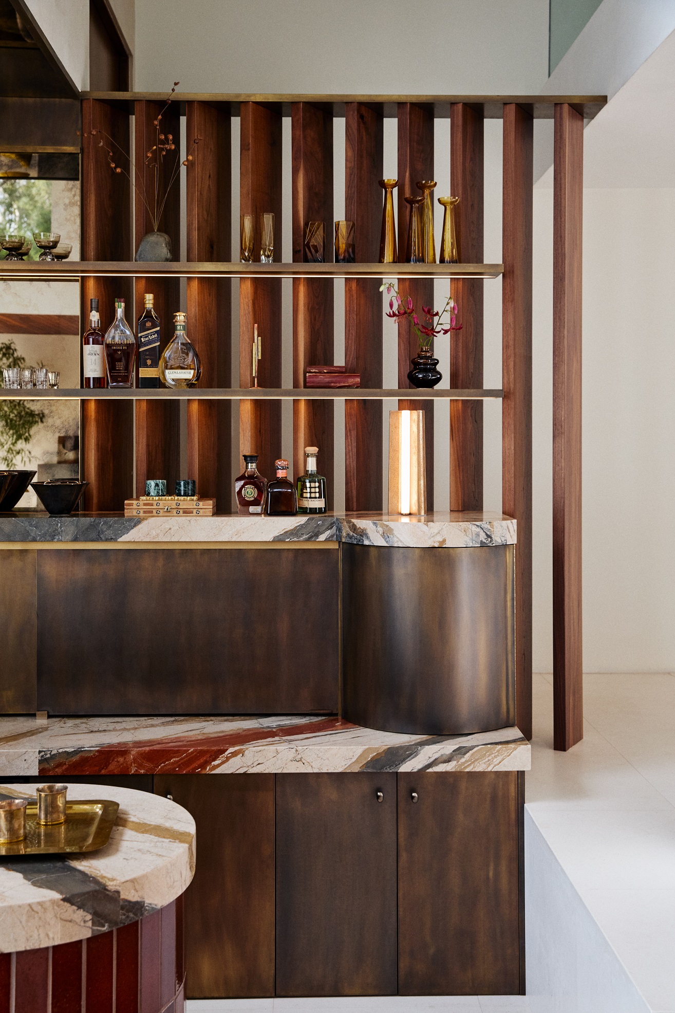 Pojawił się pełnoprawny aneks kuchenny – blat z wyrazistego marmuru Breccia, zabudowa w mosiężnym wykończeniu, lustro o patynowanej powierzchni i ciemna, nastrojowa okładzina. Projektantka dodała też obniżony stopień i zestaw hokerów. Jak podkreśla właścicielka pracowni Alana Marie Interiors, miało to wprowadzić bardziej domowy charakter podczas spotkań.