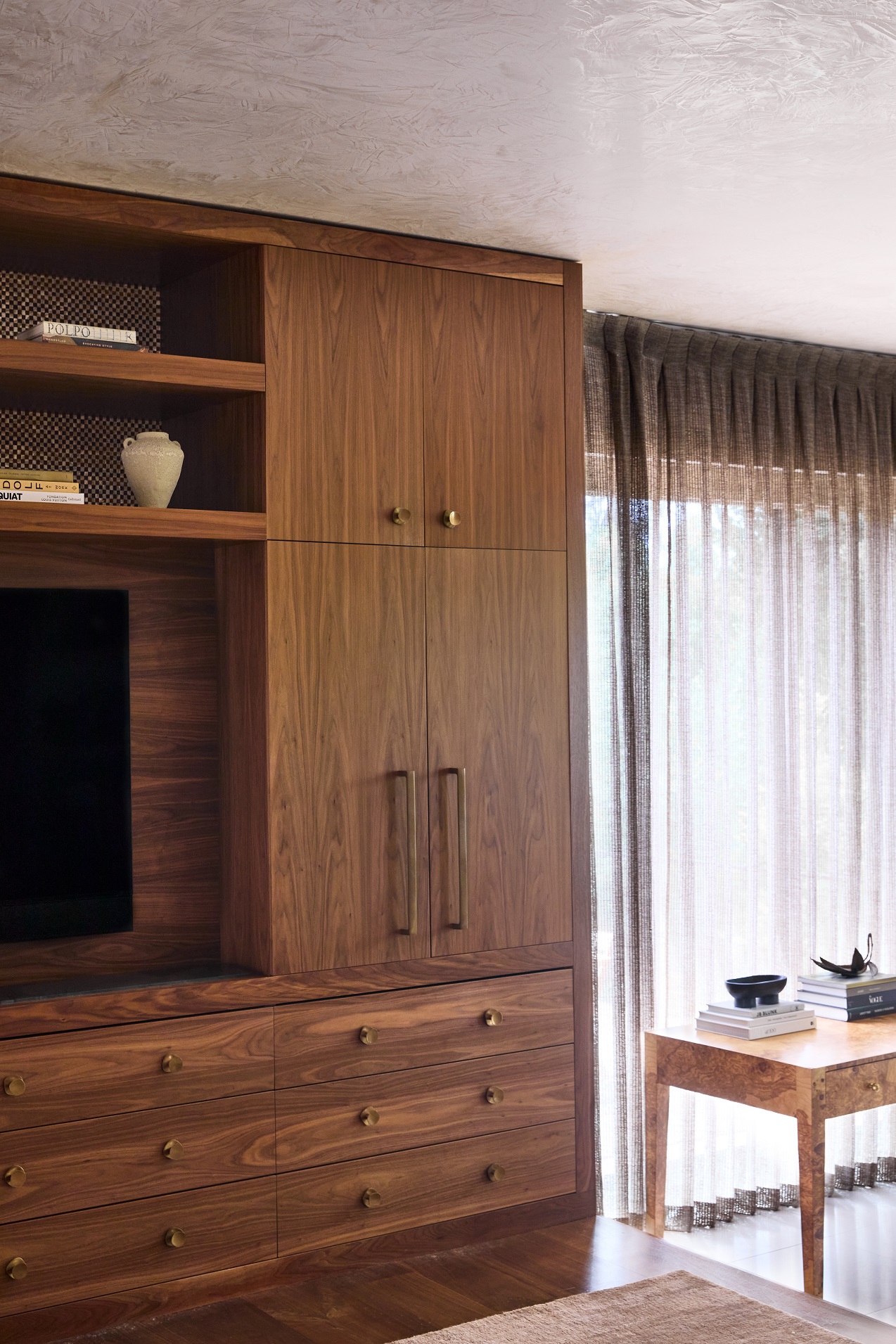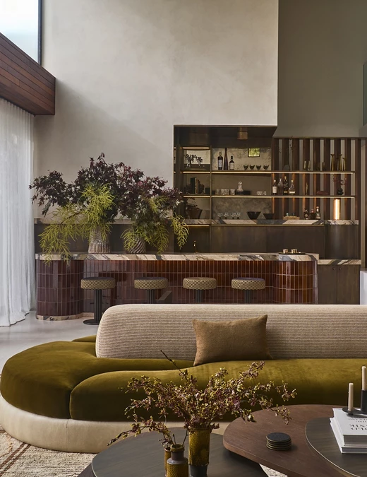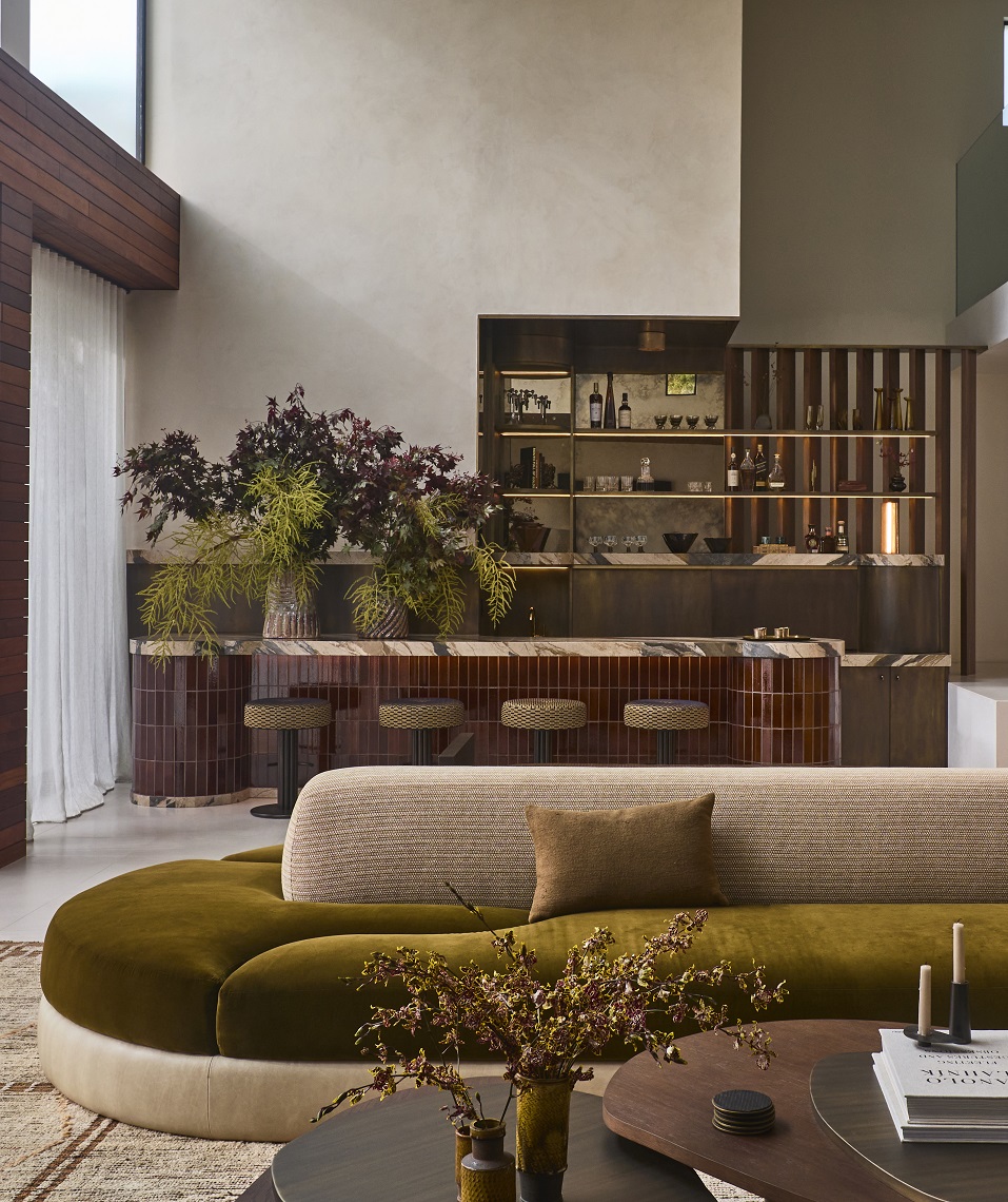 Równolegle Alana Marie przeprojektowała salon, bo wcześniejszy układ był zbyt formalny i mało praktyczny. Dwie sofy ustawione naprzeciw siebie oraz wąski stolik kawowy ograniczały wygodę korzystania z telewizora i odcinały część wypoczynkową od baru. Rozwiązaniem stała się sofa dwustronna zaprojektowana na zamówienie, która tworzy dwa powiązane, ale niezależne obszary. Dodatkowo pojawił się pleciony skórzany szezlong – element, który wyznacza granicę między barem a salonem.
