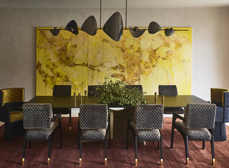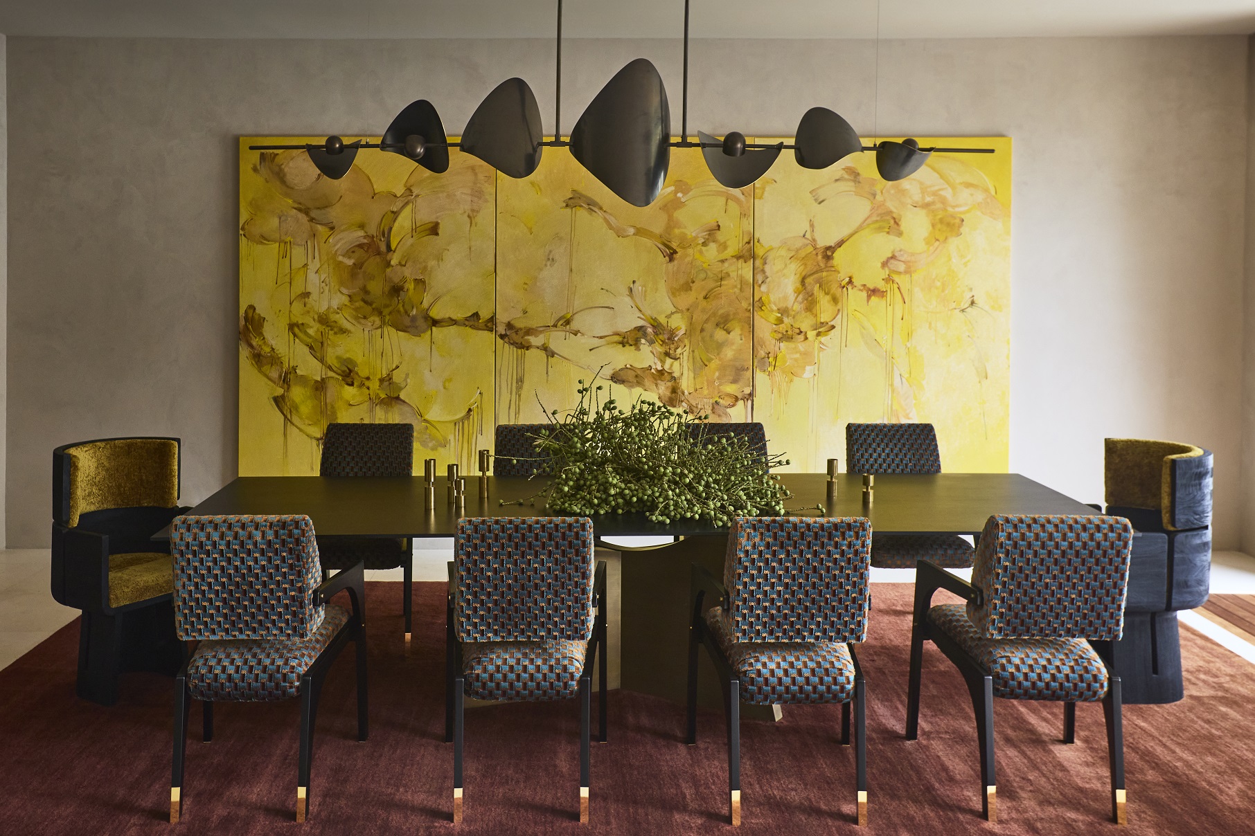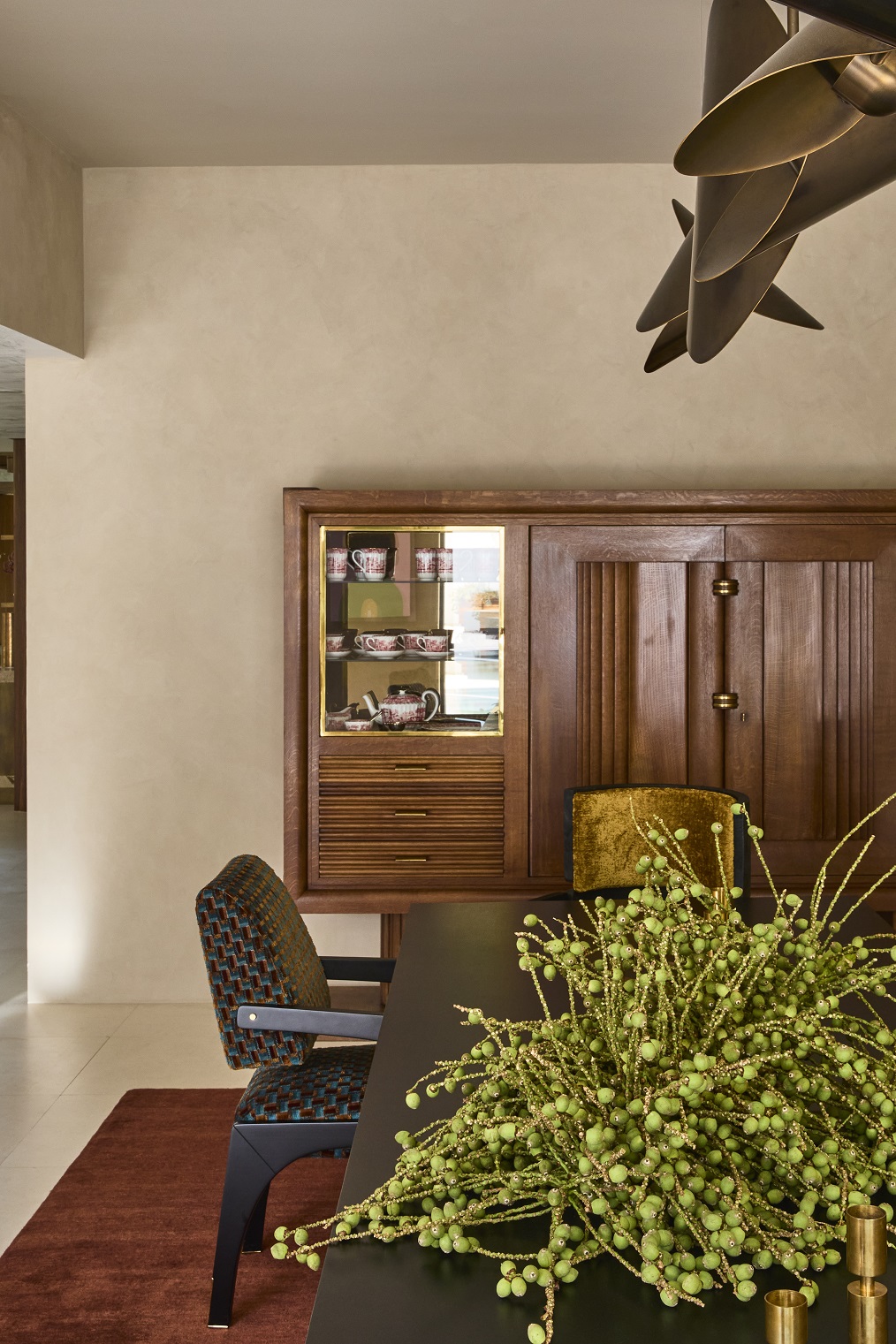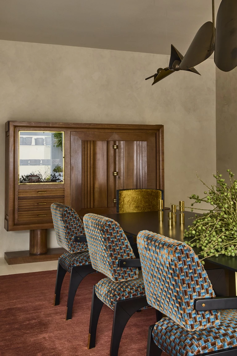 W jadalni projekt stawia na skalę i wyraziste akcenty. Elementy vintage połączone zostały ze współczesnymi – jednym z kluczowych obiektów jest kredens z lat 30., który równoważy nowsze komponenty. Pojawiły się też wyraźniejsze oświetlenie, tkaniny i sztuka.