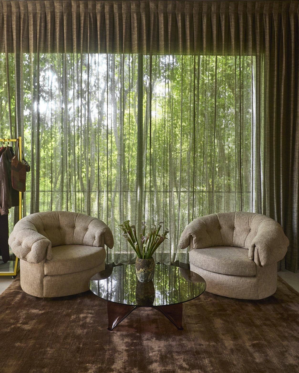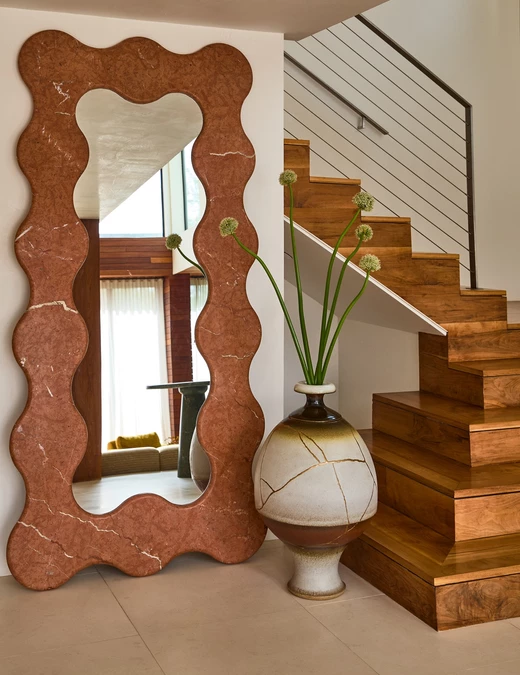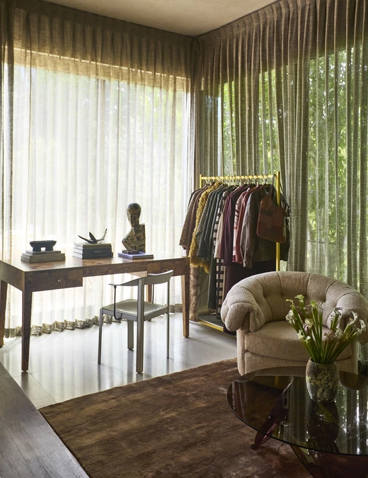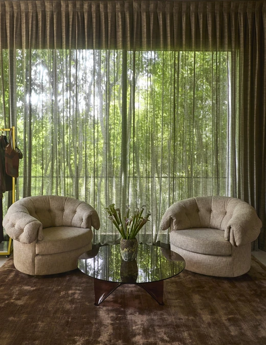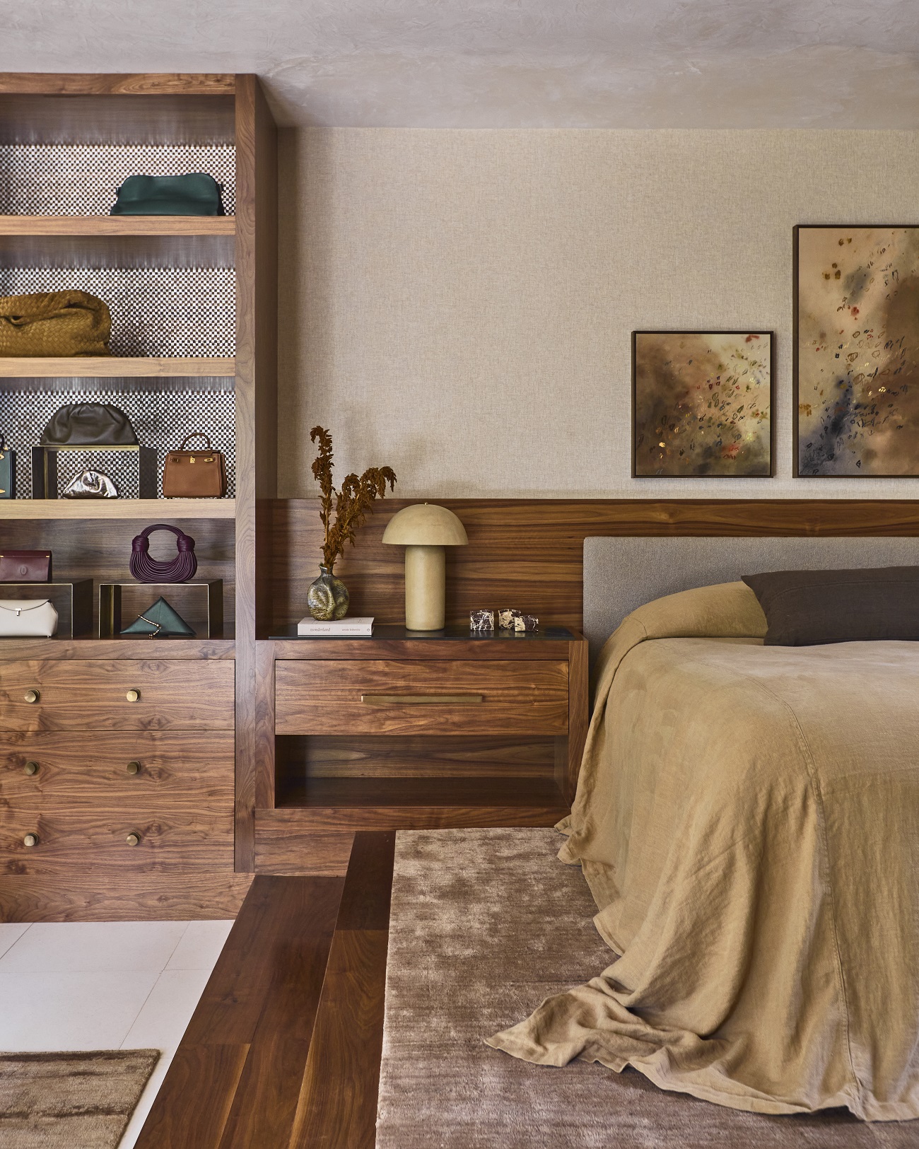 Całość spina konsekwentny dobór materiałów i wykończeń. W zabudowach pojawia się orzech, by utrzymać ciągłość z elementami już obecnymi w domu, marmur Breccia kontrastuje z jasną kamienną posadzką, a aksamit w oliwkowym odcieniu wnosi miękkość i głębię.