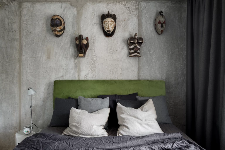 Najbardziej efektownym pomieszczeniem jest sypialnia. Niewielkie pomieszczenie zostało powiększone poprzez zastosowanie zabudowy z lustrami na ścianie naprzeciwko łóżka, dzięki temu zabiegowi potęguje się efekt surowego betonu. W centrum zielone welurowe łóżko kontynentalne, które jest jedynym akcentem kolorystycznym w mieszkaniu a nad nim Afrykańskie maski, które inwestor przywiózł kilka lat temu z Kapsztadu RPA.