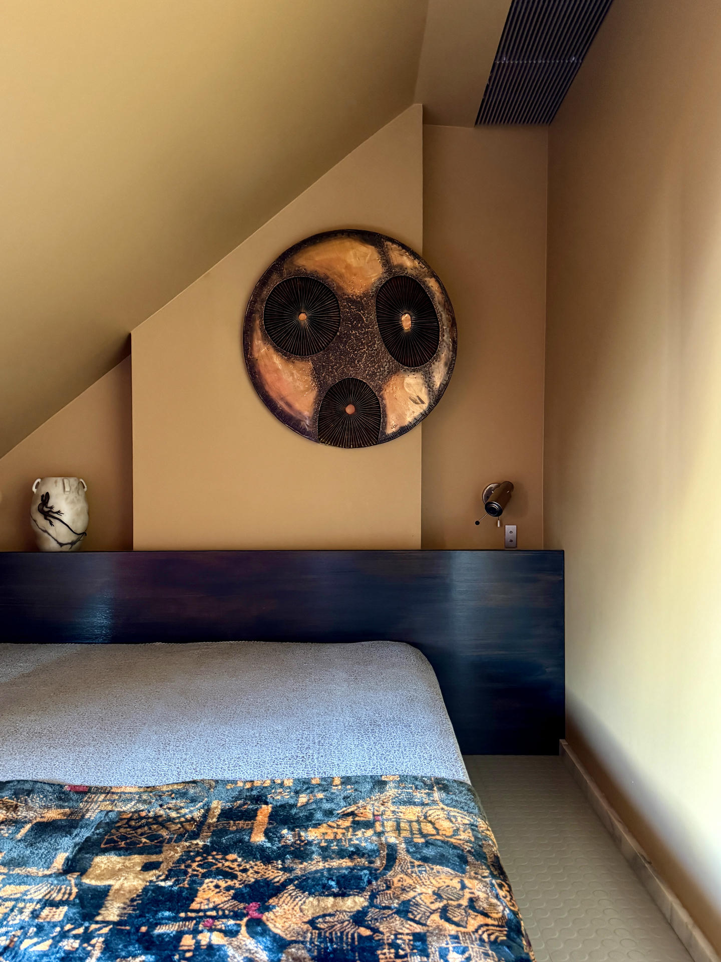 Z kolei sypialnia jest najbardziej zmysłowa i to bambus kształtuje jej atmosferę. Za łóżkiem panel z opalanego bambusa zestawiono z kolekcją luster o organicznych i geometrycznych formach. Nawet uchwyty szafy zostały wyrzeźbione z przypalonego korzenia bambusa. Samo łóżko wykończono tkaniną z motywem zwierzęcym i jest to jeden z niewielu bardziej wyrazistych akcentów w tej spokojnej przestrzeni.
