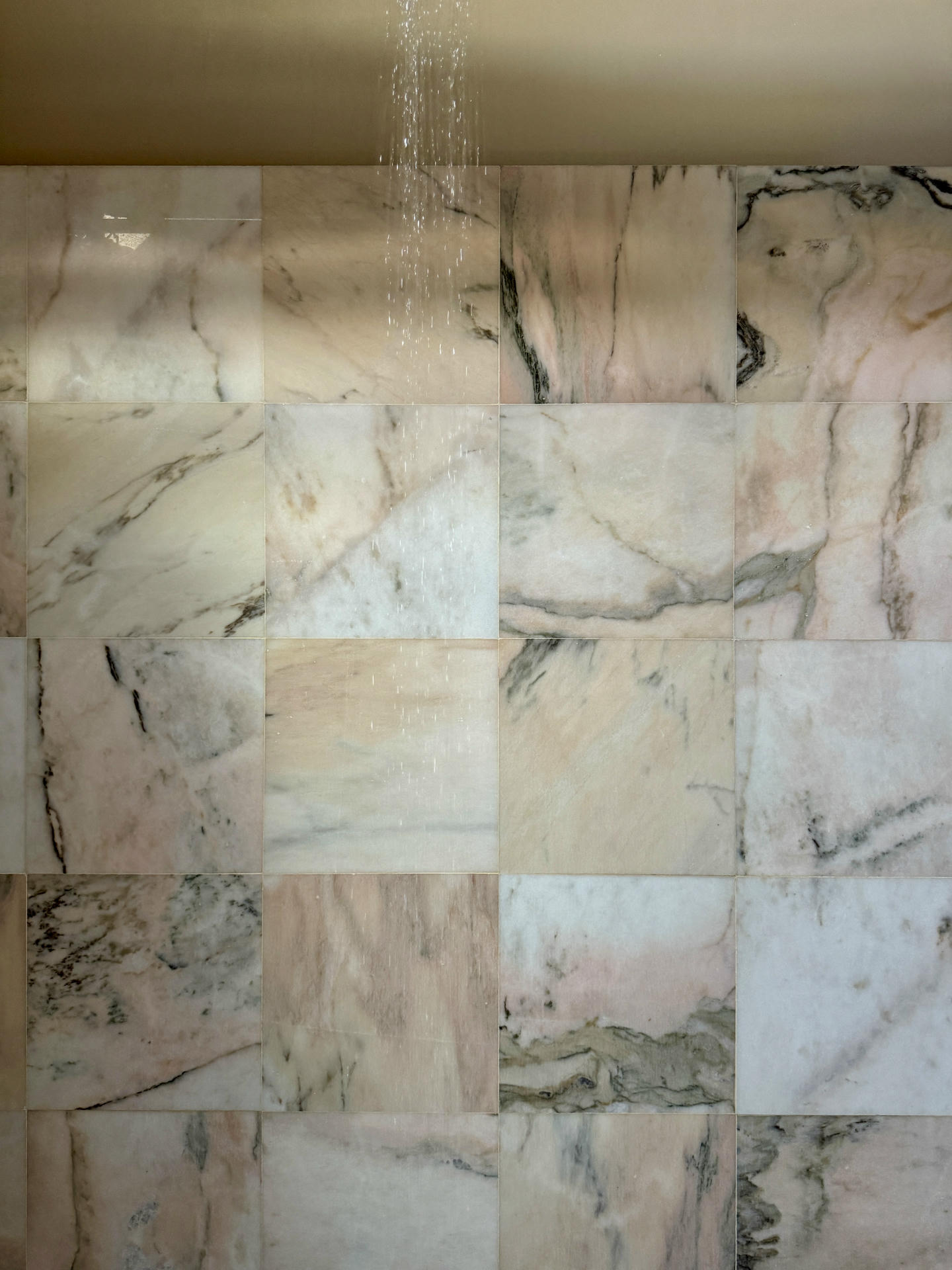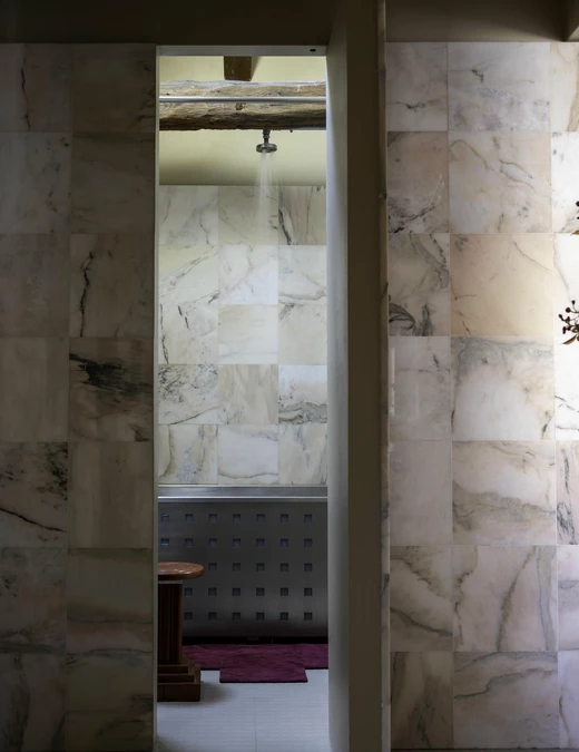 Łazienka kontynuuje wątki obecne w całym mieszkaniu. Pojawia się tu ten sam różowy marmur, stal i geometryczne motywy. Istotną rolę odgrywa światło – zarówno naturalne, wpadające przez świetlik, jak i sztuczne, wbudowane w elementy wyposażenia. Stalowa wanna została zaprojektowana na zamówienie i potraktowano ją niczym rzeźbę. Na podłodze pojawia się jeszcze jeden mocny element, jakim jest geometryczny dywan, zestawiony z baskijskim stołkiem o ciemnej, niemal czarnej czerwieni.
