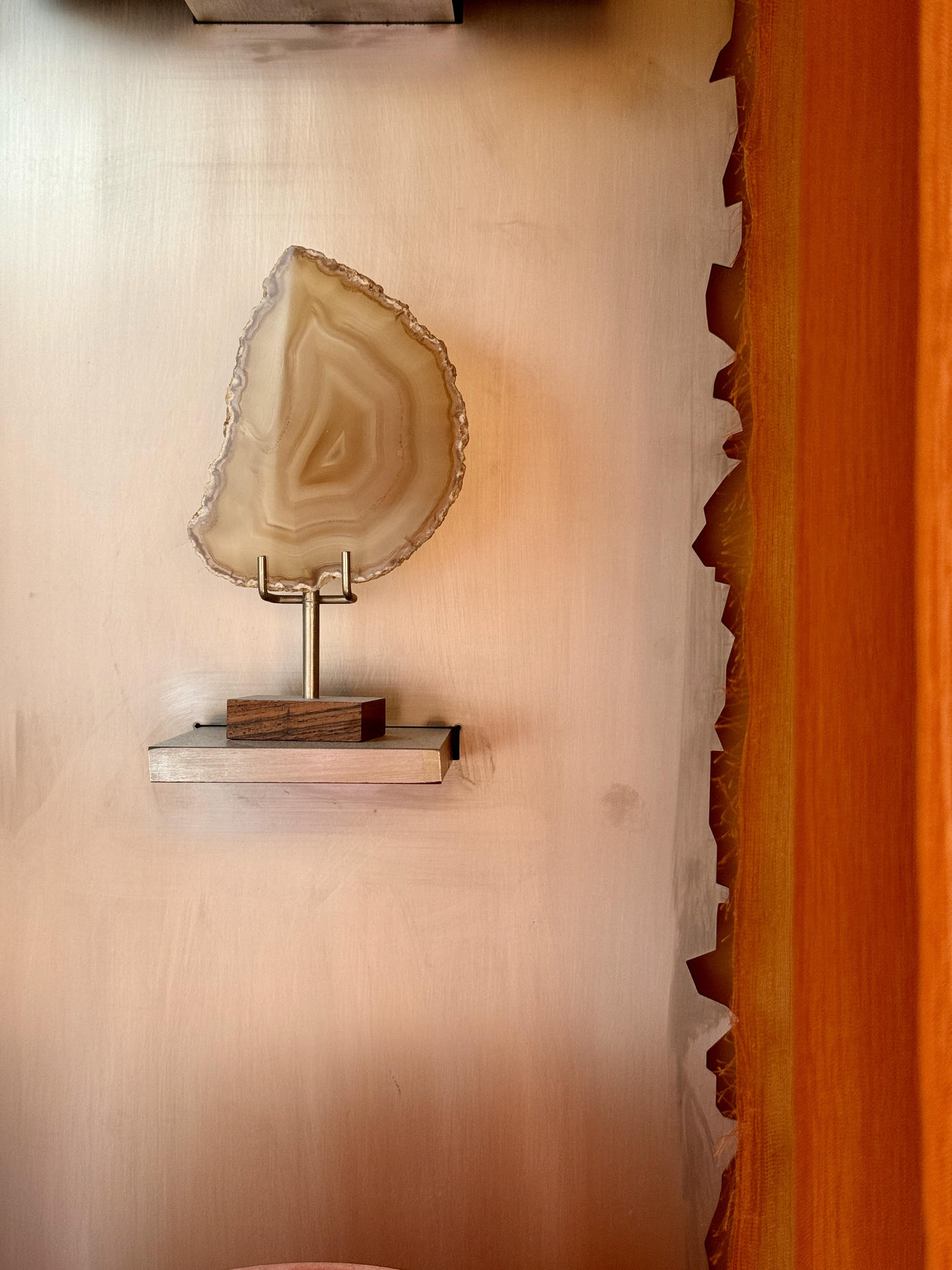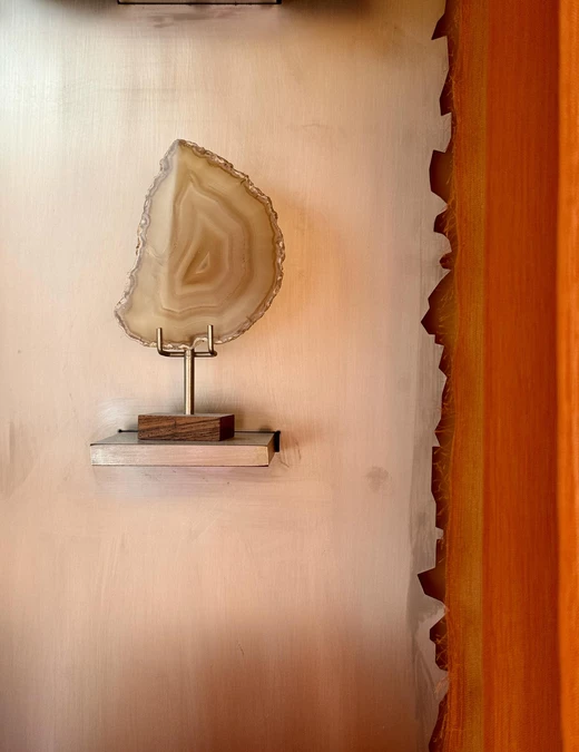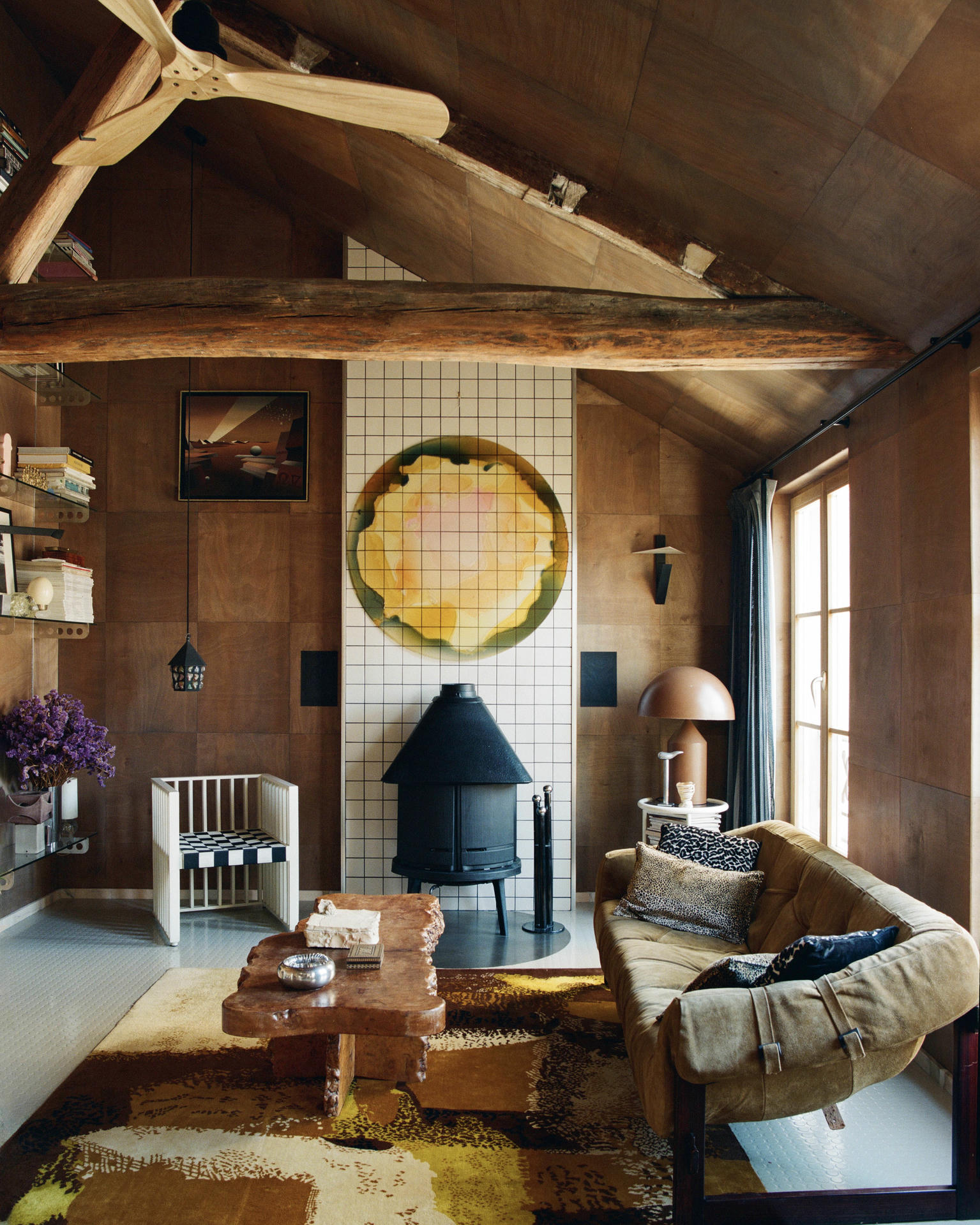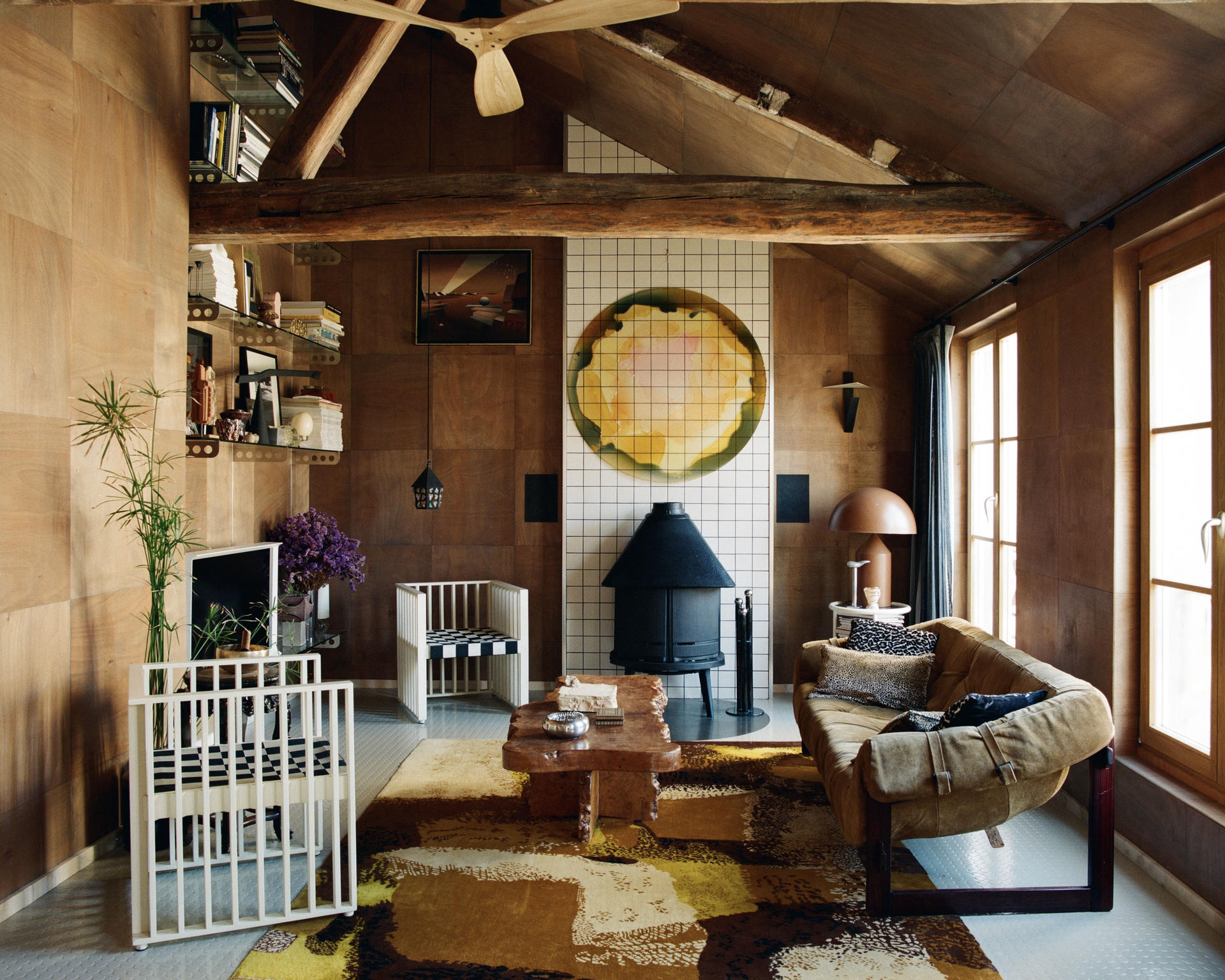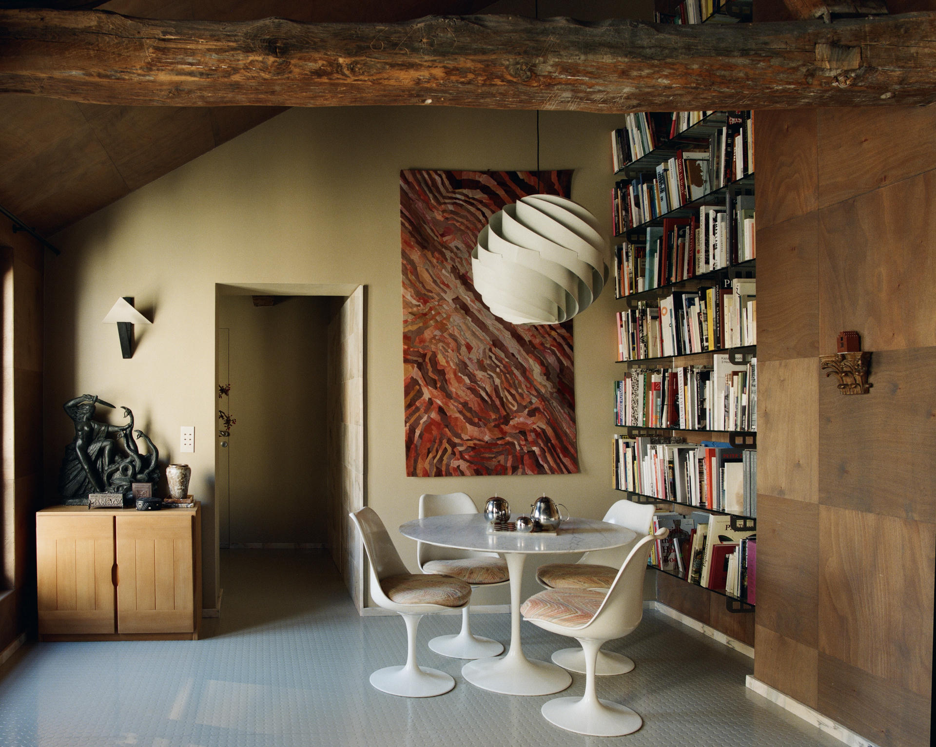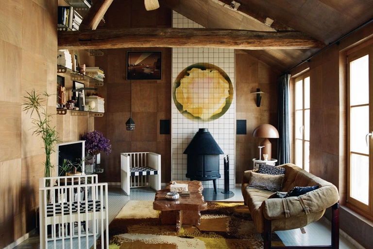 Wyposażenie buduje dialog między epokami: są tu secesyjne fotele Mosera, sofa MP-091 Percivala Lafera z lat 60. oraz stolik z wiązu, na którym ustawiono m.in. ceramikę Pierre’a Baye’a. Na ścianie pojawia się mural Gaetana Pescego, a na konsoli – jego wazon Red Fish obok lampy Atollo Vica Magistrettiego i korkociągu Philippe’a Starcka. Całość dopełniają abstrakcyjny dywan Maurice’a André oraz regał z wyselekcjonowanymi obiektami, wśród których znajduje się wazon Mario Botty.