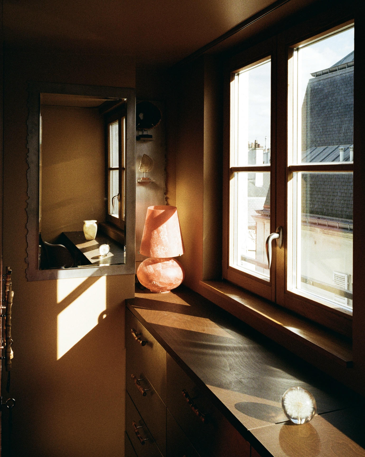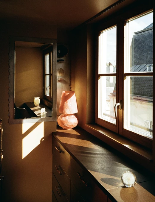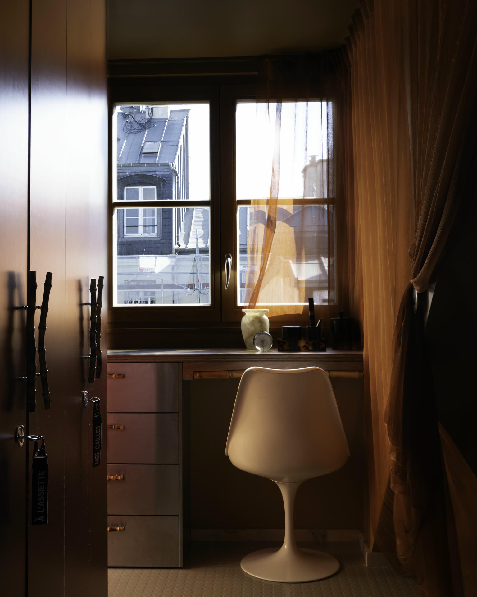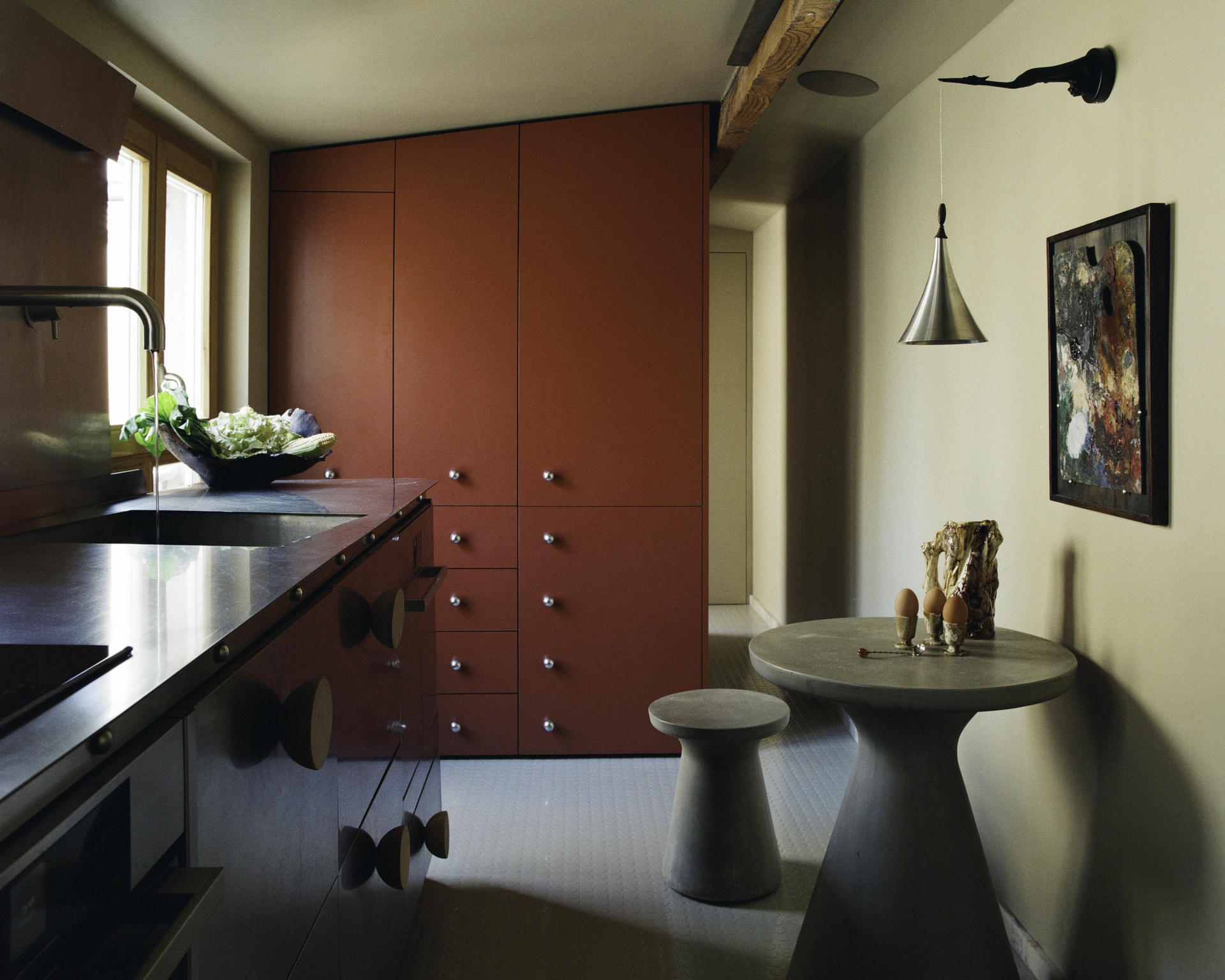 Niska stalowa szafka łapie południowe światło i płynnie przechodzi w biurko. Zabudowa w głębokiej czerwieni dodaje wnętrzu intymności, a zasłony z bawełnianej krepy rozpraszają światło tak, że staje się ono przyjemnie miękkie. Na blacie biurka stoi prosty zestaw: alabastrowy wazon i lampa Murano, a naprzeciw łóżka pojawia się bardziej rzeźbiarski akcent – lampa Marca D’Haenensa z lat 60.