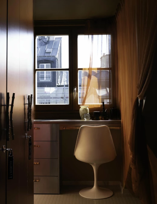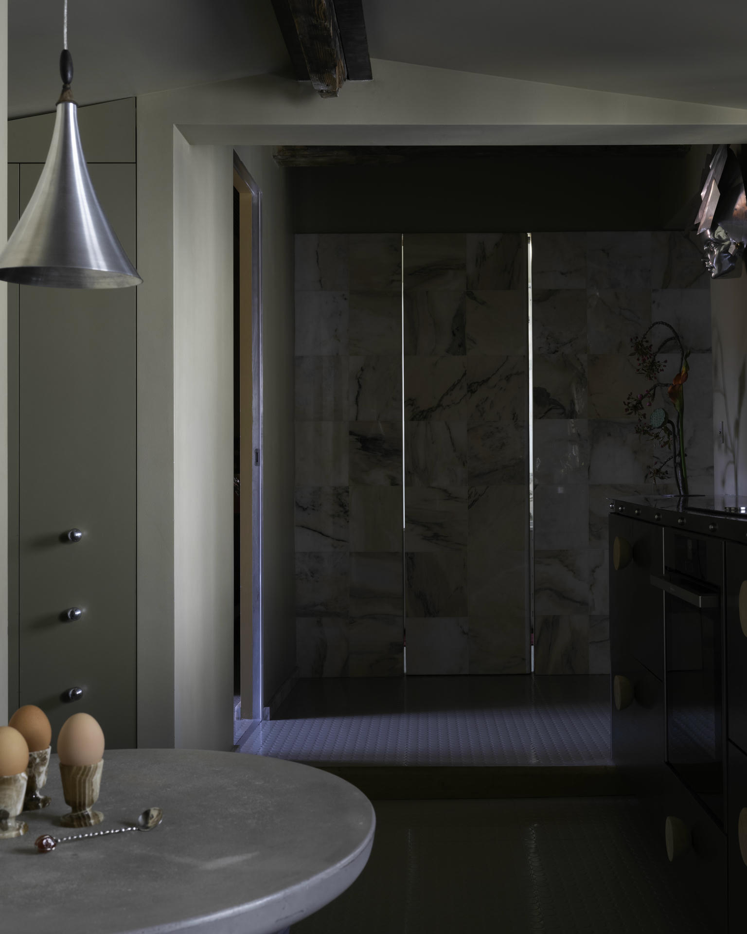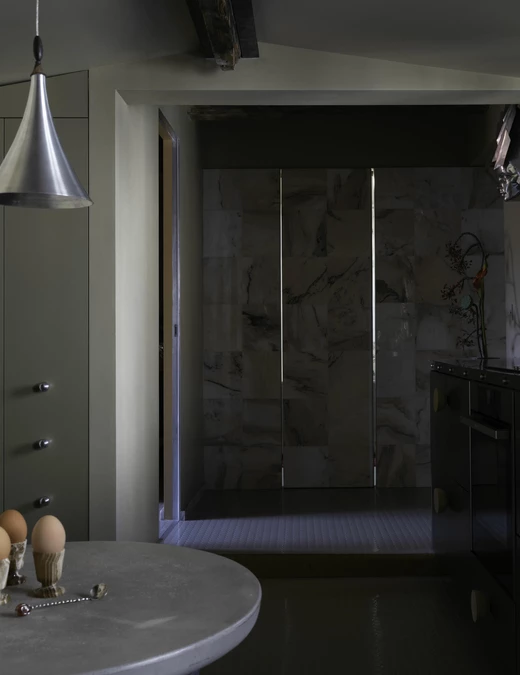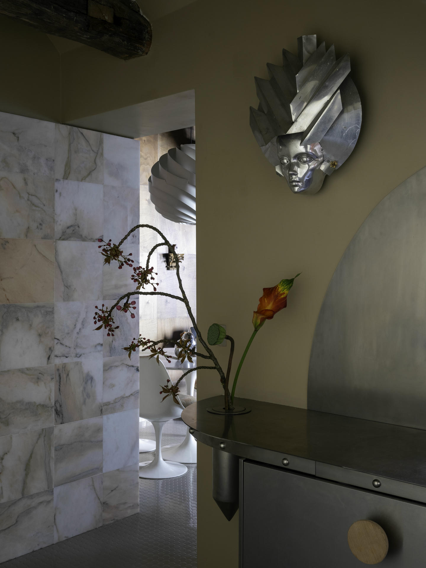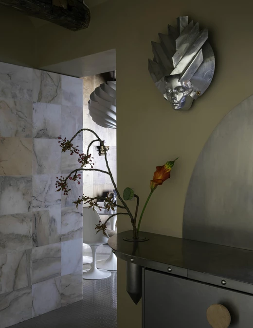 To przestrzeń użytkowa, ale zaprojektowana tak, by użytkownicy mogli cieszyć się w niej codziennymi rytuałami: zawisła tu futurystyczna lampa ścienna zaprojektowana w latach 70. dla Lido, wazon na świeże kwiaty wbudowano w blat, na ścianie wzrok przyciąga obraz, a tuż obok stanął betonowy stół o rzeźbiarskiej formie. Żyrandol w kształcie ptaka autorstwa Léona Artusa, wykonany z patynowanego brązu, rozpościera się nad wnętrzem.