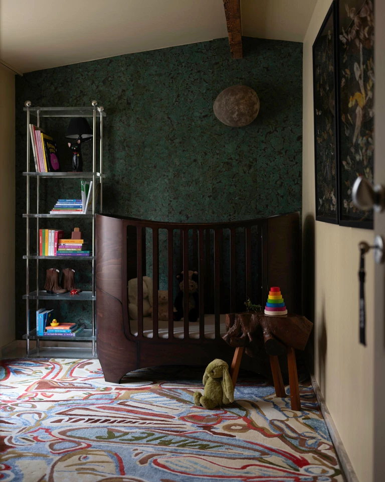 Pokój dziecka ma zupełnie inny charakter. Został zaprojektowany jak mała chatka – z obniżonym, spadzistym sufitem i miękkimi, ciepłymi materiałami. Korek, drewno i tekstylia tworzą bezpieczne, spokojne otoczenie.