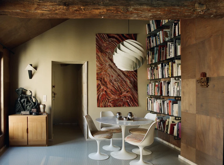 Jadalnia rozciąga się na północ od atelier jako naturalne przedłużenie salonu. Prowadzi do niej przejście wyłożone portugalskim różowym marmurem. W dwukondygnacyjnym wnętrzu uwagę przyciąga skórzana intarsja Roberta-Jeana Fabre’a datowana na 1998 r. Centralnym punktem jest stół i zestaw krzeseł Eero Saarinena, obitych tkaniną Missoni – rodzinny mebel, który do dziś pozostaje w użyciu. Obok, w zaprojektowanym na zamówienie regale ze szkła i stali, zgromadzono kolekcję książek architektonicznych.