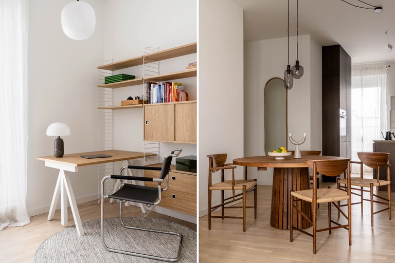 W gabinecie jedną ze ścian zabudowano słynnym regałem szwedzkiej marki String. Lekki, ażurowy stelaż wypełniają drewniane półki i szafki. Przy biurku stanęło zaś krzesło o bauhausowej sylwetce ramy z giętej, chromowanej rurki.