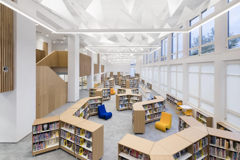 Ta innowacyjna przestrzeń do nauczania zorientowanego na projekty powstała w Pradze. Jej architekci (Studio Perspektiv) zadbali o to, aby architektura tworzyła tu przyjazne ramy dla dialogu dzieci z książkami i nauką.