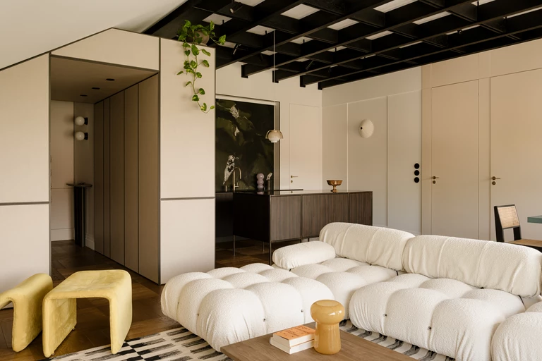 Mieszkanie, zlokalizowane na ostatnim piętrze budynku w Krakowie, jest przestronne i pełne naturalnego światła. Jego otwarty układ wymagał znacznej ingerencji, która nadałaby mu wyrazistą strukturę i wydzieliłaby funkcjonalne strefy.