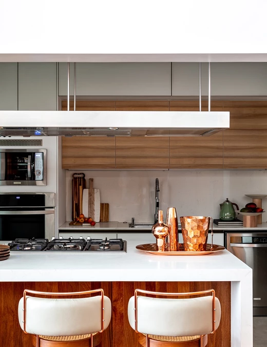 Jednak o charakterze mieszkania decyduje nie tylko drewno. W przypadku doboru dodatków i elementów dekoracyjnych Revollo zdecydował się na ryzyko. Projektant postawił na podkreślenie nie tylko ziemistych odcieni w tkaninach, ale również wprowadził miedziane akcenty i dodał do palety barw intensywny niebieski, który rewelacyjnie prezentuje się na ogromnym dywanie położonym w salonie i jednocześnie stanowi dobry kontrast dla białych ścian.