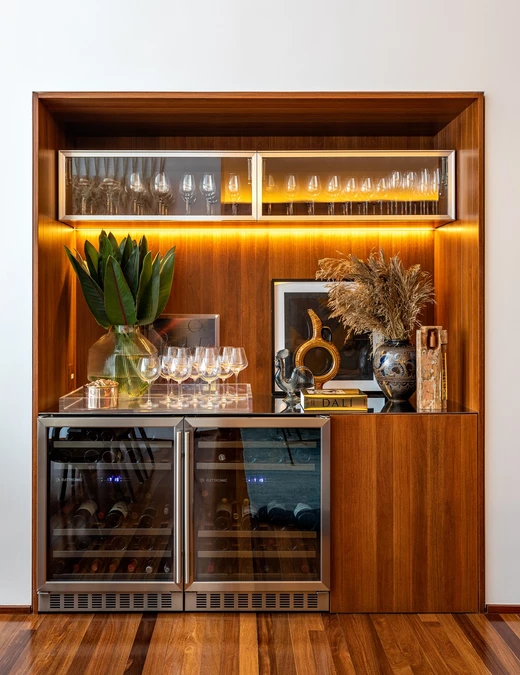 To, co z pozoru mogłoby stać się niepotrzebnym naddatkiem, w przypadku tego projektu wręcz staje się przyjemne dla oczu. Dalej, w pozostałych pomieszczeniach mieszkania delikatne odcienie błękitu mieszają się z szarościami i beżami, dobrze korespondując z intensywnym odcieniem drewna Cumaru.