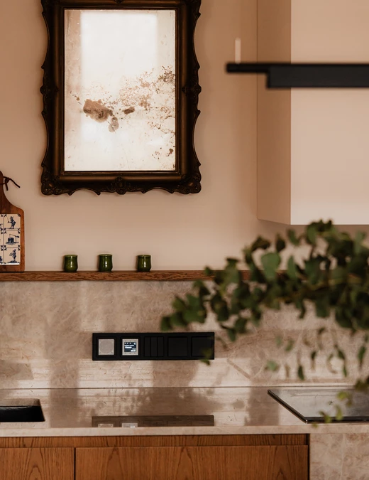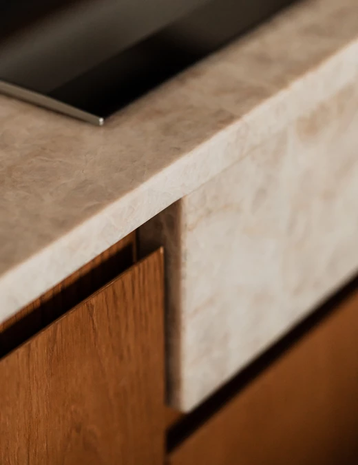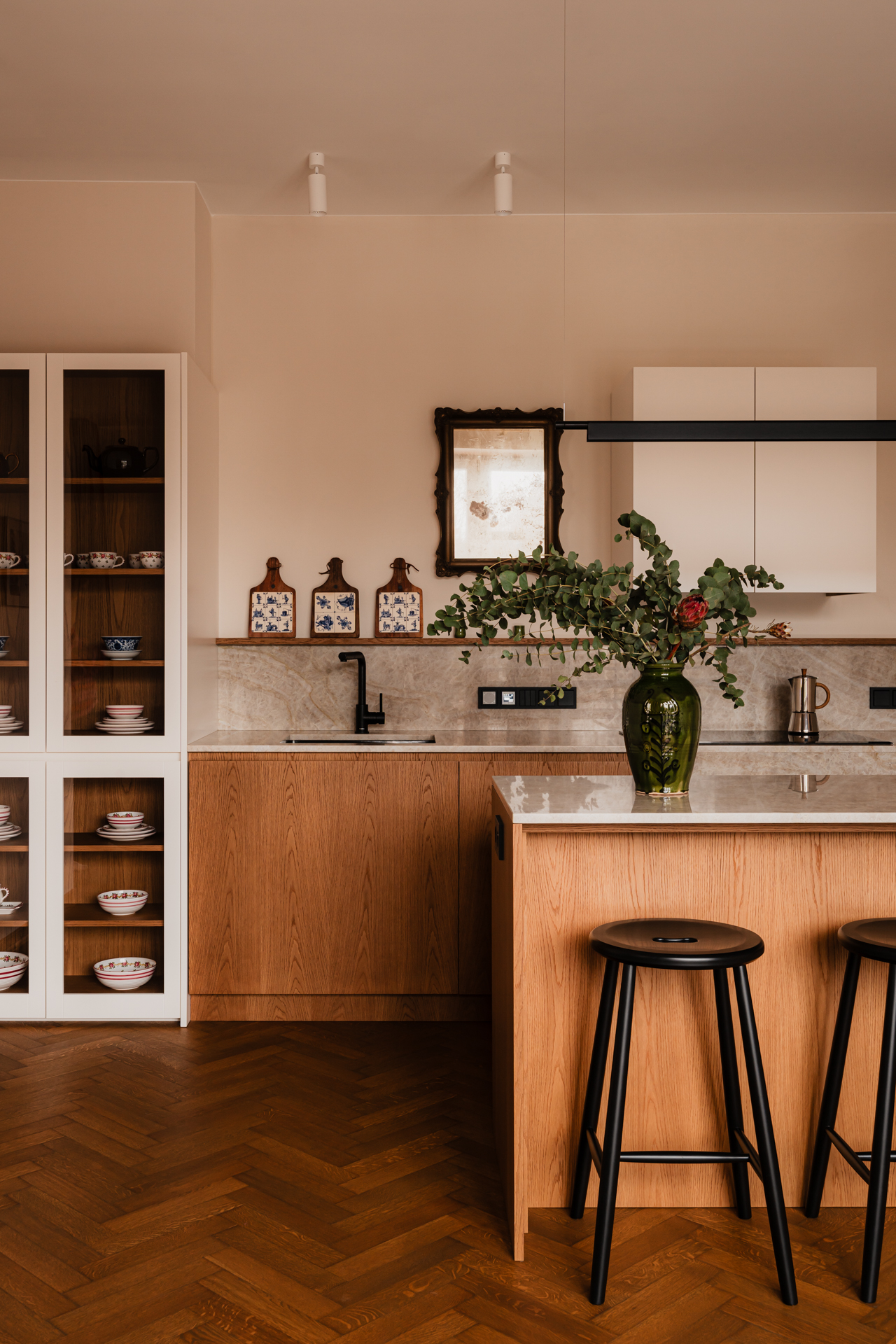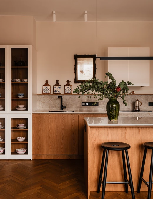 W kontraście do dekoracyjnej jadalni kuchnia zaprojektowana została w znacznie spokojniejszym, uproszczonym charakterze. Blat z kwarcytu Taj Mahal łączy ciepłą szarość z piaskowym beżem, harmonizując zarówno z historycznymi, jak i współczesnymi elementami.
