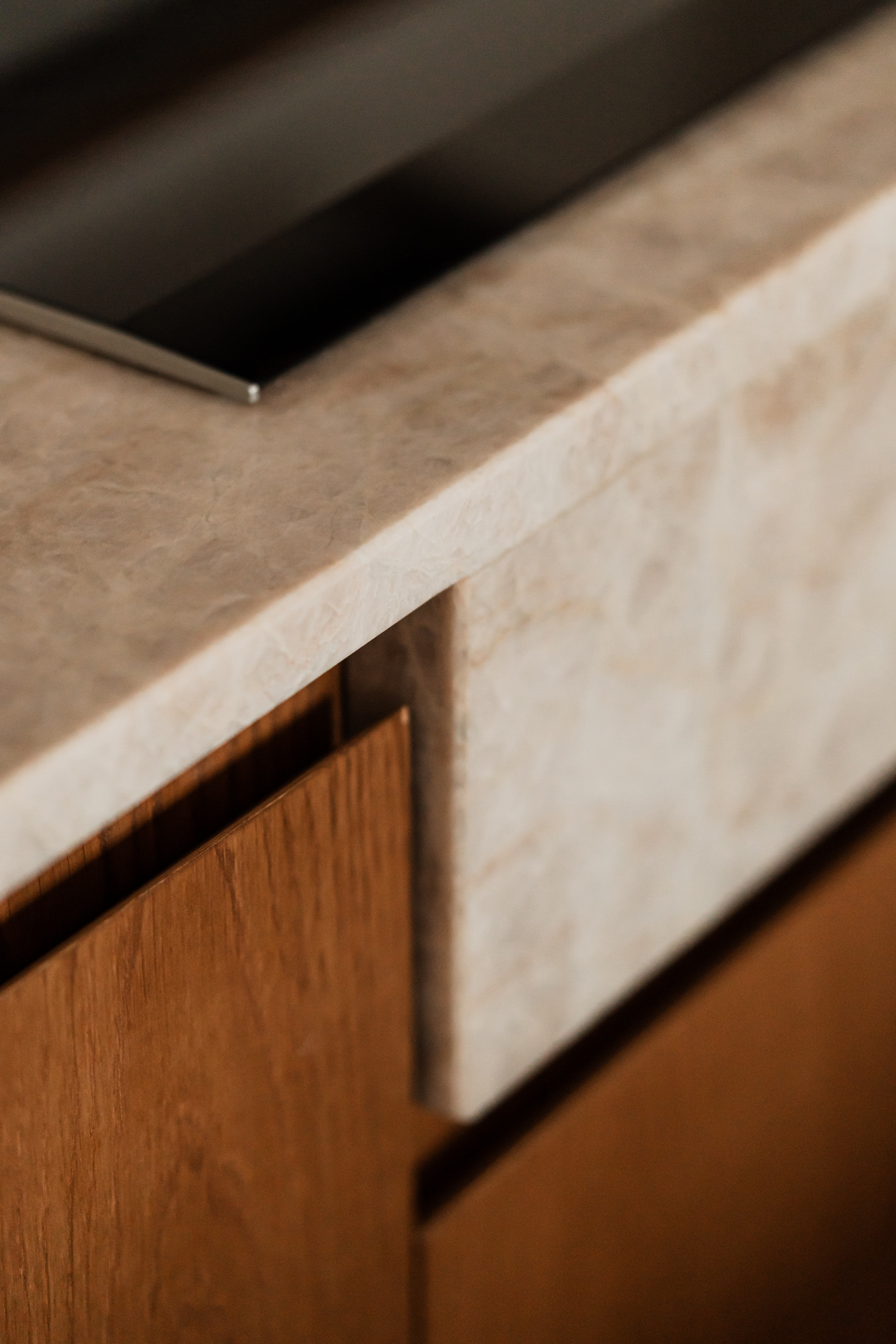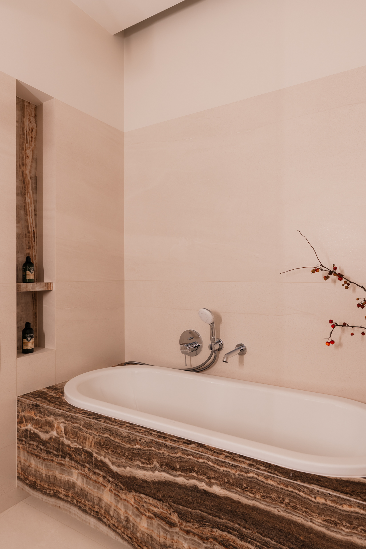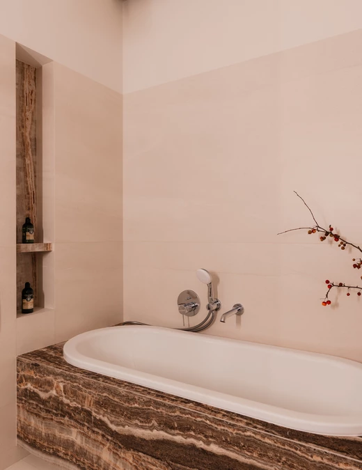 Łazienka przylegająca do głównej sypialni – dostępna wyłącznie przez garderobę – buduje nastrój dzięki kontrastowi dynamicznego onyksu i kojącego bazaltu. Także tutaj ważnym akcentem jest sztuka – grafika z prywatnej kolekcji właścicieli.