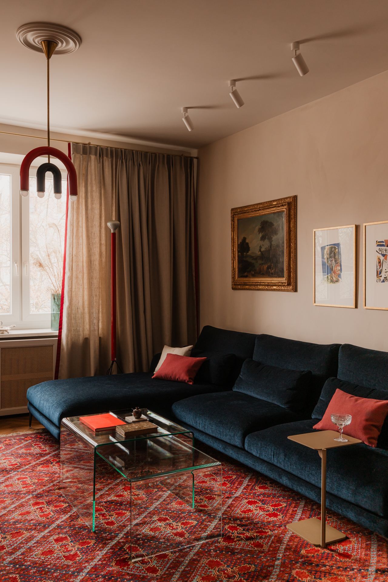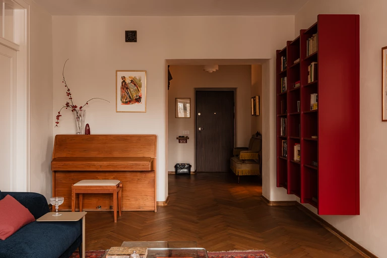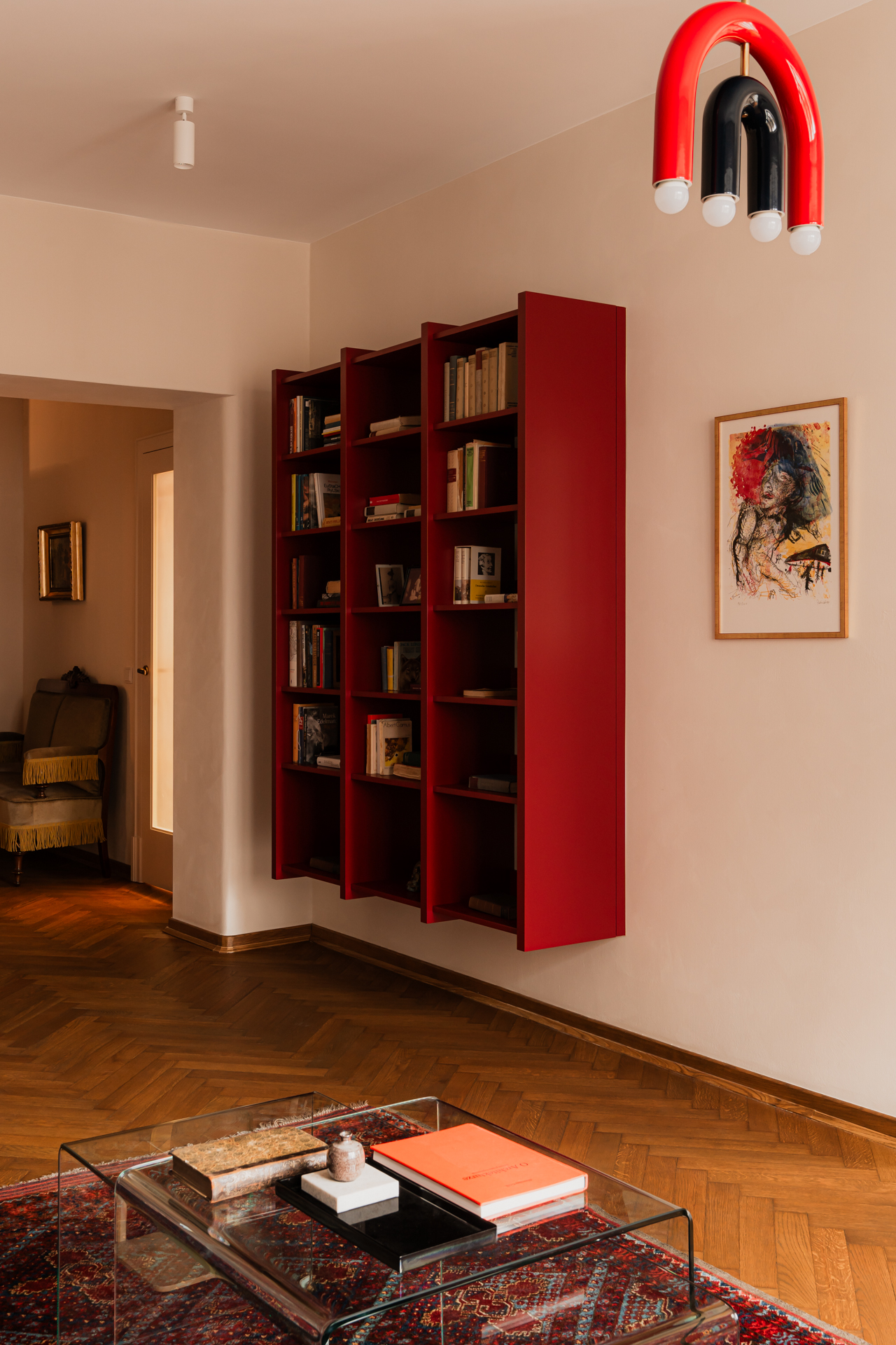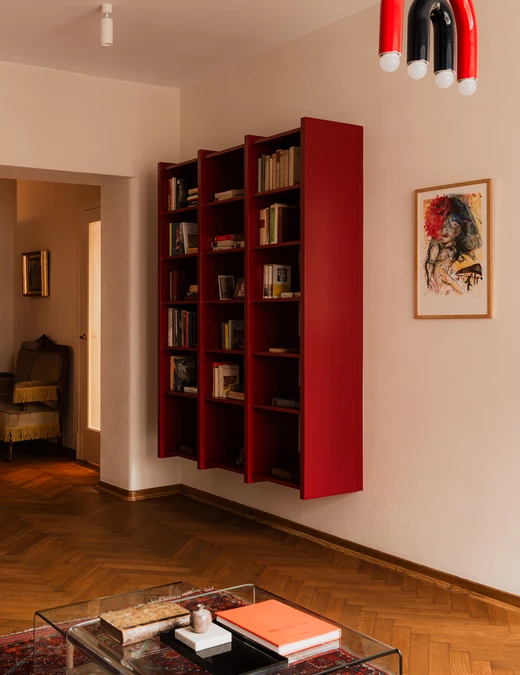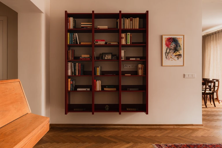 Salon to kolejne pole dialogu epok. Jedwabny perski dywan spotyka się tu z nowoczesnym, burgundowym regałem wiszącym o wyrazistym rytmie podziałów.