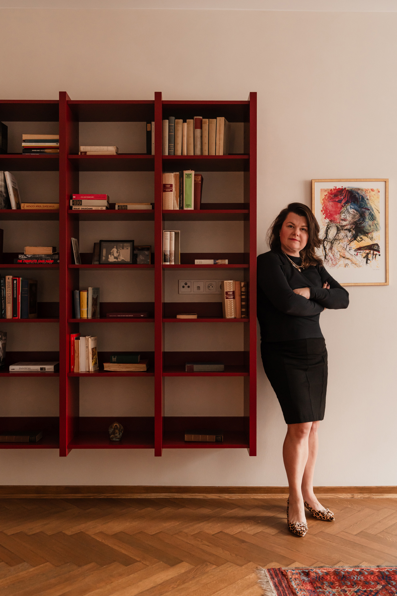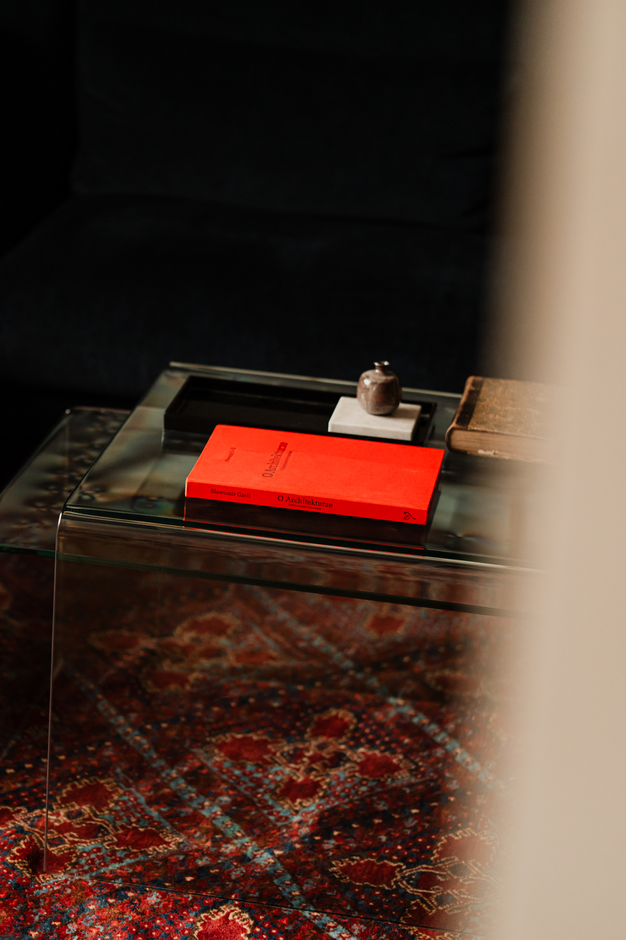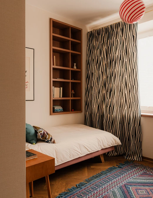 Salon to kolejne pole dialogu epok. Jedwabny perski dywan spotyka się tu z nowoczesnym, burgundowym regałem wiszącym o wyrazistym rytmie podziałów.