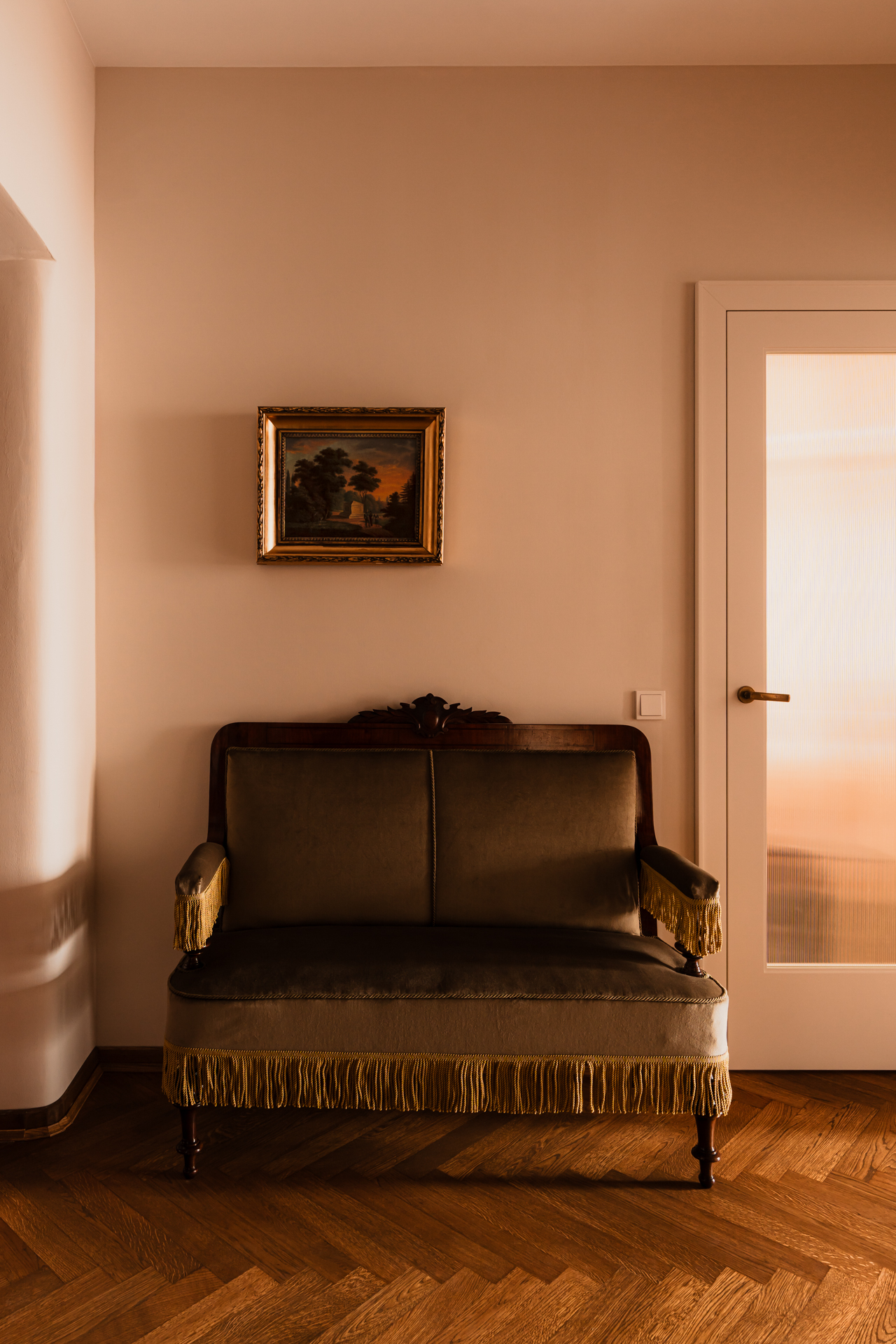 Koncepcja projektowa oparła się na dialogu pomiędzy historią budynku a sztuką, designem i nowoczesnością. Historia mówi tu językiem detali: pojawia się w mosiężnych klamkach, klasycznej dębowej jodełce czy w oryginalnych okuciach kratek wentylacyjnych. Drugi głos w tym dialogu wybrzmiewa poprzez radość obcowania ze sztuką, książką i wyrazistym designem. Połączenie tych idei stało się punktem wyjścia do zmian funkcjonalnych.