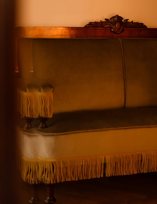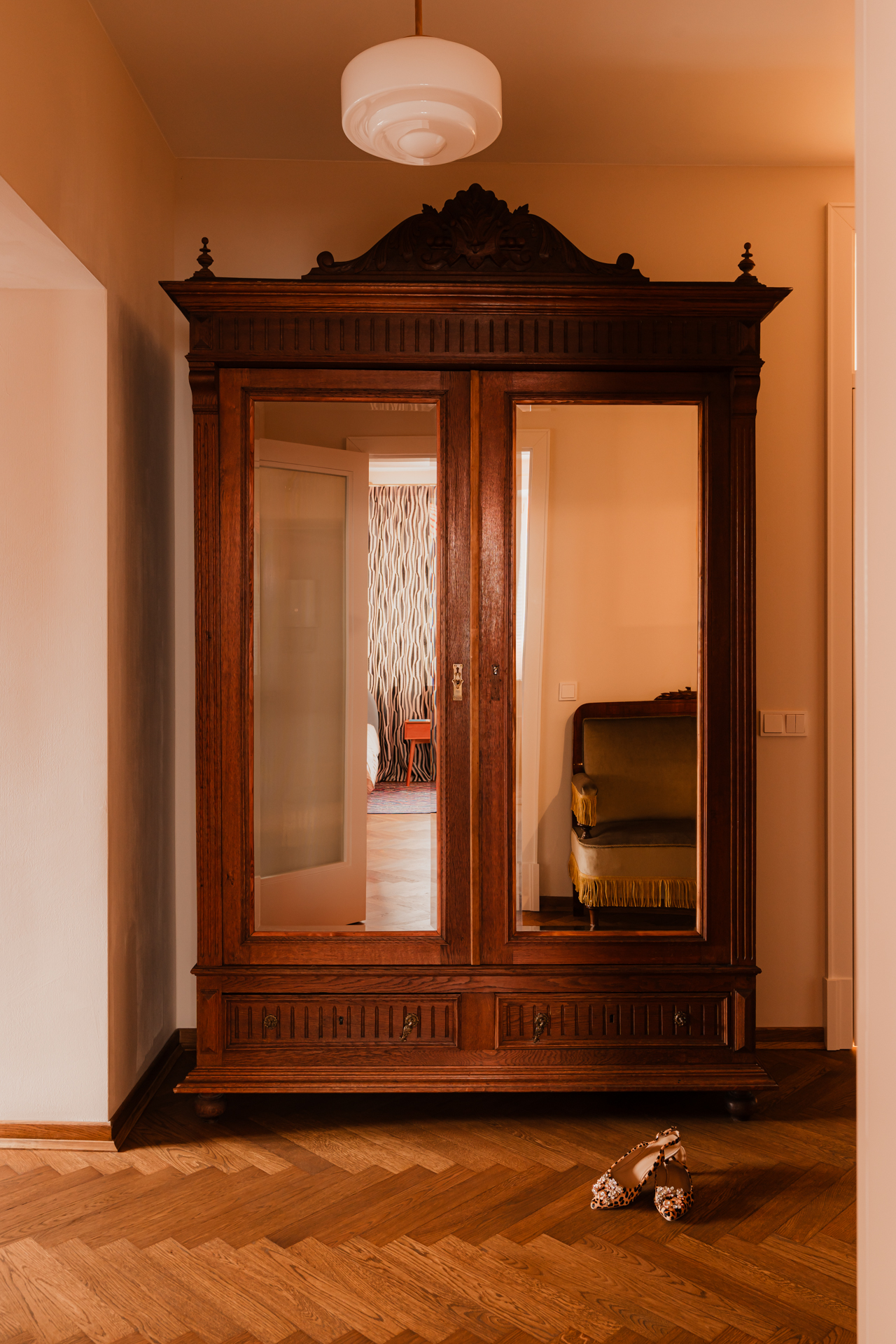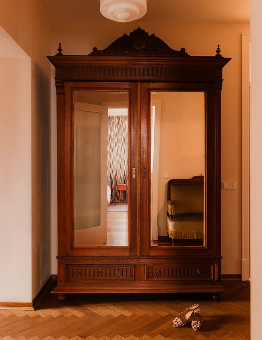 Hall wejściowy, choć zmniejszony względem pierwotnych rozmiarów, nadal efektownie eksponuje dwa historyczne meble: sofkę oraz solidną szafę z lustrzanym frontem. Całość uzupełnia dyskretna półka na klucze i listy.